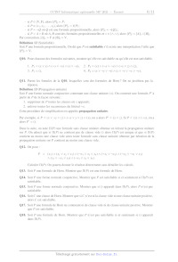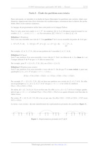 aucun quadruplet (a, b, c, d) EUR {2,4,5,7,8, 9) tel que a < b < c < d'ne vérifie la condition Cl(a) = CI(c), CI(b) = Cd). De même, Q = {{2,7,8,9}, {4,5}} en est bien une. En effet, (a, b, c,d) = (2, 7,8, 9) est l'unique quadru- plet tel que a < b < c < d vériñant Cl(a) = CI(c), CI(D) = CI(d) et ces quatre éléments sont bien dans la même classe. Par contre, R = {{2,5},{4,7,9},{8}} n'en est pas une. En effet, CI(2) = CI(S) et CI(4) = CI(7) mais CI(2) 4 CI(4). Le terme « non croisée » découle naturellement des représentations picturales des partitions (figure 1). Figure 1 - Représentations picturales de P, Q,R 2/11 Dans la suite, on s'intéresse uniquement aux partitions d'un sous-ensemble fini de N. On les représente en Python à l'aide de listes de listes croissantes d'entiers triées dans l'ordre lexicographique. Par exemple, les partitions P = {{2,4,5},{7,9},{8}} et R = {{2,5},{4,7,9},{8}} sont respectivement représentées par les listes P = [[2,4,5],[7,91,[8]]etR = [[2,5],[4,7,91,[8]1]. L.1 - Exemples et fonctions élémentaires (Informatique Pour Tous) Q1. Justifier brièvement que P = {{1,7},{2},{3,4,5},{6}} est une partition non croisée de [7] et que Q = {{1,6},{2},{3,4,5,7}} n'en est pas une. Q2. Parmi les ensembles suivants, indiquer sans justification lesquels sont des partitions de [5]. Parmi les partitions, préciser sans justification lesquelles sont non croisées. 1 P1 ={{1,3},{2,4,5}}, 2. P, = {1,3},{1,2},{4,5}}, 3. P3 = {{1,3}{2,4}}, 4, Pa = {1,4,5},{2,3}}. Q3. Décrire l'ensemble des partitions non croisées de [41]. Pour Q4, QS et Q6, on se fixe un ensemble fini À EUR N. Cet ensemble est représenté en Python par la liste croissante d'entiers À, définie au préalable. On suppose également que pour ces questions, la variable P désigne une liste de listes croissantes d'entiers triée dans l'ordre lexicographique. On définit la fonction Python mystere(P) par : def mystere(P) L = [False for _ in range(len(A))] for 1 in range(len(P)) If PI[1] == {| return False else for j] in range(len(Pf1l])) if P[i][j] not in A : return False else # A.index(a) renvoie l'indice de a dans A Kk = A.index(P[1][]l]) if LIKk] return False else LIKk] = True return not (False in [L) Q4. Uniquement dans cette question, on suppose que À = [1,2,3,4,5]. Expliciter sans justification les valeurs de : 1. mystere([[1,3],[1,5],[2,4]]) 2. mystere([[1,3,4],[2]1]) 3. mystere([[1,3,5],[2,4]1]) 4, mystere([[1,[1,2,3,4,5]]). Q5. Écrire une fonction Python classe(P,i) prenant en arguments une variable P représentant une partition Y de À et un entier i EUR À qui renvoie une liste L représentant CI(i). 3/11 On définit la fonction Python au code incomplet est_nc(P) suivante : def est _nc(P) # On rappelle que À est une liste triée dans l'ordre croissant N = Ilen(A) for 1 in range(N) for J in range(1+1l,N) for K in range(]j+1,N) for 1 in range(k+1,N) Q6. Recopier et compléter le code de la fonction est_nc(P), sachant qu'elle prend en argument une variable P représentant une partition P de À et qu'elle renvoie True s1 P est non croisée et False sinon. 1.2 - Nombre de partitions non croisées Pour tout n > 1, on note C, le nombre de partitions non croisées d'un ensemble