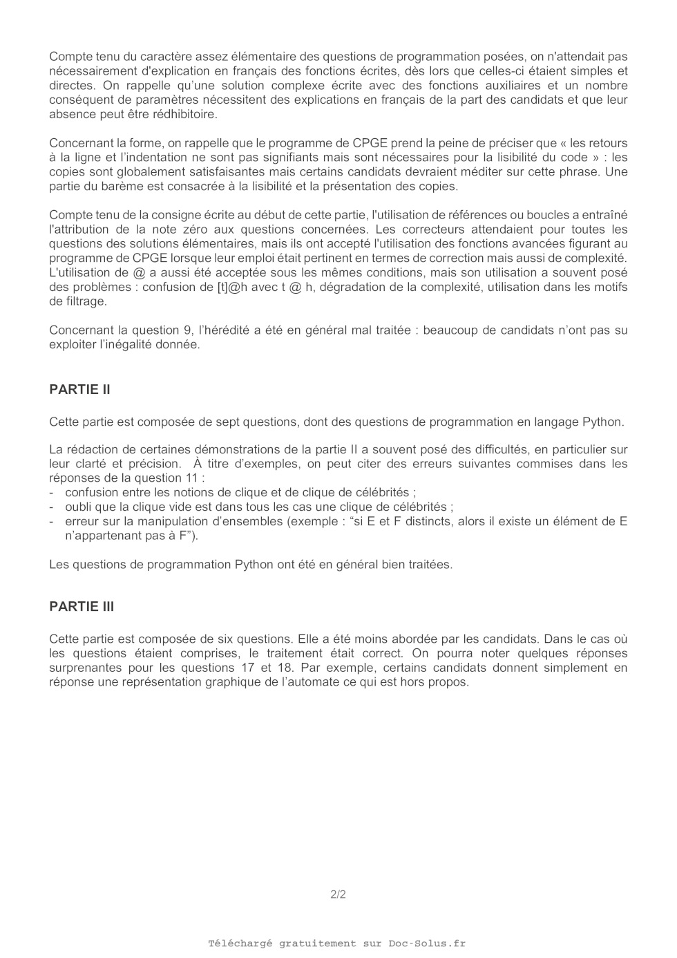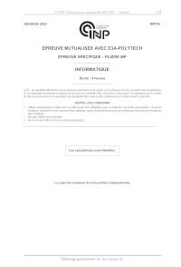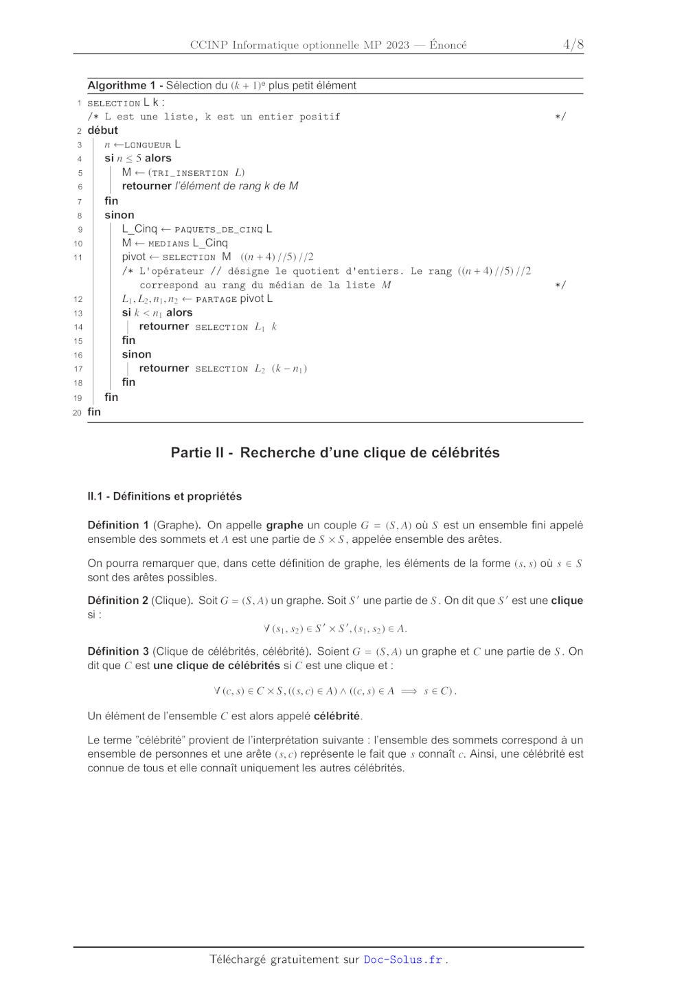 T (n) < (200 + T (55))n. Pour l'initialisation, on pourra remarquer que T est une fonction croissante. 318 1 2 12 13 14 15 16 17 18 19 20 Algorithme 1 - Sélection du (k + 1}° plus petit élément SELECTION L K: /* L est une liste, k est un entier positif * / début n LONGUEUR L si n < 5 alors M <- (TRI_INSERTION L) retourner l'élément de rang k de M fin sinon L_ Cinq + PAQUETS_DE_CINQ L M < mep1ians L Cinq pivot < SELECTION M ((n+4)//5)//2 /* L'opérateur // désigne le quotient d'entiers. Le rang ((n+4)//5)//2 correspond au rang du médian de la liste M * / Li, L,ni,n2 + PARTAGE Pivot L Si k < n, alors | retourner SELECTION L, k fin sinon | retourner SELECTION L) (k--n:;) fin fin fin Partie Il - Recherche d'une clique de célébrités 11.1 - Définitions et propriétés Définition 1 (Graphe). On appelle graphe un couple G = (S,A) où S est un ensemble fini appelé ensemble des sommets et À est une partie de S x S, appelée ensemble des arêtes. On pourra remarquer que, dans cette définition de graphe, les éléments de la forme (s,5)ousesS sont des arêtes possibles. Définition 2 (Clique). Soit G = (S,A) un graphe. Soit S' une partie de S. On dit que S'" est une clique SI : V(s1,5) ES XS",(51, 52) EUR À. Définition 3 (Clique de célébrités, célébrité). Soient G = (S,A) un graphe et C une partie de S. On dit que C est une clique de célébrités si C est une clique et : V(csECXS,((s,c)E A)A((C SEA = sEC). Un élément de l'ensemble C est alors appelé célébrité. Le terme célébrité" provient de l'interprétation suivante : l'ensemble des sommets correspond à un ensemble de personnes et une arête (s,c) représente le fait que s connaît c. Ainsi, une célébrité est connue de tous et elle connaît uniquement les autres célébrités. 418 Q10. Dans cette question, on pose S = {0,1,2,...,6}. Pour chacun des graphes suivants, préciser S'ils contiennent une clique de célébrités non vide. Dans le cas où il y en a une, l'expliciter. 1. Gi =(S,A,) avec À, = {(1,2),(1,3).,(1,5),(2,6)!}. 2. G2 = (S,A)) avec A) -- (0,3),(0,5),(1,2),(1,3),(2,2),(2,3),(3,3), 27 | (4,1),(4,3),(4,5),(5,1),(5,3),(6,1),(6,3) Q11. Soit G = (S,A) un graphe quelconque. Montrer que s'il existe une clique de célébrités non vide C dans G, alors celle-ci est unique. Dans la suite, on note CG l'unique clique de célébrités non vide du graphe G. Dans le cas où celle-ci n'existe pas, C& désigne alors l'ensemble vide qui est noté 0. Q12. Soient G = (S,A) un graphe et p un sommet de G. On note G" = (S\{p},AN(S\{p} xS \{p})). Montrer les propositions suivantes : a) Montrer que si C; est égal à l'ensemble vide, alors CG EUR {0,{p}}. b) Montrer que si CG\{p} 4 0, alors C& = CG\{p}. c) On suppose que C;: n'est pas l'ensemble vide et on fixe c" un élément de Cc. 1) Montrer que si (p, c') n'est pas un élément de 4, alors CG EUR {0,{p}}. i) Montrer que si (c', p) n'est pas un élément de 4, alors CG EUR {0, Ca}. ii) Montrer que si (p, c') et (c', p) sont des éléments de 4, alors CG EUR {0, {p} U Co}. 11.2 - Algorithmique et programmation en Python (Informatique Commune) Dans la suite, l'ensemble des sommets est de la forme {0, 1,...,n-- 1} où n est un entier supérieur à 1 et un graphe G = (S, À) est représenté en Python par sa liste d'adjacence que l'on note Z; et qui est définie par : [Ej | JES et G, je A J'iesS]. Par exemple, si G = ({0,1,2,3},{(0,1),(3,2),(3,1),(1,2)}), alors LG = [[1], [2], [}, [1,2]]. On pourra remarquer que si l'ensemble des sommets d'un graphe G est égal à {0,1,...,n -- 1}, alors la longueur de la liste Z; est égale à n. Q13. Écrire une fonction Python est_clique(L,R) prenant en argument une liste L qui est une liste d'adjacence d'un graphe G = (S,A) et une liste R sans répétition d'éléments de S et qui renvoie True si l'ensemble des éléments de RÀ constitue une clique de G et False sinon. Q14. On considère le graphe G ayant comme liste d'adjacence : LG = [[1,3,5], 10,21, [4, 67, 2,4, 5, 61, [2T, [2, 3, 4], (2, 4, 61]. Décrire l'évolution de la variable C à chaque étape de l'Algorithme 2 décrit en page 6. Q15. Écrire une fonction Python Clique_possible_C(G) prenant en argument une liste G représen- tant un graphe et qui renvoie la liste C construite à l'aide de l'Algorithme 2. Q16. Montrer par récurrence sur le nombre de sommets que si G est un graphe où CG est non vide, alors Clique_possible C(G) est égale à CG. 9/8 Algorithme 2 - Construction d'une clique de célébrités possibles 1 CLIQUE_POSSIBLE C G: 2 début 3 CI 4 S -- [0,1,...,n-1] /* n est le nombre de sommet de G 5 pour chaque s élément de S faire 6 si C est vide alors 7 | Ajouter s dans C 8 fin 9 sinon 10 c-- premier élément de C 11 t-- FAUX /* t permet de vérifier si on a effectué certaines instructions 12 si (S,c) n'est pas une arête de G alors 13 Cfs] 14 t-- VRAI 15 fin 16 si (c,s) n'est pas une arête de G alors 17 CC 18 t-- VRAI 19 fin 20 si : = FAUX alors 21 | Ajouter s à la fin de liste C 22 fin 23 fin 24 fin 25 fin 26 retourner C 6/8 Partie III - Etude d'une famille d'automates Dans cette partie, l'alphabet > désigne l'ensemble {0,1}, le symbole & désigne