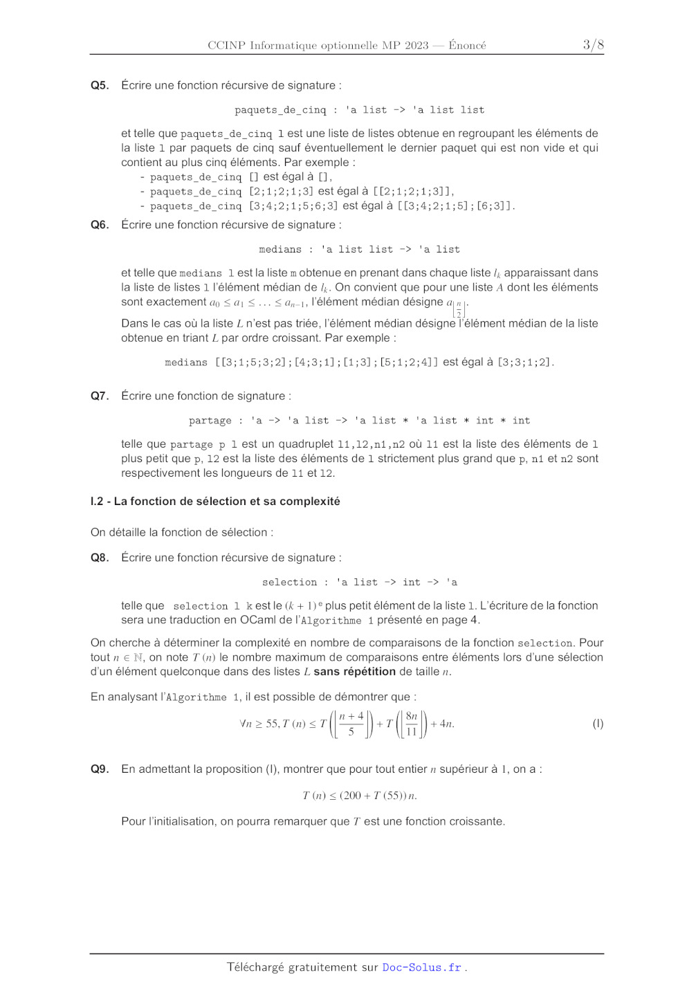 .<_ Utiliser uniquement un Stylo noir ou bleu foncé non effaçable pour la rédaction de votre composition ; d'autres couleurs, excepté le vert, peuvent être utilisées, mais exclusivement pour les schémas et la mise en évidence des résultats. . Ne pas utiliser de correcteur. « Écrire le mot FIN à la fin de votre composition. Les calculatrices sont interdites. Le sujet est composé de trois parties indépendantes. 1/8 Partie | - Programmation en OCami : sélection du (k + 1}° plus petit élément La sélection du (k + 1}° plus petit élément d'une liste d'entiers L, non nécessairement triée, consiste a trouver le (k + 1° élément de la liste obtenue en triant ZL dans l'ordre croissant. Par exemple, si L = [9;1;2;4;7;8] le 3° plus petit élément de Z est 4. On pourra remarquer que si la liste L est triée dans l'ordre croissant, le (k + 1)° plus petit élément est l'élément de rang k dans L. On présente un algorithme permettant de résoudre ce problème de sélection avec une complexité temporelle linéaire dans le pire cas. Celui-ci est basé sur le principe de "diviser pour régner" et sur le choix d'un bon pivot pour partager la liste en deux sous-listes. Dans cette partie, les fonctions demandées sont à écrire en OCaml et ne doivent faire intervenir aucun trait impératif du langage (références, tableaux ou autres champs mutables ou exception par exemple). Étant donné un réel a, on note |a] le plus grand entier inférieur ou égal à a. 1.1 - Fonctions utiles Dans cette section, on écrit des fonctions auxiliaires qui sont utiles pour la fonction principale. Q1. Q2. QS. Q4. Écrire une fonction récursive de signature : longueur : 'a list -> int