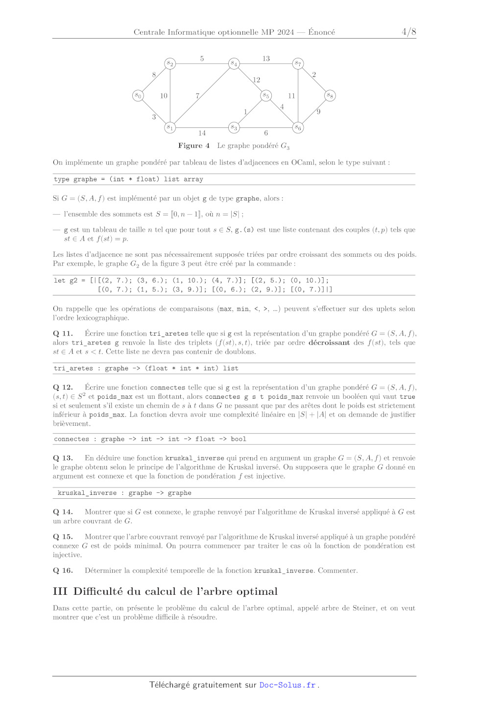 Q 33. Montrer que f(T') < g(T), puis en déduire que f(T) < 2f(T*). On représente une partie X C S comme un tableau de booléens tab_X de taille n = |S| tel que pour 8 EUR S s E À si et seulement si tab_X.(s) vaut true. Pour créer un graphe induit par une partie X en OCamil, il est nécessaire de renuméroter des sommets, via une bijection num : X -- [0,|[X]--1]. Q 34. Écrire une fonction renumeroter qui prend en argument une partie À C S'et renvoie un tableau num d'entiers de taille n tel que pour 8 EUR $, num.(s) vaut --1 si s EUR X et num.(s) = numi(s) sinon, où num est une bijection de X -- [0,/X| -- 1] choisie arbitrairement. renumeroter : bool array -> int array