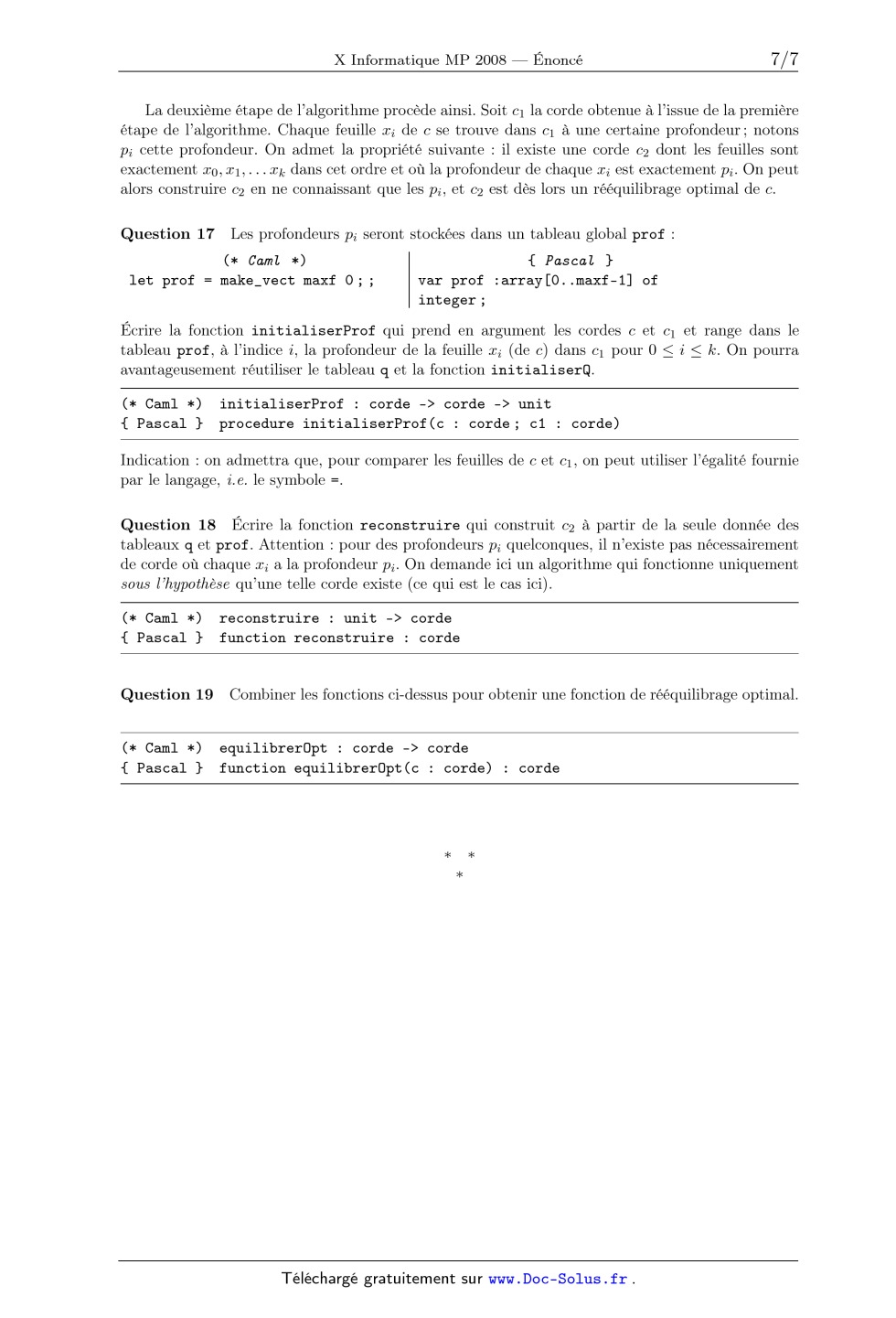 (2 i < tailleMax). Question 14 Écrire la fonction equilibrer qui réalise l'équilibrage d'une corde par l'algorithme ci-dessus. (* Caml *) equilibrer : corde -> corde