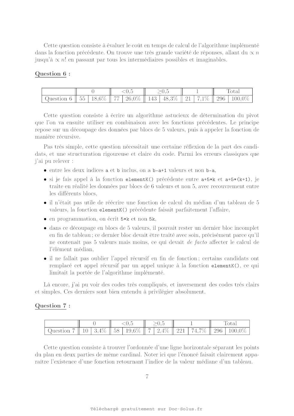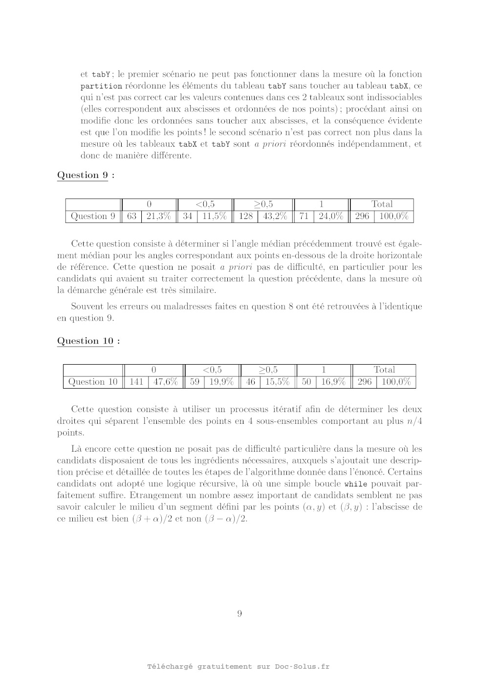 ECOLE POLYTECHNIQUE ECOLE NORMALE SUPERIEURE DE CACHAN ECOLE SUPERIEURE DE PHYSIQUE ET DE CHIMIE INDUSTRIELLES CONCOURS D'ADMISSION 2012 FILIERE MP HORS SPECIALITE INFO FILIERE PC COMPOSITION D'INFORMATIQUE B (XEC) (Duree : 2 heures) L'utilisation des calculatrices n'est pas autorisee pour cette epreuve. Le langage de programmation choisi par le candidat doit etre specifie en tete de la copie. Sandwich au jambon Le probleme dit du sandwich au jambon ou bien encore appele theoreme de Stone-Tukey s'enonce de la maniere suivante : un ensemble de n points en dimension d peut toujours etre separe en deux parties de cardinal au plus n/2 par un hyperplan de dimension d - 1 (certains points peuvent etre dans l'hyperplan), ou n/2 designe la partie entiere de n/2. De maniere concrete, un ensemble de points dans l'espace peut etre separe en deux parties quasi-egales par un plan. De meme un ensemble de points dans le plan peut etre separe en deux par une droite et meme en 4 a l'aide de deux droites. Ce sujet porte sur la resolution algorithmique de ce probleme et de problemes connexes selon differentes methodes. Dans tout le probleme, les tableaux sont indices a partir de 1. L'acces a la i-eme case d'un tableau tab est note tab[i]. Quel que soit le langage utilise, on suppose que les tableaux peuvent etre passes comme arguments des fonctions. En outre, il existe une primitive allouer(m, c) pour creer un tableau de taille m dont chaque case contient c a l'origine, ainsi qu'une primitive taille(t) qui renvoie la taille d'un tableau t. Enfin, on disposera d'une fonction floor(x) qui renvoie la partie entiere x pour tout reel x 0. La complexite, ou le temps d'execution, d'un programme P (fonction ou procedure) est le nombre d'operations elementaires (addition, soustraction, multiplication, division, affectation, etc...) necessaires a l'execution de P . Lorsque cette complexite depend d'un parametre n, on dira que P a une complexite en O(f (n)), s'il existe K > 0 tel que la complexite de P est au plus Kf (n), pour tout n. Lorsqu'il est demande de garantir une certaine complexite, le candidat devra justifier cette derniere si elle ne se deduit pas directement de la lecture du code. 1 Partie I. Grand, petit et median Dans cette partie, nous supposerons donne un tableau tab contenant n nombres reels. Les indices du tableau vont de 1 a n. Nous denoterons par tab[a..b] le tableau pris entre les indices a et b c'est-a-dire les cellules tab[a], tab[a + 1], . . . , tab[b - 1], tab[b]. Nous supposerons dans l'enonce que a b. Nous utiliserons le tableau de taille 11 suivant pour nos exemples : 3 2 5 8 1 34 21 6 9 14 8 Question 1 Ecrire une fonction calculeIndiceMaximum(tab, a, b) qui renvoie l'indice d'une case ou se trouve le plus grand reel de tab[a..b]. Sur le tableau precedent avec a = 1 et b = 11, la fonction renverra 6 car la case 6 contient la valeur 34. Question 2 Ecrire une fonction nombrePlusPetit(tab, a, b, val) qui renvoie le nombre d'elements dans le tableau tab[a..b] dont la valeur est plus petite ou egale a val. Sur le tableau exemple, pour une valeur de val egale a 5, et a = 1, b = 11, la fonction devra renvoyer la valeur 4 car seuls les nombres 3, 2, 5, 1 sont inferieurs ou egaux a 5. Nous allons maintenant calculer un median d'un tableau. Rappelons qu'une valeur mediane m d'un ensemble E de nombres est un element de E tel que les deux ensembles Em (les nombres de E strictement plus grands que m) verifient |E m | n/2. Notez que le probleme du median est une reformulation de probleme dit du sandwich au jambon pris en dimension 1. Une methode naive consiste donc a parcourir les elements de l'ensemble et a calculer pour chacun d'eux les valeurs de |E m | mais il est possible de faire mieux comme nous allons le voir dans la partie suivante. Partie II. Un tri pour accelerer Une methode plus efficace serait de trier le tableau par ordre croissant tout en prenant la cellule du milieu dans le tableau trie. Cette methode certes rapide requiert O(n ln n) operations. Il existe une methode optimale en temps lineaire O(n) pour trouver le median d'un ensemble de n elements. Cette partie a pour but d'en proposer une implementation. Une fonction annexe necessaire pour cet algorithme consiste a savoir separer en deux un ensemble de valeurs. Soit un tableau tab et un reel appele pivot p = tab[i], il s'agit de reordonner les elements du tableau en mettant en premier les elements strictement plus petits que le pivot tab p . Sur le tableau exemple, en prenant comme valeur de pivot 8 on obtiendra le tableau resultat suivant : 3, 2, 5, 1, 6 8, 8 21, 34, 9, 14 Notez que dans le resultat les nombres plus petits que le pivot 3, 2, 5, 1, 6 peuvent etre dans n'importe quel ordre les uns par rapport aux autres. 2 Question 3 Ecrire une fonction partition(tab, a, b, indiceP ivot) qui prend en parametre un tableau d'entiers tab[a..b] ainsi qu'un entier a indiceP ivot b. Soit p = tab[indiceP ivot]. La fonction devra reordonner les elements de tab[a..b] comme explique precedemment en prenant comme pivot le nombre p. La fonction retournera le nouvel indice de la case ou se trouve la valeur p. Dans cette question, on suppose que les modifications effectuees par la fonction sur le tableau tab sont persistantes, meme apres l'appel de la fonction. Remarquons que le n/2-eme element dans l'ordre croissant d'un tableau de taille n est un element median du tableau considere. Nous allons donc non pas programmer une methode pour trouver le median mais plus generalement pour trouver le k-eme element d'un ensemble. Nous allons utiliser l'algorithme suivant : On cherche le k-eme element du tableau tab[a..b]. Si k = 1 et a = b alors renvoyer tab[a] Sinon, soit p = tab[a]. Partitionner le tableau tab[a..b] en utilisant le pivot p en mettant en premier les elements plus petits que p. Soit i l'indice de p dans le tableau resultant. Si i - a + 1 > k chercher le k-eme element dans tab[a..i - 1] et renvoyer cet element. Si i - a + 1 = k renvoyer le pi