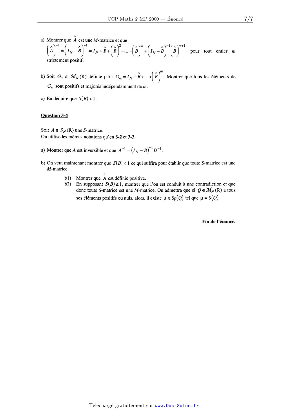 (Q) < 1 . k20 On admettra l'équivalence : Q" Î;----> 0 «: S (Q) < 1. Dans toute la suite de la question 3-2, on considère une L-matrice A d'ordre N et D la matrice diagonale ayant la même diagonale que A, donc définie par : 2 Pour tout couple d'indices (i , j) & (WN) tels que i # j, on a d,-]- = 0 Pour tout indice i & WN , on a dû : a,--,-- Soit C = (cg) appartenant à MN(R), telle que A=D--C et soit 8: D_1C (on justifiera l'existence de D_l). On suppose que S (B) < 1. --1 b) Justifier le fait que IN -- B est inversible et montrer que tous les éléments de (IN -- B) sont positifs ou nuls. c) Montrer que A est inversible et que A est une M--matrice. Question 3-3 Si D est une matrice diagonale à coefficients diagonaux strictement positifs, on définit DV2 et ' 1 il" et pour V dii D--l/2 matrices diagonales dont les éléments diagonaux sont respectivement d tout indice i & WN . Soit A une M--matrice. A On définit D, C, B comme à la question précédente et Ae£MN (R) par A A A A = D'V2AD"'/2 = IN - D"V2CD--V2 et B 6 MN (R) par B = Dl/2BD"V2. A a) Montrer que A est une M--matrice et que : A--l A---l A A2 Am A--1Am+l (A) =(lN--B] =IN+B+(B) +....+(BJ +(lN--B) (B) pour t0Ut entier '" strictement positif. /\ A "1 b) Soit G... G MN (R) définie par: G... : IN +B+....+(B) . Montrer que tous les éléments de G... sont positifs et majorés indépendamment de m. c) En déduire que S(B) < 1. Question 3-4 Soit A & SN (R) une S--matrice. On utilise les mêmes notations qu'en 3-2 et 3-3. . . _ --l _ a) Montrer que A est 1nversrble et que A l : (IN -- B) D ' . b) On veut maintenant montrer que S ( B) < 1 ce qui suffira pour établir que toute S--matrice est une M--matrice. A bl) Montrer que A est définie positive. b2) En supposant S (B) 2 l, montrer que l'on est conduit à une contradiction et que donc toute S-matrice est une M--matrice. On admettra que si Q & MN (R) a tous ses éléments positifs ou nuls, alors, il existe 11 & Sp(Q) tel que u = S (Q) Fin de l'énoncé.