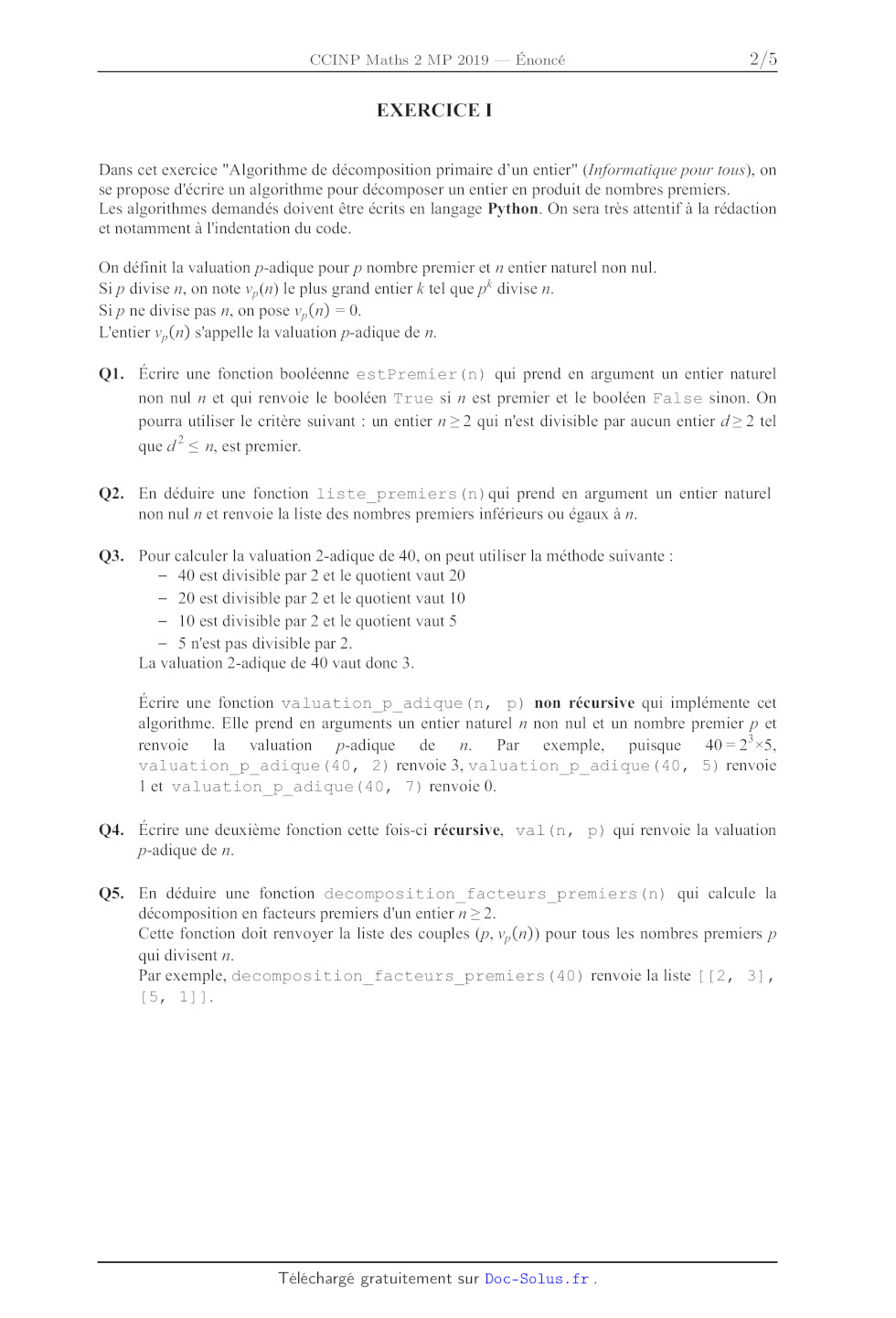 que d" < n, est premier. En déduire une fonction liste premiers (n)qui prend en argument un entier naturel non nul # et renvoie la liste des nombres premiers inférieurs ou égaux à n. Pour calculer la valuation 2-adique de 40, on peut utiliser la méthode suivante : -- 40 est divisible par 2 et le quotient vaut 20 -- 20 est divisible par 2 et le quotient vaut 10 -- 10 est divisible par 2 et le quotient vaut 5 -- 5 n'est pas divisible par 2. La valuation 2-adique de 40 vaut donc 3. Écrire une fonction valuation p adique(n, p) non récursive qui implémente cet algorithme. Elle prend en arguments un entier naturel 7 non nul et un nombre premier p et renvoie la valuation p-adique de n. Par exemple, puisque 40-- 2°x5, valuation p adique(40, 2) renvoie 3,valuation p adique(40, 5) renvoie let valuation p adique(40, 7) renvoie 0. Ecrire une deuxième fonction cette fois-c1 récursive, val(n, p) qui renvoie la valuation p-adique de n. En déduire une fonction decomposition facteurs premiers(n) qui calcule la décomposition en facteurs premiers d'un entier n > 2.