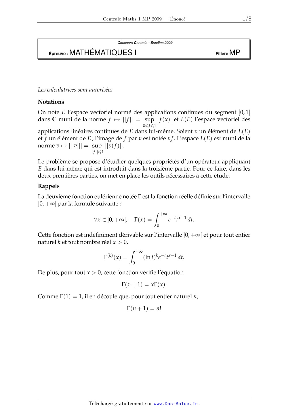 dt si 0 < x 6 1. (x - t) 0 IV.A.2) Pour tout element f de E, on note A f la fonction definie sur le segment [0, 1] par les formules suivantes : On pourra utiliser le resultat de la question preliminaire I.3. Page 3/4 Etablir que pour toute fonction f de E et pour tout reel x de l'intervalle f (t) ]0, 1], la fonction t 7 est integrable sur l'intervalle ]0, x[. (x - t) IV.A IV.A.1) Dans toute cette derniere partie, on suppose que est un nombre reel appartenant l'intervalle ]0, 1[. III.C.3) En conclure que : c) Apres avoir verifie que, pour tout nombre complexe c departie imaginaire non 1 t - Rec est une prinulle, la fonction t 7 ln (t - Rec)2 + (Imc)2 + i arctan 2 Imc 1 mitive sur R de la fonction t 7 , prouver en utilisant judicieusement la relat-c tion (*) que : Z + 2p q-1 t 2p+1 dt = -i zk 2q 2q 1+t 0 k=0 (*) Etablir que : zk = e b) Pour tout entier k compris entre 0 et q - 1, on note : MATHÉMATIQUES I (id E - A )g = f . converge uniformement sur le seg- n=0 n An designe l'application f + 7 n=0 n An ( f ). + n=0 n An 0 f (t) dt. Pen . sin (A1- A ) = P. sin Etablir que pour toute fonction polynomiale , (A1- A )en = Ainsi, avec cette notation, pour tout entier naturel n, x [0, 1], P f (x) = Formule d'inversion d'Abel. Filière MP P. sin id E . sin · · · FIN · · · d) En deduire que l'operateur A est injectif. D B = Montrer que D B est bien defini et que : c) Soit D l'operateur qui a toute application continument derivable de [0, 1] dans C associe sa derivee. B = b) On pose B = A1- A . Montrer que : || f ||61 |||P||| = sup ||P f || = 1. a) Montrer que l'endomorphisme P est un endomorphisme continu de E tel que : IV.C.3) Page 4/4 IV.C.2) Ce resultat suggere d'introduire l'operateur P defini sur E par la formule suivante : Z x IV.C - Pour tout entier naturel n, on note en la fonction monomiale t 7 tn . IV.C.1) Soit n un entier naturel. a) Calculer A en . b) En deduire que : en+1 . (A1- A )en = sin n + 1 ou (id E - A )-1 = + c) En deduire que, pour tout nombre complexe non nul, l'operateur id E - A est inversible et que : b) Prouver que : ment [0, 1]. On note g la somme de cette serie de fonctions. n=0 n An f + Soient un nombre complexe non nul et f un element de E. a) Prouver que la serie de fonctions IV.B.3) MATHÉMATIQUES I (id E - A )g = f . converge uniformement sur le seg- n=0 n An designe l'application f + 7 n=0 n An ( f ). + n=0 n An 0 f (t) dt. Pen . sin (A1- A ) = P. sin Etablir que pour toute fonction polynomiale , (A1- A )en = Ainsi, avec cette notation, pour tout entier naturel n, x [0, 1], P f (x) = Formule d'inversion d'Abel. Filière MP P. sin id E . sin · · · FIN · · · d) En deduire que l'operateur A est injectif. D B = Montrer que D B est bien defini et que : c) Soit D l'operateur qui a toute application continument derivable de [0, 1] dans C associe sa derivee. B = b) On pose B = A1- A . Montrer que : || f ||61 |||P||| = sup ||P f || = 1. a) Montrer que l'endomorphisme P est un endomorphisme continu de E tel que : IV.C.3) Page 4/4 IV.C.2) Ce resultat suggere d'introduire l'operateur P defini sur E par la formule suivante : Z x IV.C - Pour tout entier naturel n, on note en la fonction monomiale t 7 tn . IV.C.1) Soit n un entier naturel. a) Calculer A en . b) En deduire que : en+1 . (A1- A )en = sin n + 1 ou (id E - A )-1 = + c) En deduire que, pour tout nombre complexe non nul, l'operateur id E - A est inversible et que : b) Prouver que : ment [0, 1]. On note g la somme de cette serie de fonctions. n=0 n An f + Soient un nombre complexe non nul et f un element de E. a) Prouver que la serie de fonctions IV.B.3) MATHÉMATIQUES I