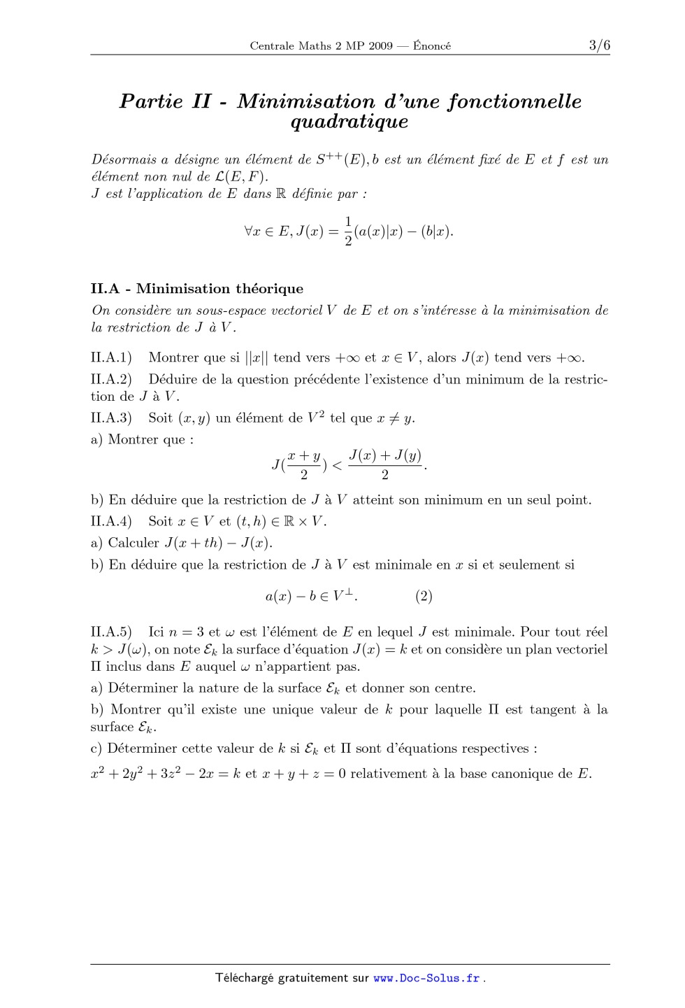 )< . 2 2 II.A - Minimisation theorique On considere un sous-espace vectoriel V de E et on s'interesse a la minimisation de la restriction de J a V . x E, J(x) = Desormais a designe un element de S ++ (E), b est un element fixe de E et f est un element non nul de L(E, F ). J est l'application de E dans R definie par : Partie II - Minimisation d'une fonctionnelle quadratique MATHÉMATIQUES II 2 Filière MP · · · FIN · · · a) Montrer que a est effectivement un endomorphisme de E defini positif. b) Ecrire une procedure effectuant lorsqu'on choisit = 2r, le calcul de Xk , matrice de xk relativement a la base canonique de E (on supposera n, m et r definis numeriquement mais on definira les matrices A, B et F ). b) Determiner la norme de subordonnee a ||.|| ; on la note . c) r est suppose fixe. Comment choisir pour que soit minimal ? Quelle est alors sa valeur ? d) Quelle est alors l'influence de r sur la rapidite de convergence de la suite (xk )k ? III.B.4) On se place toujours dans les bases canoniques de E et F et on se donne les matrices A, B et F de a, b et f par leur coefficient generique : ( ( i si i = j 1 si i + j = m + 1 , bi = 1, fi,j = . ai,j = 1 sinon 0 sinon a) Montrer que IE - (a + rf f )-1 f f est un endomorphisme autoadjoint de E qui laisse stables Ker(f ) et [Ker(f )] . On note l'endomorphisme induit sur [Ker(f )] . Page 3/3 III.B.3) On suppose que, relativement a la base canonique de E, la matrice de a est diagonale, soit diag(1 , . . . , n ) avec 1 2 · · · n > 0 et que celle