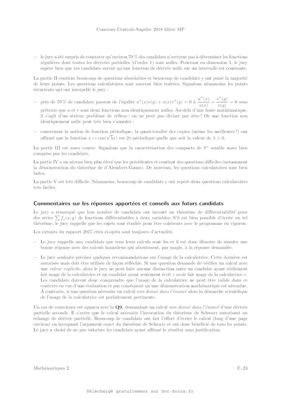 Q 24. En déduire que Vas E U, f(x) < sup f(y). yEURôU Q 25. Soit f1 et f2 deux fonctions continues sur Ü, de classe 62 et harmoniques sur U. Montrer que si les fonctions f1 et f2 sont égales sur ôU, alors f1 et f2 sont égales sur U. IV Fonctions harmoniques et fonctions développables en série en- tière On dit qu'une fonction f, définie sur D(O,R) C IR2 et à valeurs complexes, se développe en série entière sur D(O, R) s'il existe une suite complexe (an) telle que V(oeiy) EUR D(ÛvR)a f(oevy) =zan(oe+iy)n n=0 Dans toute cette partie, f désigne une fonction se développant en série entière sur D(O, R). IV.A -- Q 26. Montrer que f est de classe 6'1 sur D(O, R) et que ses dérivées partielles se développent en série entière sur D(O, R). Que peut--on en déduire pour la fonction f '? On note u et 0 les parties réelle et imaginaire de f, de sorte que, quel que soit (sc, y) EUR D(O, R), u(oe,y) EUR [Rv U(OEvy) G [R, f(OE,y) : U(OE,y) +iv(æ,y). Q 27. Montrer que u et 1) sont des fonctions harmoniques sur D(O, R). I V.B -- On admet le résultat suivant : une fonction h de D(O, R) dans C se développe en série entière sur 8h 8h D(O, R) si et seulement si h est de classe 81 sur D(O,R) et pour tout (oe,y) EUR D(O,R), ô--(oe,y) : iô--(oe,y). y sc Q 28. Montrer que si f ne s'annule pas sur D(O, R) alors 1 /f se développe en série entière sur D(O, R). Q 29. Montrer que la fonction uv est harmonique sur D(O, R). IV. C -- Soit g une fonction de D(O, R) C [R2 dans [R. On suppose que g est harmonique. Q 30. Montrer que la fonction h définie sur D(O, R) par ôg 89 h : (OE7y> |_) OE(oevy)_iô_y(oe7y)
