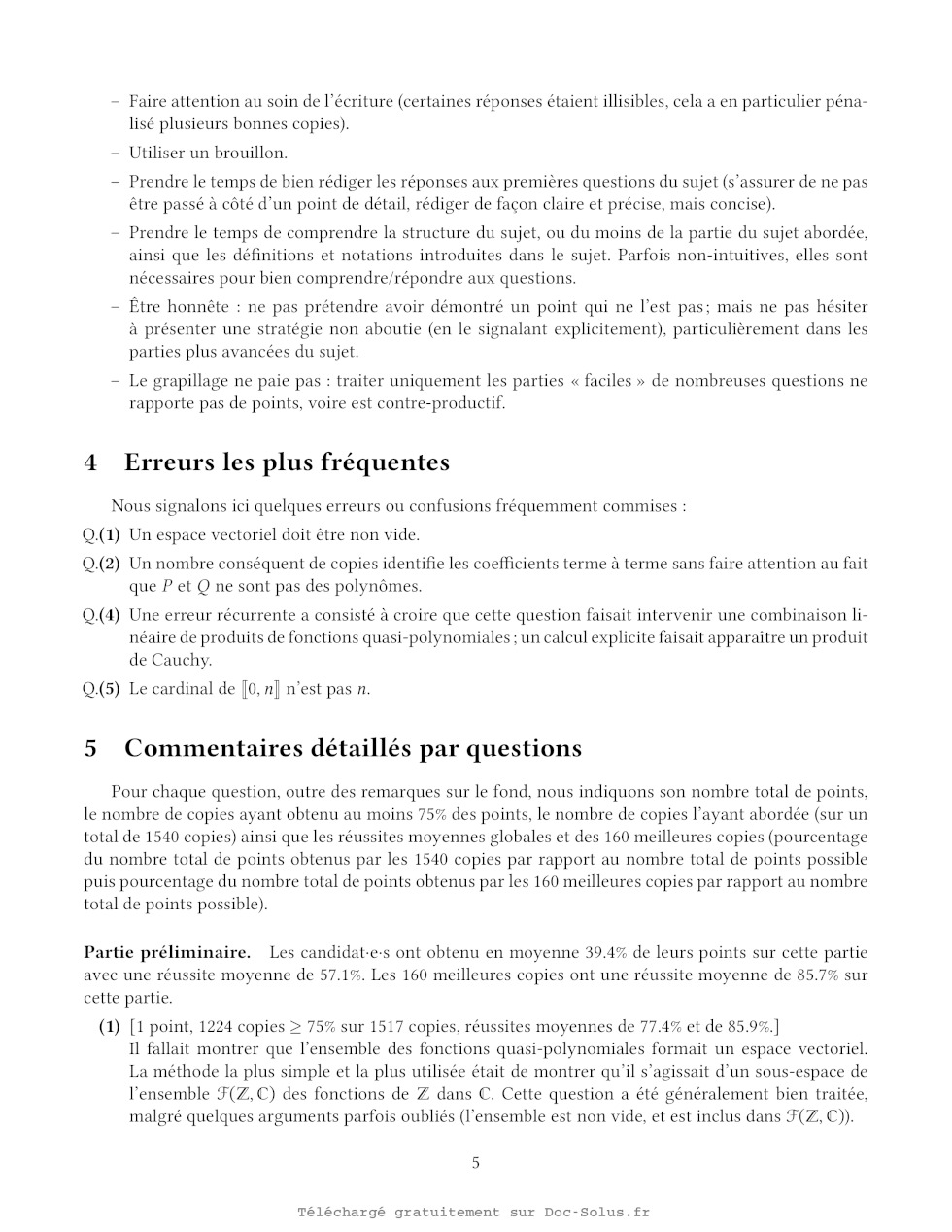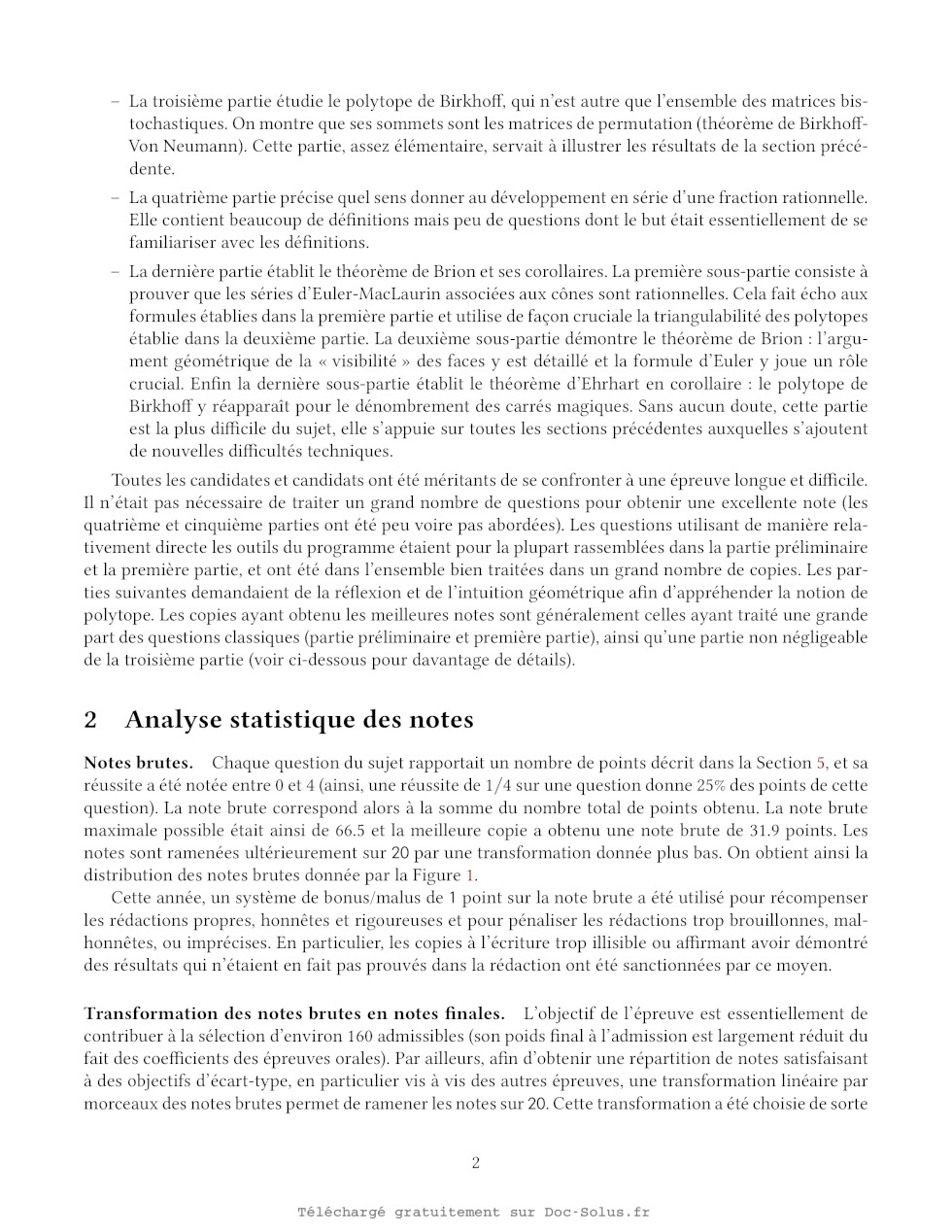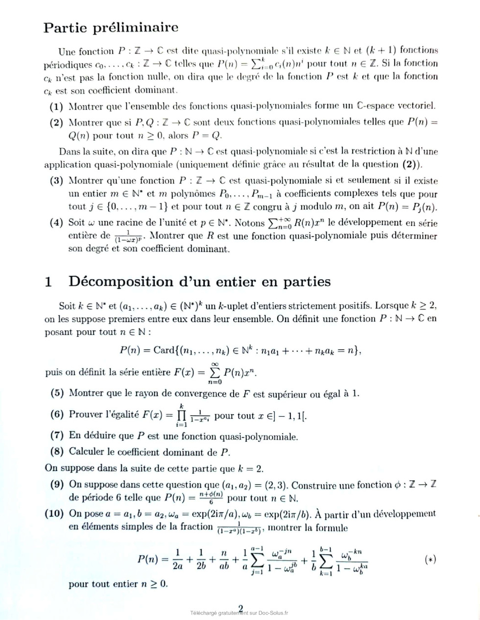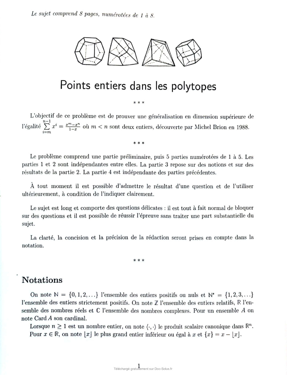 l'égalité 5 r° = 2 où m < n sont deux entiers, découverte par Michel Brion en 1988. d 1-z i=m XX *X Le problème comprend une partie préliminaire, puis 5 parties numérotées de 1 à 5. Les parties 1 et 2 sont indépendantes entre elles. La partie 3 repose sur des notions et sur des résultats de la partie 2. La partie 4 est indépendante des parties précédentes. À tout moment il est possible d'admettre le résultat d'une question et de l'utiliser ultérieurement, à condition de l'indiquer clairement. Le sujet est long et comporte des questions délicates : il est tout à fait normal de bloquer sur des questions et il est possible de réussir l'épreuve sans traiter une part substantielle du sujet. La clarté, la concision et la précision de la rédaction seront prises en compte dans la notation. Notations On note N = {0,1,2,...} l'ensemble des entiers positifs ou nuls et N° = {1,2,3,...} l'ensemble des entiers strictement positifs. On note Z l'ensemble des entiers relatifs, R l'en- semble des nombres réels et EUR l'ensemble des nombres complexes. Pour un ensemble À on note Card À son cardinal. Lorsque n > 1 est un nombre entier, on note (:,:) le produit scalaire canonique dans R".