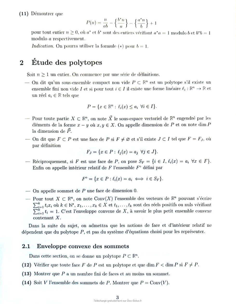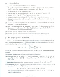 Soit P C R* un polytope défini par P = {x EUR R": li(x) < a; pour tout à EUR 7}, où L est un ensemble fini et pour tout à EUR I, £; : R° -- R est une forme linéaire et a; EUR R. On dit que P est rationnel si pour tout EUR lona a; EUR Z'et li(x) EUR Z pour tout x EUR Z". Soient x EUR P et y EUR R"\ P. On dit que y voit æ si [x,y] N P = {x}, on a noté ici (x, y] = Conv({r, y}), le segment d'extrémités x et y. On note enfin E, l'ensemble des points de P vus par y. (39) Montrer que pour tout y EUR R'\P, Z, est la réalisation d'un complexe composé de faces de P. (40) Prouver que si y EUR R"\ P, on a X(Zy) = 1. Indication. On pourra choisir un hyperplan H et se ramener à montrer le même résultat pour {{[y,2]NH: 2e 5,)}. (41) Soit F une face de P et Soit y E R"\ P : montrer que y voit F, c'est-à-dire FC YX,, si et seulement si y # Cr. Dans la suite de cette partie 5.2, on suppose que P est rationnel. 42) Montrer que Ec. est rationnel pour toute face F de P et que Et, est de torsion si F F dim EF > 0.