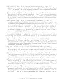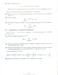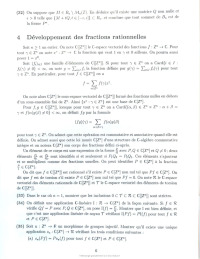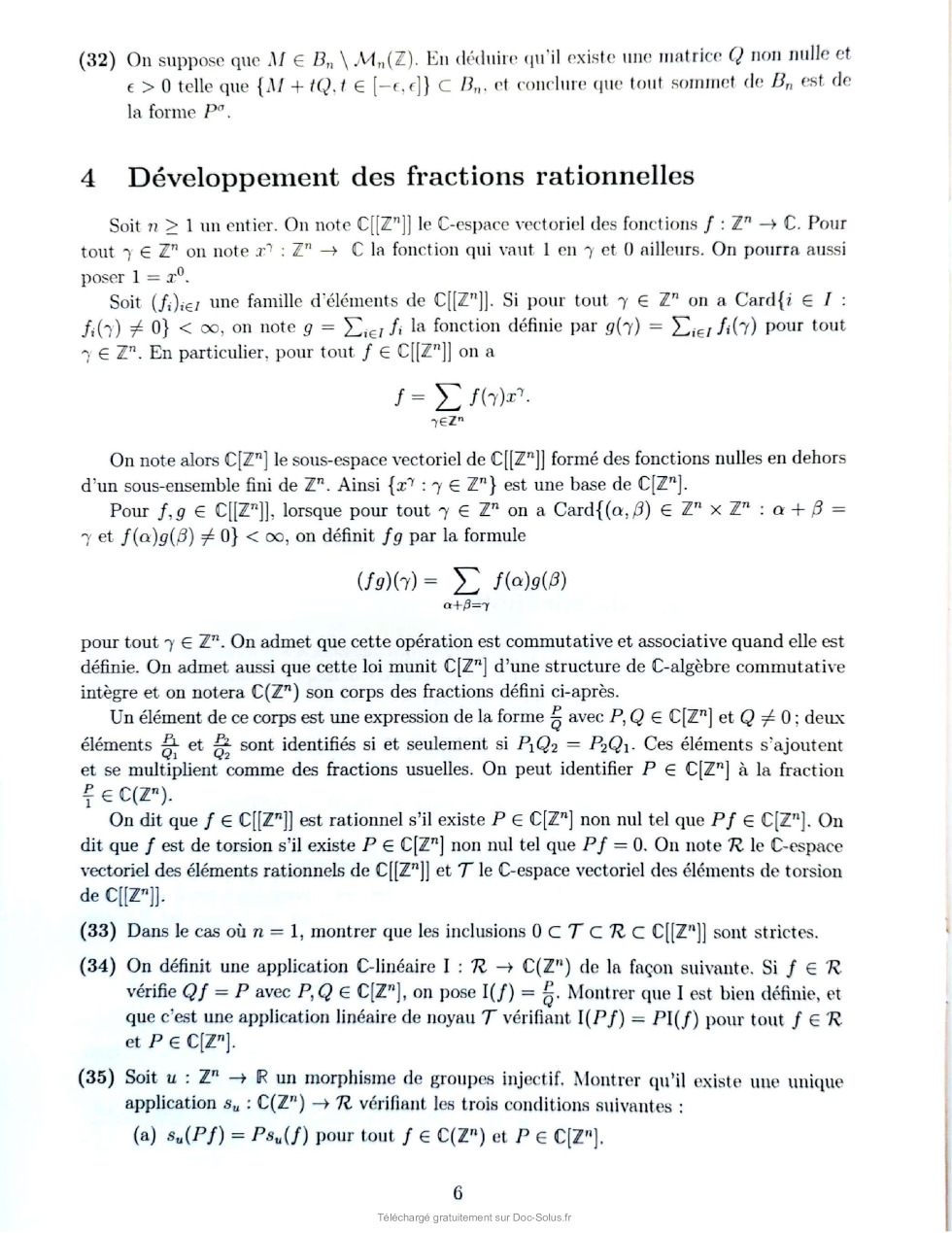 7 et f(a)g(8) À 0} < co, on définit fg par la formule (fg)() = S[ F(a)g(8) a+8=7 pour tout 7 EUR Z"'. On admet que cette opération est commutative et associative quand elle est définie. On admet aussi que cette loi munit C[Z"] d'une structure de C-algèbre commutative intègre et on notera C(Z") son corps des fractions défini ci-après. Un élément de ce corps est une expression de la forme avec P,Q EUR C[Z"] et Q Z 0; deux éléments 4 et a sont identifiés si et seulement si P1Q2 = P2Q:. Ces éléments s'ajoutent et se multiplient comme des fractions usuelles. On peut identifier P EUR C[Z"] à la fraction Ê e C(Z"). On dit que f EUR C[[Z"]] est rationnel s'il existe P EUR C[Z"] non nul tel que Pf EUR C[Z"]. On dit que f est de torsion s'il existe P EUR C[Z"] non nul tel que Pf = 0. On note R le C-espace vectoriel des éléments rationnels de C[[Z"]] et T le C-espace vectoriel des éléments de torsion de C[[Z")]. (33) Dans le cas où n = 1, montrer que les inclusions 0 EUR T CR © C[[Z"]] sont strictes. (34) On définit une application C-linéaire I : R -- C(Z") de la façon suivante. Si f EUR R vérifie Qf = P avec P,Q EUR C[Z"], on pose I(f) = 5. Montrer que I est bien définie, et que c'est une application linéaire de noyau T vérifiant I(Pf) = PI(f) pour tout f EUR R et P e C[Z"]. (35) Soit u : Z" -- R un morphisme de groupes injectif. Montrer qu'il existe une unique application s, : C(Z") -- R vérifiant les trois conditions suivantes : (a) s(Pf) = Psi(f) pour tout f e C(Z") et P EUR C[Z"]. (b) Isu(f)) = f pour tout f EUR C(Z"). c) Su(r) = g" si g est une combinaison linéaire finie d'éléments de la forme 1-g neN : 9 x? avec 7? EUR Z" vérifiant u(+) > 0.