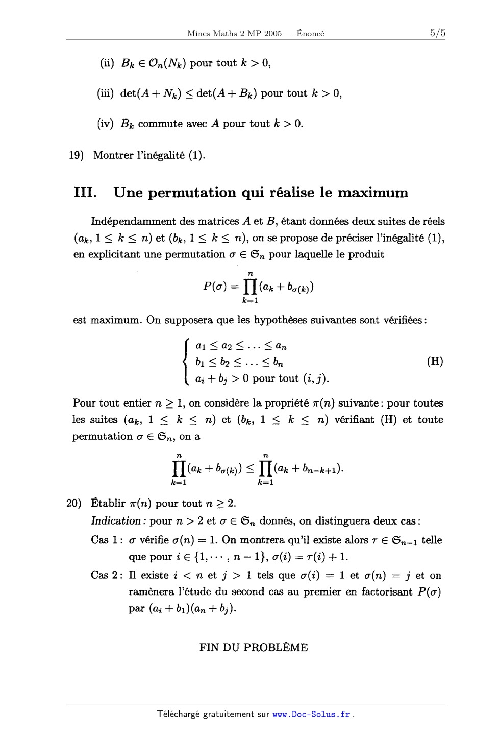 les suites (al,, 1 < k < n) et (b,,, 1 < k < n) vérifiant (H) et toute permutation 0 EUR 6... on a n H(ak + ba(k)) S H(% + b --k+1)- k=1 k=1 20) Établir 7r(n) pour tout n 2 2. Indication: pour n > 2 et 0" EUR EUR,, donnés, on distinguera deux cas: