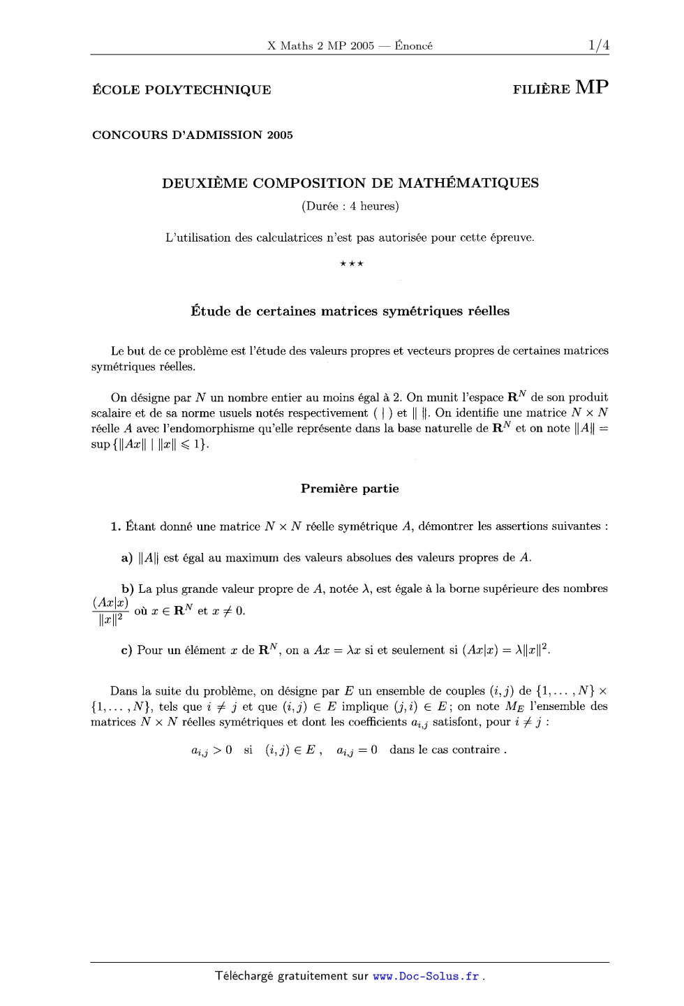 identifie une matrice N >< N réelle A avec l'endomorphisme qu'elle représente dans la base naturelle de RN et on note ||A|| : sup{l|A--'Bll | "fill < 1}- Première partie 1. Etant donné une matrice N >< N réelle symétrique A, démontrer les assertions suivantes : a) "A" est égal au maximum des valeurs absolues des valeurs propres de A. b) La plus grande valeur propre de A, notée À, est égale à la borne supérieure des nombres A ("îllî) où :D E RN et a: # O. c) Pour un élément a: de RN, on a Acc = Àa: si et seulement si (Aælæ) : À||oe||2. Dans la suite du problème, on désigne par E un ensemble de couples (i, j ) de {l, . .. ,N } >< {1,.... ,N}, tels que z' # j et que (i,j) E E implique (j,i) E E; on note ME l'ensemble des matrices N >< N réelles symétriques et dont les coefficients ai,j satisfont, pour z' # j : a... > 0 si (i,j) E E , a... = 0 dans le cas contraire .