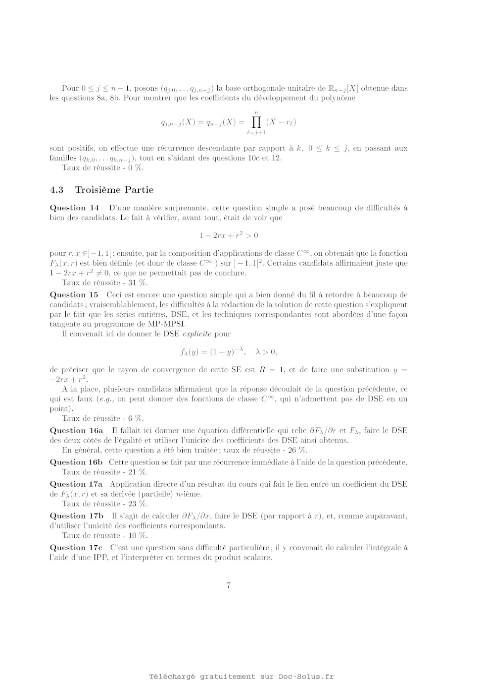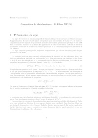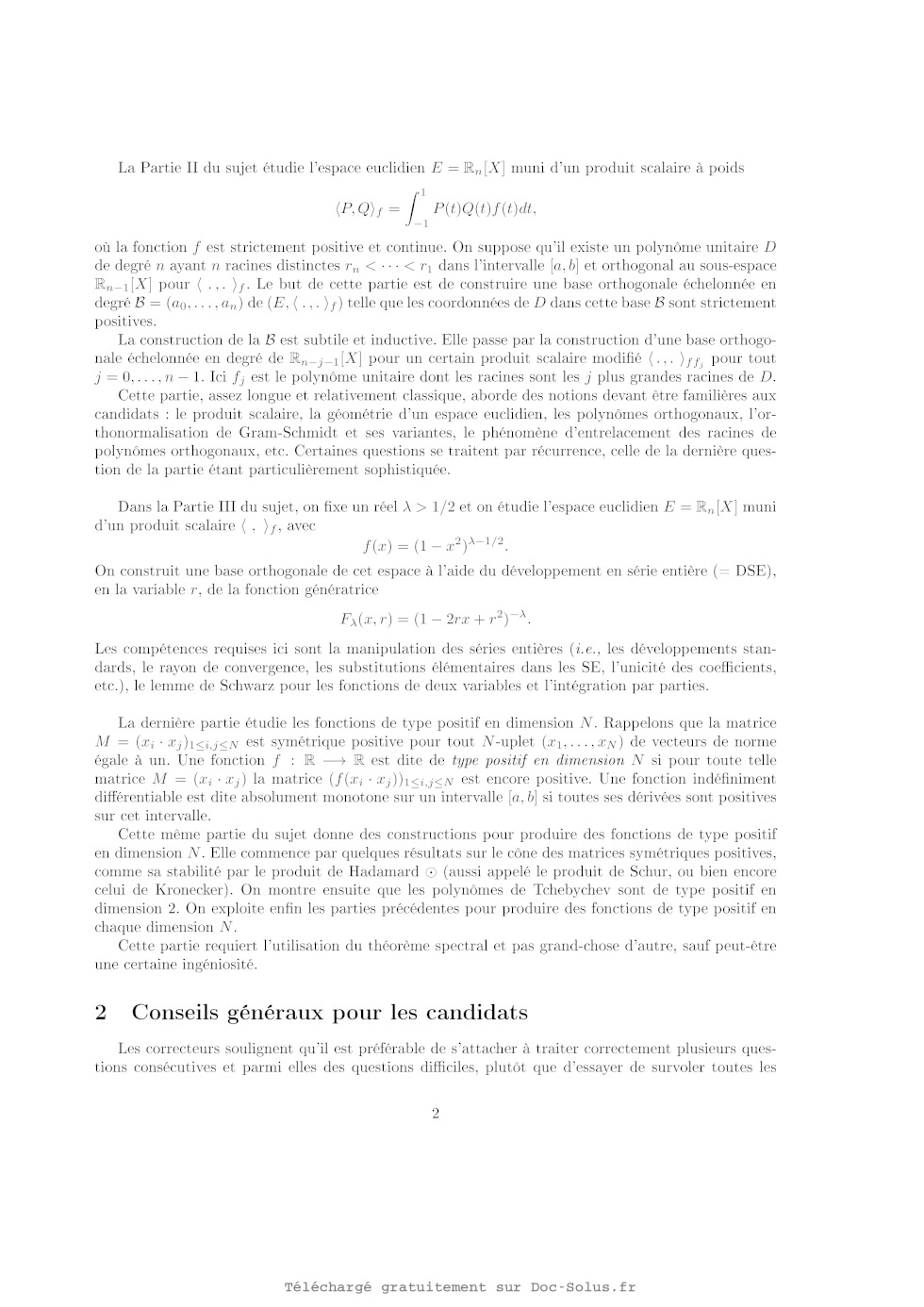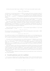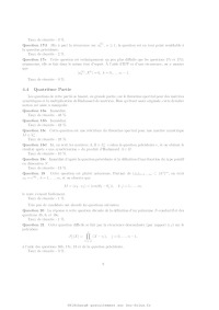Soit un nombre réel strictement positif. Pour tous réels x et r tels que |x| < 1 et |r| < 1, on pose F (x, r) = (1 - 2rx + r2 )- . 14. Montrer que la fonction F est de classe C sur ]-1, 1[2 . 15. Montrer que pour x ]-1, 1[, la fonction r 7 F (x, r) est développable en série entière au voisinage de 0. () Pour x ]-1, 1[, on note an (x) le n-ième coefficient du développement de la fonction r 7 F (x, r) de sorte que, pour r dans un voisinage de 0, X n F (x, r) = a() n (x)r . n0 4 () () 16a. Pour x ]-1, 1[, montrer que a1 (x) = 2xa0 (x) et que, pour tout entier n 1, () () (n + 1)an+1 (x) = 2(n + )xa() n (x) - (n + 2 - 1)an-1 (x). Indication : on pourra commencer par calculer (1 - 2xr + r2 ) F r (x, r). () 16b. En déduire que, pour tout n 0, la fonction an est un polynôme de degré n dont on déterminera le coefficient dominant ainsi que la parité. On suppose désormais que > 12 . Pour P, Q R[X], on pose