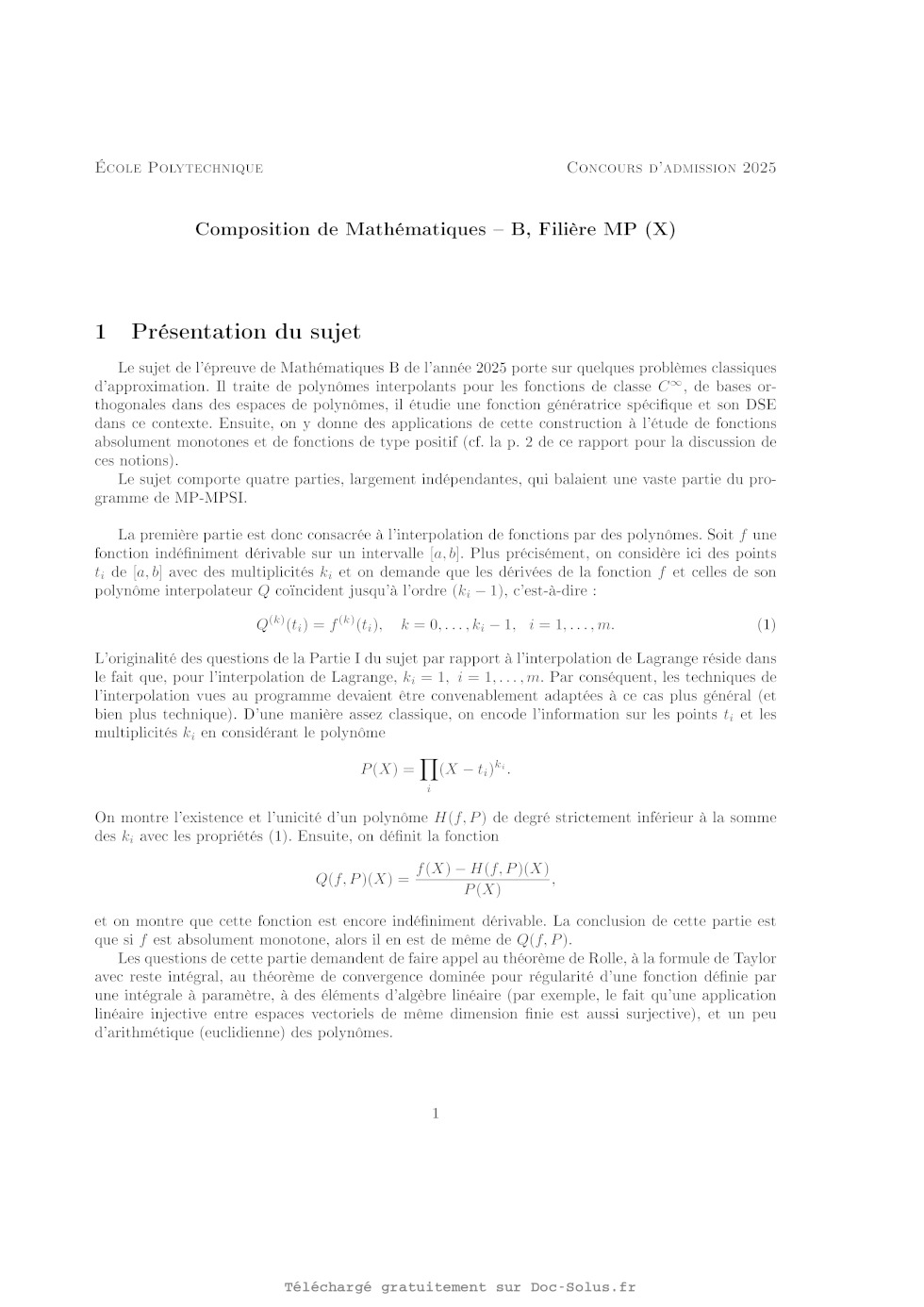 Soit a et b deux nombres réels tels que a < b. Soit h une fonction C de [a, b] dans R. On fixe un entier N 1. On dit que h s'annule à l'ordre N dans [a, b] s'il existe P des nombres a c1 < c2 < · · · < cm b et des entiers strictement positifs k1 , . . . , km tels que m i=1 ki = N et, pour tout entier 1 i m et tout entier 0 k < ki , on a h(k) (ci ) = 0. 1a. Soit N 1 un entier. Montrer que si h s'annule à l'ordre N + 1 dans [a, b], alors h0 s'annule à l'ordre N dans [a, b]. 1b. Pour tout entier N 1, montrer que si h s'annule à l'ordre N + 1 dans [a, b], il existe c [a, b] tel que h(N ) (c) = 0. On fixe, pour le reste de cette partie, f une fonction de classe C de [a, b] dans R. Soit P R[X] un polynôme non nul, scindé dans R et dont toutes les racines sont dans ]a, b[. On note a < t1 < · · · < tm < b les racines de P et, pour tout entier 1 i m, on note ki le plus petit entier tel que P (ki ) (ti ) 6= 0. 2a. Montrer que si Q R[X] est un polynôme tel que deg(Q) < deg(P ) et, pour tout entier 1 i m et tout entier 0 k < ki , Q(k) (ti ) = 0, alors Q = 0. 2b. Montrer qu'il existe un unique polynôme H(f, P ) R[X] tel que deg(H(f, P )) < deg(P ) et tel que, pour tout entier 1 i m et tout entier 0 k < ki , H(f, P )(k) (ti ) = f (k) (ti ). Pour t [a, b] r {t1 , . . . , tm }. On pose Q(f, P )(t) = f (t) - H(f, P )(t) . (t - t1 )k1 · · · (t - tm )km 1 3a. On pose g = f -H(f, P ). Montrer que, pour tout entier 1 i m et tout réel x [a, b], on a Z 1 v ki -1 (ki ) ki f (x) - H(f, P )(x) = (x - ti ) g (ti v + x(1 - v)) dv. 0 (ki - 1)! 3b. Montrer que la fonction Q(f, P ) se prolonge de façon unique en une fonction de classe C de [a, b] dans R. 4a. Soit s0 [a, b] et soit un entier n 1. Montrer que Q(f, (X - s0 )n )(s0 ) = f (n) (s0 ) . n! 4b. Soient P1 , P2 R[X] deux polynômes unitaires et scindés dans ]a, b[. Montrer que H(f, P1 P2 ) = H(f, P1 ) + P1 H(Q(f, P1 ), P2 ) et Q(f, P1 P2 ) = Q(Q(f, P1 ), P2 ). On fixe t [a, b] r {t1 , . . . , tm }. Pour tout s [a, b], on pose m Y Qt (s) = f (s) - H(f, P )(s) - Q(f, P )(t) (s - ti )ki . i=1 5a. Montrer que la fonction Qt s'annule à l'ordre deg(P )+1 dans l'intervalle [min(t, t1 ), max(t, tm )]. 5b. En déduire que si P est unitaire, il existe [min(t, t1 ), max(t, tm )] tel que f (t) - H(f, P )(t) = f (deg(P )) () P (t). deg(P )! On dit qu'une fonction h de [a, b] dans R est absolument monotone sur un intervalle [a, b] si elle est de classe C sur [a, b] et si, pour tout entier n 0, la fonction h(n) est à valeurs positives sur [a, b]. En particulier h est à valeurs positives. 6. On suppose que f est absolument monotone sur [a, b]. Montrer que, pour tout polynôme P R[X] scindé dans ]a, b[, la fonction Q(f, P ) est absolument monotone sur [a, b]. Deuxième partie Soit I = [-1, 1]. On fixe un entier n 2 pour toute cette partie. Soit f : I ]0, +[ une fonction continue. On rappelle que l'on définit un produit scalaire sur Rn [X] en posant, pour tous P, Q R[X], Z 1 hP, Qi = P (x)Q(x)f (x) dx. -1 Soit D Rn [X] un polynôme ayant n racines réelles distinctes r1 > · · · > rn