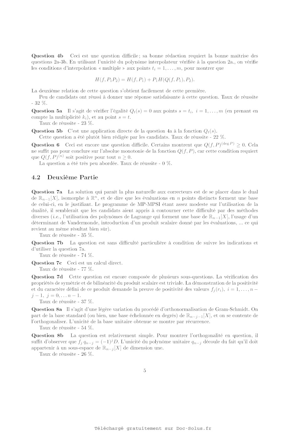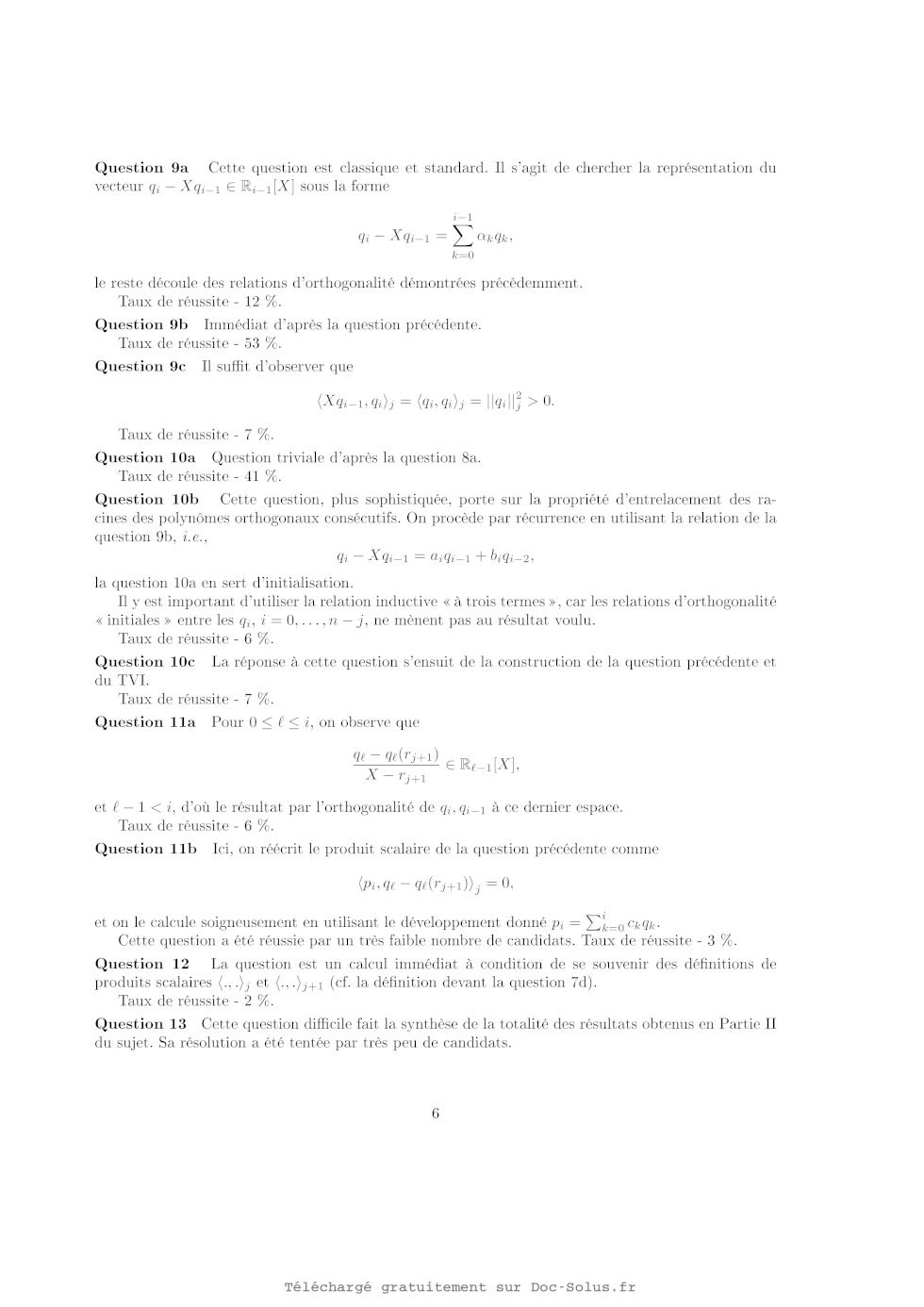 9c. Montrer que bi < 0. 10a. Pour i {0, 1}, montrer que le polynôme qi a exactement i racines dans R (noter que l'on ne demande pas que les racines appartiennent à l'intervalle I). 3 10b. Montrer que, pour tout 1 i n - j, le polynôme qi a exactement i racines réelles distinctes, que ces racines sont simples et que si x1 < x2 sont deux racines consécutives de qi , il existe une unique racine de qi-1 dans l'intervalle ]x1 , x2 [. 10c. En déduire que, pour tout 0 i n - j - 1, on a qi (rj+1 ) > 0.