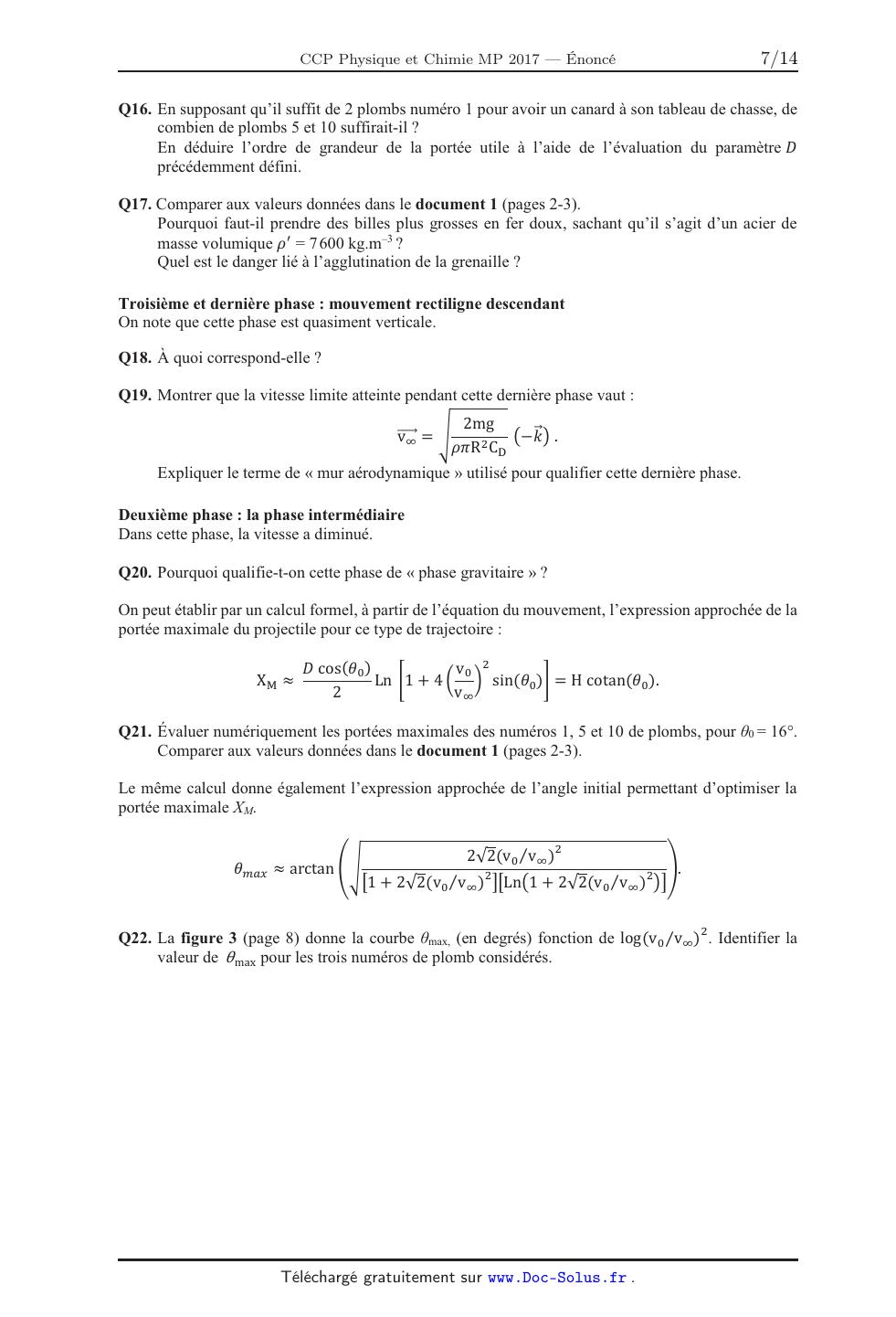 <<<; O /' X Figure 1 - Trajectoire Q4. Établir les équations paramétriques de la vitesse et de la position en fonction du temps. Q5. Quelle est la nature de cette trajectoire dite « gravitaire » ? Q6. Montrer que la portée du tir, cest-à-dire la distance atteinte par le projectile dans le plan horizontal de départ (! " #), vaut &' ( )*+,-./' 0 $% " 1 et que la hauteur maximale atteinte par le projectile vaut 23 " &' ( ,)*+( ,-/' 0 ,,5 .,4 Q7. Donner la valeur de langle /' pour laquelle la portée est maximale. Q8. Application numérique La taille des plombs est identifiée par un numéro allant de 1 à 12 qui correspond à une régression arithmétique des diamètres de 0,25 mm par numéro. Une cartouche de n° 8 possède des plombs plus petits quune de n° 4. Le tableau 1 ci-dessous donne les rayons de quelques types de plombs et certains résultats numériques obtenus en utilisant les formules ci-dessus pour une vitesse initiale &' ,= 380 m.6 78 . n° du plomb Rayon (mm) Masse 9 (g) Portée $% (km) Hauteur 23 (km) &: (m.s-1) 1 2,0 0,38 ? 5 1,5 ? ? 10 0,875 0,031 ? ? ? ? 33 ? Tableau 1 22 Reporter le tableau 1 sur votre copie en le complétant par des valeurs à deux chiffres significatifs. 4/14 Q9. Comparer la portée maximale, obtenue pour un angle !" = 45°, à la portée donnée dans le document 1 (pages 2-3) et conclure. Quel(s) autre(s) facteur(s) montre(nt) quil faut abandonner le modèle gravitaire ? Deuxième modèle : trajectoire de Tartaglia On vient de voir dans létude précédente que, pour les plombs de chasse, #" est très supérieure à #$ .% Dans ce cas, la trajectoire diffère considérablement de la trajectoire gravitaire. On distingue 3 phases : une première phase à mouvement rectiligne, une deuxième phase à trajectoire asymétrique autour dun sommet et une troisième phase de mouvement de chute verticale. Il sagit dune « trajectoire de Tartaglia », du nom du mathématicien balisticien Niccolò Tartaglia (XVIe siècle, portrait ci-dessous), qui a décrit les trajectoires (extrait ci-dessous) dun boulet de canon. Phase initiale : mouvement rectiligne ascendant Soit OX la direction de la droite trajectoire dans cette phase initiale. On note X labscisse du point M sur cette droite qui fait un angle !& avec OX et '#( sa vitesse (figure 2, page 6). 5/14 X Z ;. <7 X O Figure 2 - Trajectoire de Tartaglia Q10. Montrer que le poids dun plomb est alors négligeable devant la force de traînée. Q11. Montrer que léquation du mouvement dans la première phase se met sous la forme : #$ !" !%& '() * "+ / , (#. =( #. . 0 Q12. Quelle est la dimension de 1 ? #. en fonction de X. Q13. Établir lexpression de(Que représente le paramètre(1(?( Q14. On note 2(la distance que doit parcourir le plomb pour atteindre une vitesse 10 -3 , -4 la vitesse atteinte quand le plomb a parcouru 40 m et 56 lénergie cinétique correspondante. Le tableau 2 ci-dessous donne pour trois numéros de plomb des résultats numériques obtenus en utilisant les formules ci-dessus pour une vitesse initiale -7 (= 380 m.8 9/ . n° du plomb D (m) -7 :-3 2 ((m) -4 (m.s-1) 56 (J) 1 110 11 275 270 13,5 5 ? ? ? ? ? 10 50 17 140 170 0,45 Tableau 2 Reporter le tableau 2 sur votre copie en le complétant par des valeurs à deux chiffres significatifs. Q15. Comment définiriez-vous la portée utile dun tir ? On lit dans les journaux de chasse que le caractère mortel du tir vient en première approximation du fait que les plombs qui pénètrent dans le gibier communiquent à lanimal leur énergie cinétique créant ainsi une onde de choc fatale. 6/14 Q16. En supposant quil suffit de 2 plombs numéro 1 pour avoir un canard à son tableau de chasse, de combien de plombs 5 et 10 suffirait-il ? En déduire lordre de grandeur de la portée utile à laide de lévaluation du paramètre!" précédemment défini. Q17. Comparer aux valeurs données dans le document 1 (pages 2-3). Pourquoi faut-il prendre des billes plus grosses en fer doux, sachant quil sagit dun acier de masse volumique #$ = 7 600 kg.m3 ? Quel est le danger lié à lagglutination de la grenaille ? Troisième et dernière phase : mouvement rectiligne descendant On note que cette phase est quasiment verticale. Q18. À quoi correspond-elle ? Q19. Montrer que la vitesse limite atteinte pendant cette dernière phase vaut : +,'( 6!7 %& ) * '''''( !345 #./0 12 Expliquer le terme de « mur aérodynamique » utilisé pour qualifier cette dernière phase. Deuxième phase : la phase intermédiaire Dans cette phase, la vitesse a diminué. ! Q20. Pourquoi qualifie-t-on cette phase de « phase gravitaire » ? On peut établir par un calcul formel, à partir de léquation du mouvement, lexpression approchée de la portée maximale du projectile pour ce type de trajectoire : 89 : ! %@ 0 "!;<=>?@ A