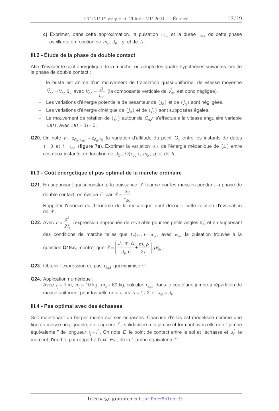 Tac l < Tac + Tos jambe droite | LT at= Ty Figure 7a - Phase de double contact Figure 7b - Phase d'oscillation gauche On adopte le modèle mécanique simplifié suivant : Chaque jambe est modélisée par une tige solide, de longueur /., de masse m., de centre de masse G; et d'extrémité F (pivot fémoral). Ces points sont notés G, et F; pour la jambe droite (Ja) et G, et À pour la jambe gauche (j,). Le buste (b) est modélisé comme un solide de masse m, et de centre de masse G,. L'ensemble (2) = Ua) (g),(b)} constitue le marcheur. On note : °g=-guü, l'accélération de la pesanteur. e J- le moment d'inertie de (j,) (respectivement de (Jg)) par rapport à l'axe F, y (respectivement F y). + J, le moment d'inertie de (/,) (respectivement de (j,)) par rapport à l'axe O,y (respectivement ©, y). 1.1 - Étude de la phase d'oscillation gauche Soit O(f) la position angulaire de (j,) par rapport à la verticale ascendante (figure 7b). Q18. En appliquant le théorème du moment cinétique à (j,) dans le référentiel du buste supposé galiléen, établir l'équation différentielle vérifiée par 8(t) pendant cette phase d'oscillation. Q19. a) Définir ce que sont des oscillations isochrones. b) Dans l'approximation des petits angles, le mouvement de (j,) est-il isochrone ? 11/19 I11.2 - c) Exprimer, dans cette approximation, la pulsation «&, et la durée 1, de cette phase oscillante en fonction de m,, J-, g etde A. Étude de la phase de double contact Afin d'évaluer le coût énergétique de la marche, on adopte les quatre hypothèses suivantes lors de la phase de double contact : Q20. IIL.3 - Q21. Q22. Q23. Q24. II1.4 - le buste est animé d'un mouvement de translation quasi-uniforme, de vitesse moyenne Vie Vi Ü, avec V, = P (la composante verticale de VW. est donc négligée). Tdc Les variations d'énergie potentielle de pesanteur de (/,) et de (J,) sont négligées. Les variations d'énergie cinétique de (j,) et de (j,) Sont supposées égales. Le mouvement de rotation de (/,) autour de O,y s'effectue à la vitesse angulaire variable Q(t), avec Q{(t -0)=0. On note h=26 (.) -Zc(o la Variation d'altitude du point G, entre les instants de dates t=0 et f=71, (figure 7a). Exprimer la Variation A& de l'énergie mécanique de (7) entre ces deux instants, en fonction de J,, Q(rt,L), m,, g etde h. Coût énergétique et pas optimal de la marche ordinaire En supposant quasi-constante la puissance % fournie par les muscles pendant la phase de A& double contact, on évalue Y par P =--, Tdc Rappeler l'énoncé du théorème de la mécanique dont découle cette relation d'évaluation de Y. p? Avec h ET (expression approchée de h valable pour les petits angles 0:) et en supposant des conditions de marche telles que Q{r,)=a®,, avec «, la pulsation trouvée à la OS ? question Q19.c, montrer que Y | Obtenir l'expression du pas p,.. qui minimise P. Application numérique : Avec /;= 1m, m,= 10 kg, m, = 60 kg, calculer p,,, dans le cas d'une jambe à répartition de masse uniforme, pour laquelle on a alors A = L [2 et J, = JF. Pas optimal avec des échasses Soit maintenant un berger monté sur ses échasses. Chacune d'elles est modélisée comme une tige de masse négligeable, de longueur /", solidarisée à la jambe et formant avec elle une " jambe équivalente " de longueur L +71. Onnote E le point de contact entre le sol et l'échasse et JE le moment d'inertie, par rapport à l'axe Ey, de la "jambe équivalente ". 12/19 Q25. a) Parmi les paramètres intervenant dans l'expression de p,,, obtenue en Q23, indiquer lesquels sont inchangés par rapport au cas sans échasses et lesquels sont à modifier. On précisera ces modifications. b) En déduire l'expression de Popt puis donner le rapport Popt en fonction de dE et de L Popt O j Dans le tableau 1 figurent les expressions des moments d'inertie d'une jambe à répartition de masse uniforme, sans ou avec échasse. Jambe seule Jambe avec échasse (contact avec le sol en O) | (contact avecle solen E) Moment d'inertie par rapport à m | Jn =-172 J=Ti(R:3rL:31 l'axe de rotation au sol O T3 j ET 3 | j Tableau 1 - Moments d'inertie dans le cas d'une jambe à répartition de masse uniforme x * Q26. a) Exprimer Popt en fonction du seul rapport _ dans le cas d'une jambe à répartition de Popt j masse uniforme. x b) Calculer Popt pour un berger adulte de longueur de jambe / 1m, monté sur des opt échasses de longueur 7 =1m. c) Justifier si la durée de la phase oscillante est changée avec les échasses. d) Des études statistiques ont montré, qu'une fois le pas optimal adopté, la vitesse moyenne de déplacement horizontal du marcheur sur un cycle est proportionnelle au pas optimal et * à la pulsation de la phase oscillante. En déduire le rapport T des vitesses de déplacement du marcheur avec et sans échasses. Commenter. Partie IV - La préparation du pastis landais À la fois moelleux et parfumé, le pastis landais (ou « pastis bourrit ») est une pâtisserie traditionnelle née au XIX° siècle, très prisée lors des fêtes locales. Il s'agit d'une brioche légère de forme tronconique parsemée de morceaux de sucre concassé (photo 4). En patois gascon, « pastis » signifie « gâteau » ou « pâte » et « pastis bourrit » veut dire « gâteau à pâte levée » (cette pâtisserie n'a donc rien à voir avec la célèbre boisson anisée !). 13/19 Dans sa recette moderne, on utilise de la levure (ou poudre à lever) dont l'objectif est de libérer du dioxyde de carbone gazeux pour faire gonfler la pâte lors de la cuisson. Une fois la levure mélangée aux ingrédients et humidifiée, le gaz est obtenu par une réaction acidobasique faisant intervenir l'ion hydrogénocarbonate HCO:. Soit la composition d'un sachet de 15 g de levure : * 4 g d'amidon ; * m 9 de diphosphate disodique Na;H;,P,0, (ou dihydrogénodiphosphate de sodium) ; * m, 9 de bicarbonate de sodium NaHCO, (ou hydrogénocarbonate de sodium). L'amidon joue le rôle de stabilisateur