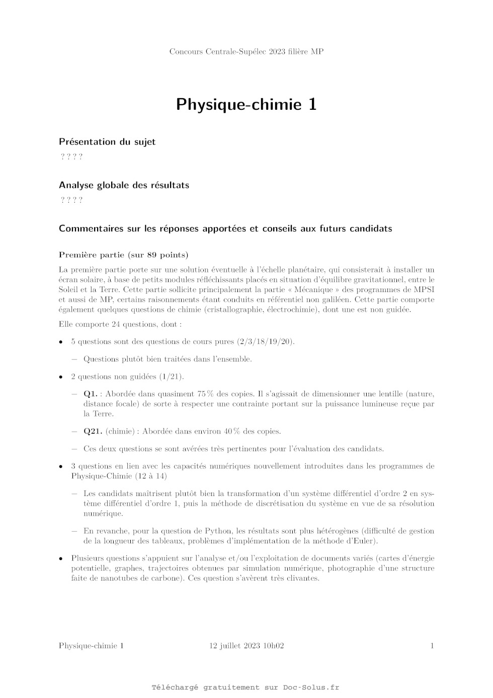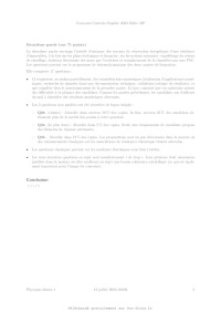 < Ç Nom 5 " Prénom CONCOURS CENTRRLE-SUPÉLEC Épr euve : Phusique-chimie | MP Ne rien porter sur cette feuille avant d'avoir complètement rempli l'entête Feuille / --10 --1.5 =1.0 _0.5 0.0 0.5 1.0 1.5 Figure À Courbes isoénergies potentielles dans le référentiel (À) d'étude. Par souci de lisibilité, la carte est ne correspondant pas au vrai rapport de masse Mr du système {Terre+Soleil } ue _ 1 représentée pour a -- 10 M luametatex 2.0932 20211203 LMTX Ne rien écrire dans la partie barrée P056-DR/2023-03-20 20:27:39 Question 14 Compléter les lignes de code dans les cadres prévus à cet effet. Dans la zone quadrillée, des lignes de code complètes sont attendues. import numpy as np # np.pi fournit la valeur du nombre pi=3.14151.... def resol(init, tau_f, N): Hunt init : ndarray, vecteur contenant les valeurs initiales de u, v, w, up, vp, wp tau_f : float, on resout le probleme sur l'intervalle de temps [0, tau_f] N : int, nombre de points de calcul global À, B, C # coefficients du système d'équations h = # pas temporel tau = np.arange(0, tau_f, h) u = np.zeros(N); v = np.zeros(N); w = np.zeros(N) # vecteurs contenant N zéros up = np.zeros(N); vp = np.zeros(N); wp = np.zeros(N) ul[0O], vlO], w[O]I, uplO], vplOl, wplO] = return tau, u, V, W, up, Vp, wp Figure B Fonction de résolution numérique du système d'équations (3) R407C Asereo. Version 3.5.0 50.0 100.0 150.0 200.0 250.0 300.0 350.0 400.0 CSELEUES 500.0 550.0 600.0 ST CON OL US 0,009 0.010 40.0 80 0 ELrE a QUE co & 0.020 UE LS 40 " 0.030 30 o 0.040 20 N NE F Ne 8.0 te a Se 7.0 Ë À 0.070 6.0 - . ÿ 0.080 : I Recto) 5.0 GS TO) l y 4.0 no o£ © 3.0 S 0.150 pr "+ Ô 5 en 4 4 F", 0.200 o = 2.0 x: G Fe : n @ Ce 0.300 5 Y él 40 7 0.400 : porn L y Be 0.80 - { eee CYR LT S 0.700 0.60 | Eu j e eee ET no TS 0.40 > d 1