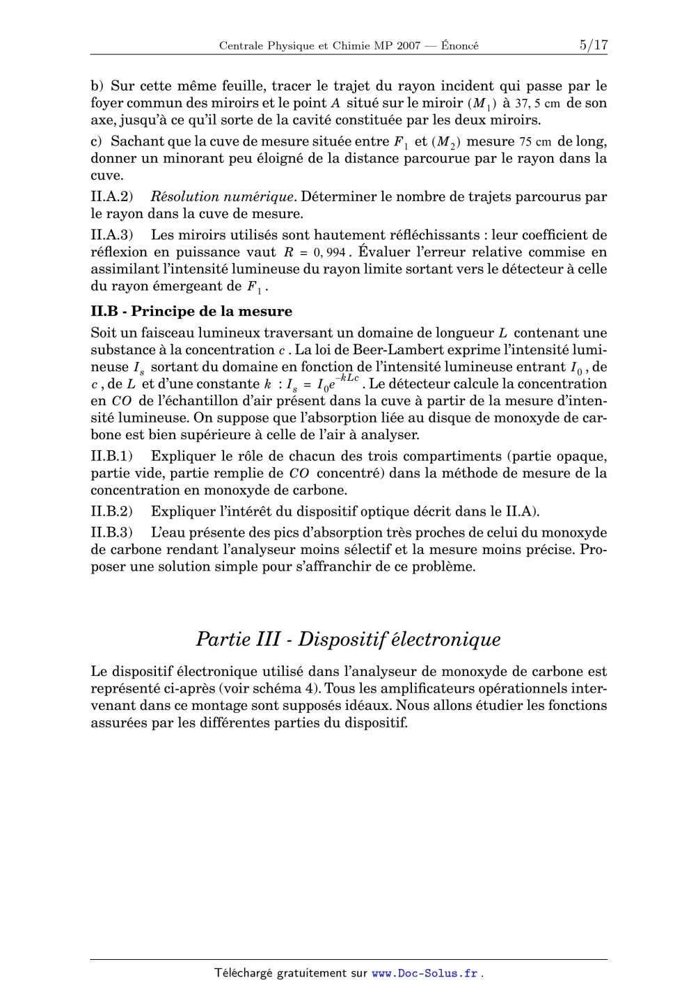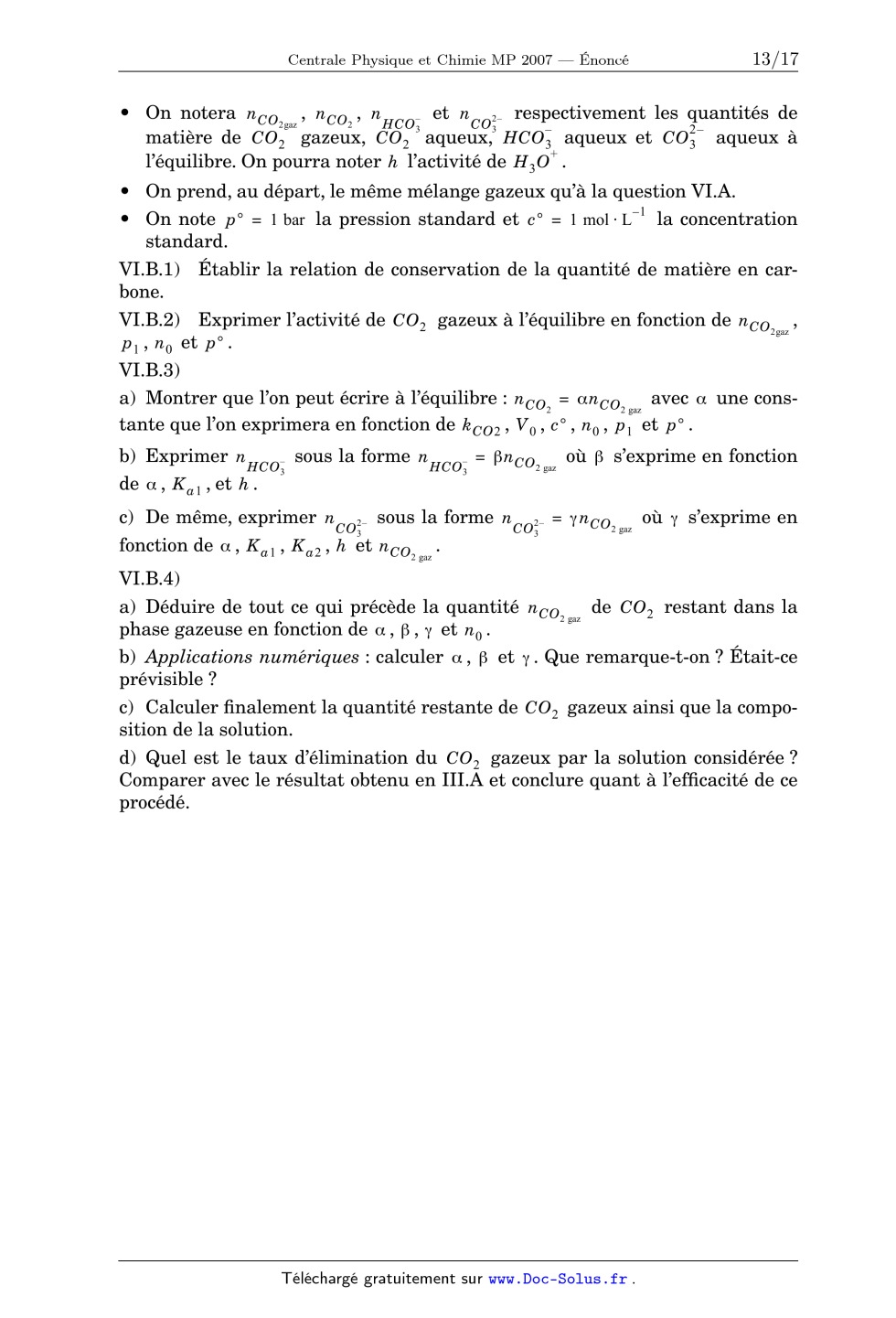 CO+HZO <_--, COZ+H2 (5) V.C.l) La constante d'équilibre de cette réaction diminue de O, 36% quand la température augmente de 1100 K à 1101 K. a) En déduire l'enthalpie standard de cette réaction à 1100 K. b) Comparer à la valeur obtenue en utilisant les données thermodynamiques fournies. Commenter. V.C.2) On se place à 1500 K et 1,0 bar. Le taux de dissociation de la vapeur d'eau en dihydrogène et dioxygène est de 2, 21 - 10_4 . Quant au taux de dissocia- tion du dioxyde de carbone en monoxyde de carbone et dioxygène, il vaut 4, 8 - 10_4 (le taux de dissociation est égal au nombre de moles dissociées divisé par le nombre de moles initial). a) Écrire ces réactions de dissociation -- réactions (6) et (7) -- puis calculer leur constante d'équilibre. Concours Centrale-Supé/ec 2007 11/14 PH YSIQUE--CHIMIE Filière MP b) En déduire la constante d'équilibre K 5° à 1500 K. V.C.3) On se propose à présent d'étudier l'importance des proportions initia-- les des produits sur le rendement de la réaction. Soit un mélange réactif ne com-- portant que du CO et H 20 , en proportions quelconques. Soit r le rapport x(HZO)/x(CO) des fractions molaires de H 20 et CO à l'équilibre. La tempé- rature est fixée à 1500 K et la pression totale à 19° . a) Trouver la relation liant, à l'équilibre, x(CO) , r et K 5° . b) Déterminer les proportions initiales des réactifs pour qu'à l'équilibre la frac- tion molaire de dioxyde de carbone soit maximale. V.C.4) Soit un mélange initial (rejet) contenant 10 moles de CO , 30 moles de CO2 et 40 moles de N2 . On se place toujours à 1500 K et 1,0 bar. a) Quelle quantité d'eau doit-on ajouter pour qu'il ne reste plus que 1% du CO initial dans le mélange '? Ce procédé paraît-il rentable ? b) Donner la composition finale, ainsi que les pressions partielles, du mélange obtenu. Partie VI - Propriétés de co2 en solution aqueuse On s'intéresse dans cette partie à la solubilité de CO2 en solution aqueuse à 298 K . VI.A - Solubilité de 002 dans l'eau pure On dispose d'un mélange gazeux contenant n0 : 0, 1 mol de 002 sous la pres- sion partielle de p1 : 0, 3 bar et d'un litre d'eau distillée. Le système est fermé et de volume constant. On suppose de plus que la dissolution se fait sans chan-- gement de volume de la solution aqueuse. VI.A.1) Quelle est la pression partielle de CO2 à l'équilibre, ainsi que la concentration en COZ(aq), en négligeant les propriétés acido-basiques du dioxyde de carbone '? VI.A.2) En réalité, CO2 a est un diacide faible (ne tenir compte que de la pre- mière acidité). En partant de la concentration déterminée à la question précé-- dente, déterminer le pH que l'on obtiendrait, ainsi que la composition de la solution. L'hypothèse faite à la question précédente est--elle justifiée ? VI.A.3) Quelle est la proportion de 002 éliminée du mélange gazeux ? VI.B - Solubilité en milieu basique Cette méthode ne permettant pas d'éliminer assez de CO2 , on se propose d'uti- \ liser à présent une solution tamponnée a pH : 12. On dispose d'un volume V0 = 1 L de cette solution. Concours Centrale-Supé/ec 2007 12/14 PH YSIQUE--CHIMIE Filière MP ° On notera nCO2g , "CO, , nHCO_ et 17.0 2_ respectivement les quantités de matière de 002g gazeux, CO2 aqueux, 3QHCO aqueux et CO? aqueux à l'équilibre. On pourra noter h l'activité de H3 O3+ . ° On prend, au départ, le même mélange gazeux qu'à la question VIA. ° On note p° : 1bar la pression standard et c° : 1 mol - L_1 la concentration standard. VI.B.1) Établir la relation de conservation de la quantité de matière en car- bone. VIB. 2) Exprimer l'activité de 002 gazeux à l'équilibre en fonction de "CO p1 , n() et p0 VI.B.8) a) Montrer que l'on peut écrire à l'équilibre : "CO, : ochO2gaz avec oc une cons-- 2 gaz, tante ue l'on ex rimera en fonction de k , V , c° , n , p et p° . q P 002 0 0 1 b) Expr1mer nH00g de oc, K et h . sous la forme n _ = n où s'ex rime en fonction HCO3 B C{OZ gaz fi p al ' c) De même, exprimer n 2_ sous la forme n co3 co? fonction de oc,Ka1 , Ka2, h et "CO, . gaz VI. B. 4) a) Déduire de tout ce qui précède la quantité "CO... de 002 restant dans la phase gazeuse en fonction de 01, 5, y et "0- \ , - = x mm en YnCOZgaz ou y se p é b) Applications numériques . calculer oc, [% et y. Que remarque--t-on ? Était-ce prévisible '? c) Calculer finalement la quantité restante de CO2 gazeux ainsi que la compo- sition de la solution. (1) Quel est le taux d'élimination du CO2 gazeux par la solution considérée ? Comparer avec le résultat obtenu en III.A et conclure quant à l'efficacité de ce procédé. Concours Centrale-Supé/ec 2007 13/14 PH YSIQUE--CHIMIE Filière MP Données : à 298 K Constante des gaz parfaits : R = 8, 314 J.K'1.mol'1 Numéros atomiques : C = 6 ; O = 8 Variété de carbone Graphite Diamant a°(kJ - mol--1) 0 2, 85 Volume molaire (cm3 _m01--1) 5,21 3, 38 Grandeurs thermodynamiques ESpèce C(s) CO(e) C02(Ë) 02(g) H20(g) AfH°(kJ °m01_1) --110, 4 --393, 1 --241, 8 S°(J -- 1(1 'mol_1) 5, 7 197, 6 213, 7 205,0 188, 5 Constante de dissolution du dioxyde de carbone : --2 COZ(gaZ)Z C02(aqueux) kCOZ : 3' 33 . 10 PKa des couples du 002 : co,aq/Hcog pKOE1 : 6, 3 Hcog/Co32-- pKa2 = 10, 3. o o . FIN . o 0 Concours Centrale-Supélec 2007 14/14 Annexe du sujet de Physique-Chimie Filière MP Annexe du sujet de Physique-Chimie (M) A Concours Centrale-Supé/ec 2007 1/3 Annexe du sujet de Physique-Chimie Filière MP Réponse n° 2 papier log log Concours Centrale-Supé/ec 2007 2/3 Annexe du sujet de Physique-Chimie Filière MP Réponse 3 Diagramme d'Ellingham ArG° (kJ.mol'1) A 500 1000 1500 2000 T 99 l l l I V -100--- '2°°" @ _300__ .............................. ........................... 980 K -400---- __ÏÇZZZ::= ;::::j_'_'j__ |î| _500__ .................................. -600--- Concours Centrale-Supé/ec 2007 3/3