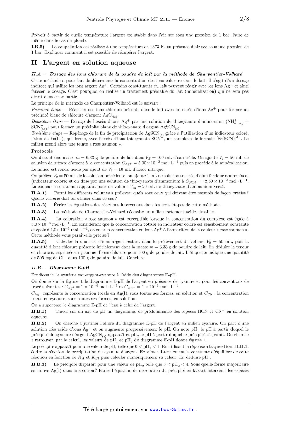 solution de nitrate d'argent a la concentration CAg+ = 5,00 >< 10"2 mol - L_1 puis on procède à la minéralisation. Le milieu est rendu acide par ajout de V2 = 10 mL d'acide nitrique. On prélève V0 = 50 mL de la solution précédente, on ajoute 1 mL de solution saturée d'alun ferrique ammoniacal (indicateur coloré) et on dose par une solution de thiocyanate d'ammonium a CSCN-- = 2,50 >< 10"2 mol -- L". La couleur rose saumon apparaît pour un volume Veq = 20 mL de thiocyanate d'ammonium versé. II.A.1) Parmi les différents volumes à prélever, quels sont ceux qui doivent être mesurés de façon précise ? Quelle verrerie doit-on utiliser dans ce cas? II.A.2) Écrire les équations des réactions intervenant dans les trois étapes de cette méthode. II.A.3) La méthode de Charpentier-Volhard nécessite un milieu fortement acide. Justifier. II.A.4) La coloration << rose saumon » est perceptible lorsque la concentration du complexe est égale à 5,0 >< 10_6 mol -- L_1. En considérant que la concentration totale en indicateur coloré est sensiblement constante et égale à 1,0 >< 10"5 mol-L_1, calculer la concentration en ions Ag+ à l'apparition de la couleur « rose saumon ». Cette méthode vous paraît-elle précise ? II.A.5) Calculer la quantité d'ions argent restant dans le prélèvement de volume V0 = 50 mL, puis la quantité d'ions chlorure présente initialement dans la masse m = 6,33 g de poudre de lait. En déduire la teneur en chlorure, exprimée en gramme d'ions chlorure pour 100 g de poudre de lait. L'étiquette indique une quantité de 505 mg de Cl" dans 100 g de poudre de lait. Conclure. II.B -- Diagramme E-pH Étudions ici le système eau-argent-cyanure a l'aide des diagrammes E-pH. On donne sur la figure 1 le diagramme E--pH de l'argent en présence de cyanure et pour les conventions de tracé suivantes : CAg+ = 1 >< 10"4 mol - L_1 et CCN-- : 1 >< 10_3 mol - L_1. + , ( . c . _ ( . C'Ag re resente la concentrat10n totale en A I , sous toutes ses formes, en solution et CCN la concentratwn totale en cyanure, sous toutes ses formes, en solution. On a superposé le diagramme E--pH de l'eau a celui de l'argent. II.B.1) Tracer sur un axe de pH un diagramme de prédominance des espèces HCN et CN_ en solution aqueuse. II.B.2) On cherche à justifier l'allure du diagramme E--pH de l'argent en milieu cyanuré. On part d'une solution très acide d'ions Ag+ et on augmente progressivement le pH. On note pH1 le pH a partir duquel le précipité de cyanure d'argent AgCN(S) apparaît et pH2 le pH a partir duquel le précipité disparaît. On cherche a retrouver, par le calcul, les valeurs de pH1 et pH2 du diagramme E--pH donné figure 1. Le précipité apparaît pour une valeur de pH1 telle que 0 < pH1 < 1. En utilisant la réponse a la question II.B.1, écrire la réaction de précipitation du cyanure d'argent. Exprimer littéralement la constante d'équilibre de cette réaction en fonction de K A et K 54 puis calculer numériquement sa valeur. En déduire pH1. II.B.3) Le précipité disparaît pour une valeur de pH2 telle que 3 < pH2 < 4. Sous quelle forme majoritaire se trouve Ag(I) dans la solution? Écrire l'équation de dissolution du précipité en faisant intervenir les espèces ]. | | | | | | | | | | | | | | >