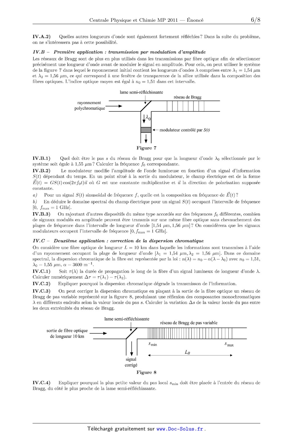 _<-- modulateur contrôlé par S(t) Figure 7 IV.B.1) Quel doit être le pas s du réseau de Bragg pour que la longueur d'onde À0 sélectionnée par le système soit égale à 1,55 ,um ? Calculer la fréquence fg correspondante. IV.B.2) Le modulateur modifie l'amplitude de l'onde lumineuse en fonction d'un signal d'information S' (t) dépendant du temps. En un point situé a la sortie du modulateur, le champ électrique est de la forme Ë(t) = GS(t) cos(27rfmfi)ü où G est une constante multiplicative et ii la direction de polarisation supposée constante. a) Pour un signal S (t) sinusoïdal de fréquence f, quelle est la composition en fréquence de Ë (t) ? b) En déduire le domaine spectral du champ électrique pour un signal S (t) occupant l'intervalle de fréquence [O, fmax = 1 GHz]. IV.B.3) On rajoutant d'autres dispositifs du même type accordés sur des fréquences fo différentes, combien de signaux modulés en amplitude peuvent être transmis sur une même fibre optique sans chevauchement des plages de fréquence dans l'intervalle de longueur d'onde [l, 54 um, 1,56 um]? On considèrera que les signaux modulateurs occupent l'intervalle de fréquence [O, fmax-- -- 1 GHz]. I V.C -- Deuæième application : correction de la dispersion chromatique On considère une fibre optique de longueur L = 10 km dans laquelle les informations sont transmises à l'aide d'un rayonnement occupant la plage de longueur d'onde [À1 = 1,54 um,À2 = 1,56 um]. Dans ce domaine spectral, la dispersion chromatique de la fibre est représentée par la loi : n(À) = no -- a(À -- À0) avec no = 1,51, )... = 1,55 ,am, a = 3600 m"'. IV.C.1) Soit T(À) la durée de propagation le long de la fibre d'un signal lumineux de longueur d'onde À. Calculer numériquement AT = T(À1) -- T(À2). IV.C.2) Expliquer pourquoi la dispersion chromatique dégrade la transmisson de l'information. IV.C.3) On peut corriger la dispersion chromatique en plaçant a la sortie de la fibre optique un réseau de Bragg de pas variable représenté sur la figure 8, produisant une réflexion des composantes monochromatiques À en différents endroits selon la valeur locale du pas 8. Calculer la variation As de la valeur locale du pas entre les deux extrémités du réseau de Bragg. lame semi--réfléchissante réseau de Bragg de pas variable sortie de fibre optique de longueur 10 km signal corrigé Figure 8 IV.C.4) Expliquer pourquoi la plus petite valeur du pas local smin doit être placée à l'entrée du réseau de Bragg, du côté le plus proche de la lame semi--réfléchissante. IV.C.5) Calculer la longueur totale LB du réseau de Bragg nécessaire a la correction de la dispersion chromatique. I V.D -- Étude de la bande passante On revient à l'étude d'un réseau de Bragg d'axe x'æ contenant N couches réfléchissantes, considérées infiniment minces, placées régulièrement en m = qs, q désignant un entier compris entre 0 et N -- 1 (figure 6). En notation complexe, pour des rayonnements monochromatiques se propageant vers les m croissants ou vers les a: décroissants, le coefficient de réflexion [ et le coefiîcient de transmission 2 du champ électrique à travers une couche s'écrivent [ = z\/1-- X2» ; = x, où x est un réel positif légèrement inférieur à 1. De part et d'autre de la couche réfléchissante placée en x = qs, le champ électrique est la somme de deux ondes progressives se propageant en sens inverse, et s'écrit sous la forme : : (Aqe--ik(m--qs) __ âqeik(x--qs))eiwtê--y : (Qqe--ik(æ--qs) __ Qqeik(m--qs))eiwtêy 96 EUR l(q -- 1)8J15[ EUR lqs,(q+ 1)8[ lOEi lüji IV.D.1) Pour simplifier, nous assimilerons le milieu de la fibre optique à du vide d'indice n = 1. Donner l'expression de 10 en fonction de la longueur d'onde À des ondes lumineuses. IV.D.2) Exprimer Eq et Q,, en fonction de Aq, Q,], [, t. En déduire, en fonction de x, les coefficients de la matrice P telle que : IV.D.3) Exprimer Q,, et Q,, en fonction de Aq+1, Eq+1, kr, s. En déduire les coefficients de la matrice Q telle que : IV.D.4) Comme il n'y a pas d'onde réfléchie pour 55 > (N -- 1)s, on peut écrire