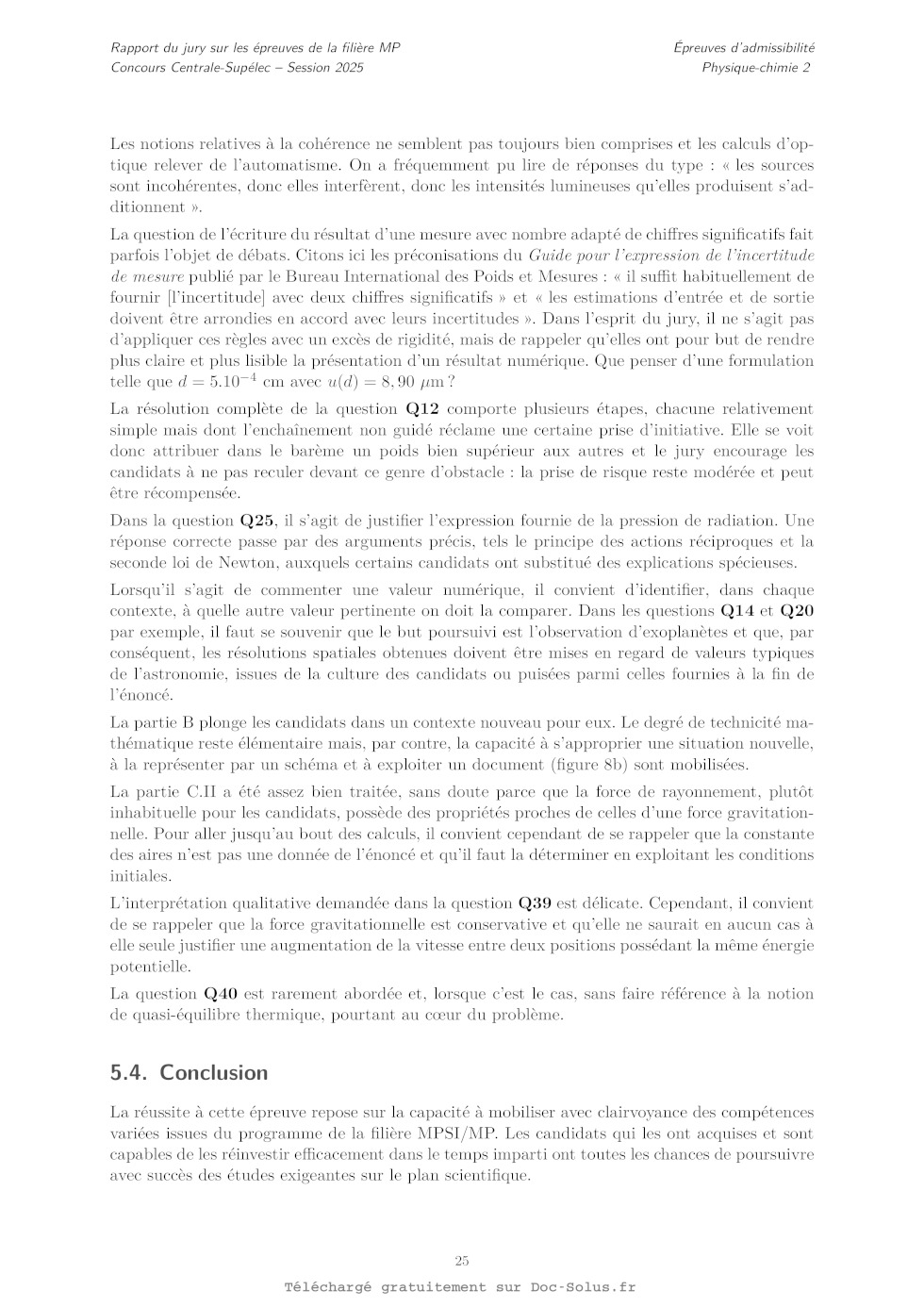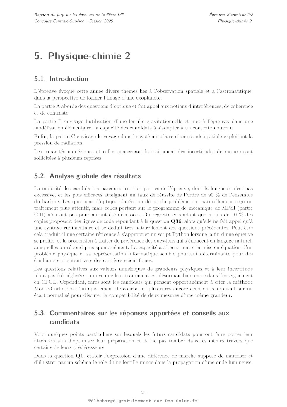 fonction de r dans le cas où S < Slim . Donner enfin, sans justification, la nature de la trajectoire de la sonde selon la valeur de son énergie mécanique. Pour simplifier l'étude, on suppose que la sonde doit avoir suffisamment d'énergie pour atteindre l'infini. Q32. Exprimer l'énergie mécanique de la sonde juste après l'ouverture de la voile solaire. Expliciter la condition sur cette énergie mécanique pour que la sonde puisse atteindre l'infini. En déduire la surface minimale de la voile de la sonde. En réalité, le mouvement de la sonde avec sa voile est plus complexe que ce qui a été étudié ici. La taille de la surface de la voile trouvée à la question précédente est cependant une bonne estimation de sa taille réelle. III Influence de l'orientation de la voile sur le mouvement e#" On reprend l'étude précédente dans le référentiel héliocentrique supposé galiléen, mais on s'intéresse maintenant à la situation où la voile a une orientation quelconque. On repère toujours la position de la sonde (notée M sur le schéma figure 11 où la voile est représentée) par les coordonnées polaires centrées sur le Soleil noté O. On note #" u le vecteur normal à la voile solaire et l'angle (e#"r ; #" u ) ( est compris entre -/2 et +/2). Les conditions initiales sont r(t = 0) = RT , (t = 0) = 0, r(t = 0) = 0 et (t = 0) = T , où T a été introduit dans la section II. 8 / 12 #" u M O Figure 11 e#"r La force de pression de radiation subie par la sonde sur la voile de surface S s'écrit maintenant R2 #" Fr = pT 2T cos2 () S #" u r avec pT = 8,0 × 10-6 Pa la pression de radiation au niveau de l'orbite terrestre. On veut étudier la dynamique de la sonde sur une durée de 5 mois par une démarche de résolution numérique. On introduit le vecteur position adimensionné #" (de norme ) et le temps adimensionné définis par : # " OM = RT #" et = T t . Q33. Montrer que l'équation du mouvement se met sous la forme d2 #" 1 = - 2 e#"r + 2 cos2 #" u. d 2 On exprimera la constante réelle positive en fonction des paramètres du problème. Proposer une signification physique pour . Q34. Montrer que l'équation différentielle trouvée à la question précédente peut se réécrire sous la forme d'un système d d de quatre équations différentielles du premier ordre portant sur les grandeurs , , d et d . Des lignes de code Python sont présentées figure 12. L'objectif est d'avoir un script permettant de calculer, pour 5 différentes valeurs de , la valeur finale de après avoir simulé le mouvement de la sonde entre = 0 et = 2 × 12 , ce qui correspond à la durée de 5 mois visée. La fonction odeint du module scipy.integrate, pour laquelle des informations sont fournies en annexe, est utilisée pour résoudre le système d'équations différentielles trouvé à la question Q34. Cette fonction odeint appelle une fonction voile_solaire_beta non définie dans le script de la figure 12. d d et d . En déduire la liste à fournir à la ligne 7 du code de Q35. Déterminer les valeurs à = 0 des grandeurs , , d la figure 12. Q36. Proposer un code pour la fonction voile_solaire_beta en respectant la syntaxe attendue par la fonction odeint. 1 2 import numpy as np import s c i p y . i n t e g r a t e 3 # Val e u r numé r i q u e du c o e f f i c i e n t e t a eta = 0.41 6 # Conditions i n i t i a l e s pour [ rho , t h e t a , d rho /d tau , d t h e t a /d tau ] 7 cond_init = [ . . . ] # I n c o m p l e t ( v o i r q u e s t i o n Q35 ) 8 # Tableau ( a r r a y ) c o n t e n a n t l e s i n s t a n t s pour l e s q u e l s on veut r é s o u d r e l ' é q u a t i o n 9 array_temps = np . l i n s p a c e ( 0 , 2 np . p i 5 / 1 2 , num=5001) 10 # Nombre de v a l e u r s pour b e t a 11 n_valeurs_beta = 361 12 # Tableau ( a r r a y ) c o n t e n a n t l e s v a l e u r s de b e t a ( en d e g r é s ) 13 # pour l e s q u e l l e s on veut r é s o u d r e l ' é q u a t i o n du mouvement 14 array_beta = np . l i n s p a c e ( -90 , 9 0 , num=n_valeurs_beta , e n d p o i n t=True ) 15 # Tableau i n i t i a l e m e n t r e m p l i de z é r o s dans l e q u e l on va s t o c k e r 16 # l a v a l e u r f i n a l e de rho pour chaque v a l e u r de b e t a 17 a r r a y _ r h o f i n a l = np . z e r o s ( n_valeurs_beta ) 4 5 18 # On b o u c l e s u r l e s v a l e u r s de b e t a f o r i in range ( n_valeurs_beta ) : 21 b e t a = np . p i array_beta [ i ] / 180 22 # On r é s o u t l e s y s t ème d ' é q u a t i o n s d i f f é r e n t i e l l e s 23 sol = scipy . integrate . odeint ( 24 v o i l e _ s o l a i r e _ b e t a , c o n d _ i n i t , array_temps , a r g s =( eta , b e t a ) 25 ) 26 # On e n r e g i s t r e l a d e r n i è r e v a l e u r de rho dans l e t a b l e a u a r r a y _ r h o f i n a l 27 a r r a y _ r h o f i n a l [ i ] = s o l [ -1 , 0 ] 19 20 Figure 12 Script Python (incomplet) de simulation. 9 / 12 La résolution numérique, réalisée avec un script complété, permet d'obtenir la figure 13 qui donne la représentation de l'évolution de la valeur finale f de , après 5 mois de voyage de la sonde, en fonction de l'angle . 2,0 f 1,5 Q37. Expliquer pourquoi f = 1 lorsque = -90 et = 90 . 1,0 Q38. En utilisant le résultat de cette simulation, déterminer la valeur optimale de , notée e , pour que la sonde s'éloigne le plus loin possible du Soleil, ainsi que la valeur optimale de , notée a , pour que la sonde s'approche le plus possible du Soleil au bout de 5 mois. -90 -60 -30 0 30 (degres) 60 90 Figure 13 IV Trajectoire proposée Il se trouve que, pour atteindre le foyer image gravitationnel du Soleil le plus vite possible avec une voile solaire, il est nécessaire de commencer par se rapprocher du Soleil. Ainsi, on réalise la simulation suivante : partant d'une orbite circulaire de rayon RT , on déploie la voile solaire avec un angle a (défini à la question Q38). La sonde se rapproche alors du Soleil. Lorsqu'elle arrive à une distance rchangement 