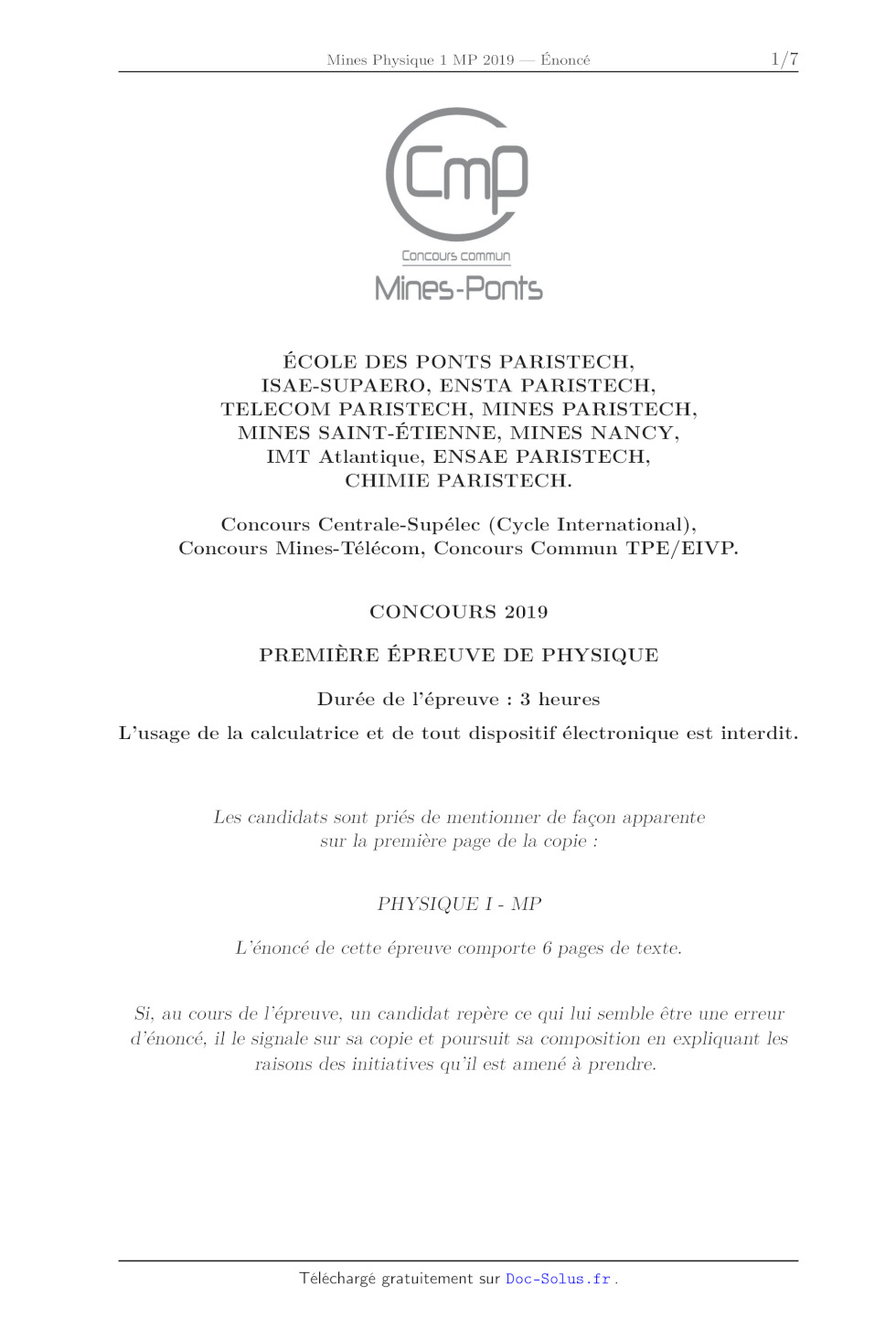 A2019 --- PHYSIQUE I MP