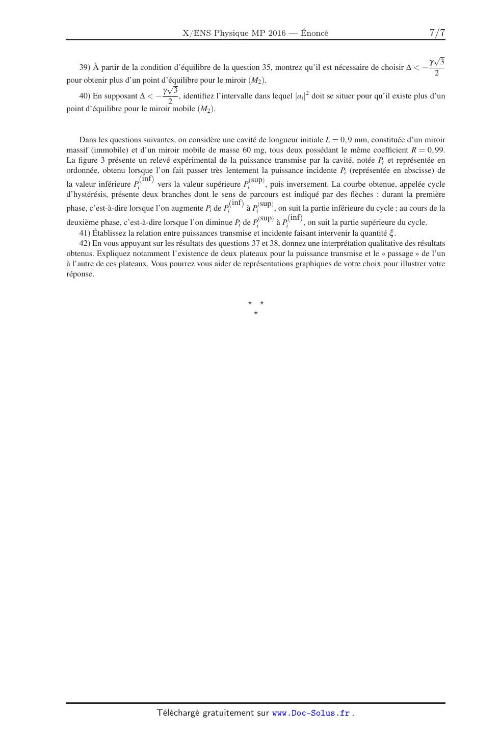 le demi-espace z < 0 de même direction de polarisation que l'onde incidente, de sorte que le champ total en amont de la cavité (dans la zone notée I sur la figure 1) s'écrit ~EI (z,t) = [Ei (z,t) + Er (z,t)]~ex h z i Er (z,t) = Er exp i t + c (3) (4) où Er désigne l'amplitude de l'onde réfléchie à l'origine des temps et des coordonnées, a priori complexe. De même, le champ créé à l'intérieur de la cavité (zone II) prend la forme générale ~EII (z,t) = [E+ (z,t) + E- (z,t)]~ex h z i E+ (z,t) = E+ exp i t - h cz i E- (z,t) = E- exp i t + c (5) (6) (7) Enfin, le champ au-delà de la cavité (zone III) s'écrit ~EIII (z,t) = [Et (z,t)~ex ] h z i Et (z,t) = Et exp i t - c (8) (9) Ces différents champs sont représentés sur la figure 1 ainsi que les vecteurs d'ondes associés ~ki =~k+ =~kt ~kr =~k- ~ez c = - ~ez c = 1) Que représentent les coefficients R et T ? Que signifie physiquement la relation R + T = 1 ? 2) Justifiez la nature progressive choisie pour le champ ~EIII (z,t). 2 (10) (11) 3) Au moyen des coefficients de réflexion et transmission, écrivez trois relations entre les amplitudes Ei , E+ , E- et Et traduisant la transmission/réflexion en z = 0 et z = L. 4) Déduisez les amplitudes E+ , E- et Et en fonction de Ei , , L, c, R et T . Vous mettrez le résultat sous la forme E+ = () Ei T r E- = - () Et = () Ei (12) 2iL R Ei exp - T c (13) (14) et vérifierez que la fonction () prend la forme () T 2iL 1 - R exp - c (15) 2 5) Exprimez la fonction | ()| et tracez sa représentation graphique pour R = 0, 9 en fonction de la variable L réduite . c 6) Montrez l'existence d'une famille discrète de pulsations nN du champ incident pour lesquelles ||2 est maximale. À quoi ces pulsations correspondent-elles physiquement pour l'intensité transmise ? 7) Montrez que l'intensité (moyennée sur une période) III (z) à l'intérieur de la cavité se met sous la forme 1 III (z) = | ()|2 L (, z)Ii où Ii désigne l'intensité incidente et L (, z) un terme que vous exprimerez en foncT tion de R et (z - L) /c. 8) Tracez les courbes représentatives de L (n , z) pour R = 0, 9 et n = 1, 2 et 3 en fonction de la variable réduite (z/L). Même question pour R = 1 ; quelle est la nature de l'onde observée à l'intérieur de la cavité dans ce cas ? 9) On revient au cas général (R < 1). En vous plaçant au voisinage d'une pulsation n déterminez une expression approchée de la fonction () puis mettez la fonction | ()|2 sous la forme | ()|2 1 - n 1+4 1 2 !2 (16) où 1 est un paramètre dont vous préciserez l'expression et la signification physique. Donnez l'expression ap2 prochée de 1 dans la limite T 1. 2 10) En vous servant des résultats précédents, établissez une analogie entre la cavité étudiée et des dispositifs rencontrés dans un (d') autre(s) domaine(s) de la physique. À partir de cette analogie, définissez un facteur de qualité pour la cavité considérée et indiquez sa signification physique. Dans les questions 11 à 15, on cherche à relier le paramètre 1 au taux de perte en énergie de la cavité. 2 Pour ce faire, on va suivre une approche particulaire. On rappelle qu'une onde électromagnétique est composée de photons, particules sans masse, dont la quantité de mouvement p et l'énergie E sont données par les formules p = h/c et E = h, où est la pulsation du rayonnement électromagnétique considéré. On admet que, lorsqu'il atteint l'un des miroirs (M1 ) ou (M2 ), un photon est transmis, sans modification de son énergie ni de sa quantité de mouvement, avec la probabilité T , tandis qu'il « rebondit », sans modification de son énergie mais avec une quantité de mouvement opposée, avec la probabilité R. 11) Exprimez le temps t mis par un photon pour parcourir une longueur de cavité. 12) Durant cet intervalle de temps, combien un photon subit-il de rebonds sur les parois de la cavité ? 3 13) Quelle est la probabilité pour ce photon de quitter la cavité pendant la durée t ? 14) Si la cavité contient, à l'instant t, n ph (t) photons, combien de photons auront quitté la cavité à l'instant (t + t) (on suppose n ph 1) ? 15) Reliez l'énergie électromagnétique Eem (t) contenue dans la cavité au nombre de photons n ph (t). En supposant n ph 1, exprimez la variation d'énergie électromagnétique (Eem )pertes entre t et t + t due aux pertes au niveau des miroirs. En assimilant (Eem )pertes et t à des éléments infinitésimaux exprimez le taux de perte de la dEem 1 cavité - . Finalement, reliez au paramètre 1 introduit à la question 9. 2 Eem dt pertes On suppose maintenant que les champs sont quasi-monochromatiques, c'est-à-dire qu'ils peuvent se mettre sous la forme de paquets d'ondes ^ h z i 1 d (17) E+ (z,t) = E+ () exp i t - c ^ h 1 z i (18) Ei () exp i t - Ei (z,t) = d, c h i autour où les fonctions E+ () et Ei () ne prennent de valeurs significatives que sur l'intervalle c - , c + 2 2 c d'une pulsation c = n où n N et . L 16) Rappelez brièvement pourquoi un paquet d'ondes de la forme précédente constitue une solution des équations de M AXWELL. 17) En utilisant la forme approchée pour () obtenue à la question 9, établissez la relation linéaire entre les composantes E+ () et Ei () dans le régime R 1. 18) Déduisez du résultat précédent l'équation différentielle vérifiée par la fonction E+ r h i c E+ - - ic E+ + Ei . (19) t 2 4L 19) On considère une cavité de longueur L = 0, 9 mm, constituée de deux miroirs de même coefficient R = 0, 99. Calculez 3000 ainsi que la longueur d'onde associée 3000 . À quel type d'onde électromagnétique a-t-on affaire ? Calculez 1 ainsi que le facteur de qualité Q3000 . Commenter la comparaison aux ordres de grandeur caractéris2 tiques rencontrés dans d'autres domaines de la physique. 2. Cavité résonante à miroir mobile Dans cette partie, on suppose que le miroir (M2 ) est libre de se déplacer selon la direction z. Il est soumis à la force imposée par le champ électro