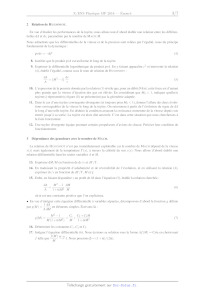 < 1, indiquer quelle(s) tuyère(s) répresentée(s) figure (1) ne présente(nt) pas la géométrie adaptée. 60 11. Dans le cas d'une tuyère convergente-divergente (et toujours pour M0 < 1), donner l'allure des deux évolutions envisageables de la vitesse le long de la tuyère. On raisonnera à partir de l'évolution du signe de dA le long d'une telle tuyère. En déduire la condition assurant la croissance monotone de la vitesse depuis son entrée jusqu'à sa sortie. La tuyère est alors dite amorcée. C'est dans cette situation que nous chercherons à la faire fonctionner. 12. Une tuyère divergente équipe pourtant certains propulseurs d'avions de chasse. Préciser leur condition de fonctionnement. 3 Dépendance des grandeurs avec le nombre de M ACH. 65 La relation de H UGONIOT n'est pas immédiatement exploitable car le nombre de M ACH dépend de la vitesse v(x) mais également de la température T (x), à travers la célérité du son c(x). Nous allons d'abord établir une relation différentielle liant les seules variables A et M. 13. Exprimer dM/M en fonction de dv/v et dT /T . 70 14. En traduisant la propriété d'adiabaticité et de réversibilité de l'évolution, et en utilisant la relation (4), exprimer dv/v en fonction de dT /T , M et . 15. Enfin, en faisant disparaître v au profit de M dans l'équation (5), établir la relation cherchée : M 2 - 1 dM dA = A 1 + M2 M (6) où est une constante positive que l'on explicitera. · En vue d'intégrer cette équation différentielle à variables séparées, décomposons d'abord la fonction g définie 1 dA par g(M) = en éléments simples. Écrivons-là : A dM g(M) = C1 C2 +C3 M M2 - 1 = + 2 M (1 + M ) M 1 + M2 (7) 16. Déterminer les constantes C1 , C2 et C3 . 17. Intégrer l'équation différentielle (6). Nous écrirons sa solution sous la forme A f (M) = Cste en choisissant f (M) M0 f telle que - 1. Nous poserons = (1 + )/(2). M Page 3/7 75 18. Justifier que la fonction f admet un extremum. Le situer sur l'axe des abscisses. Ces résultats peuvent s'obtenir avec un minimum de calculs. 19. En déduire l'allure graphique de la fonction A = A(M). On marquera d'une étoile le point (M0 , A0 ). 80 20. Pour des conditions d'entrée fixées (P0 , T0 , A0 , D) (avec toujours M0 < 1), décrire les parcours possibles du point (M, A) sur ce tracé lorsque le gaz progresse de l'entrée à la sortie de la tuyère (convergente-divergente), selon l'importance de la restriction de sa section au col. 21. En déduire l'allure de la dépendance de M avec l'abscisse x, pour une tuyère amorcée (M = 1 au col). 22. Sur le même graphe, donner l'allure de cette dépendance pour un nombre de M ACH M0 , à l'entrée de la même tuyère, légèrement inférieur (M0 < M0 < 1). 4 Caractérisation de la situation au col. 85 Nous affectons l'indice "c" aux grandeurs relatives au col de la tuyère. 23. Exprimer le rapport kc0 Ac /A0 pour la tuyère amorcée (Mc = 1), en fonction de , et M0 . Commenter ce résultat. 24. On utilisant la figure (2) représentant la dépendance du rapport A/Ac avec M, déterminer la valeur de kc0 puis celle de la section Ac . F IGURE 2 Dépendance du rapport de sections A/Ac avec M. 90 95 5 Adaptation en pression. Pour des paramètres fixés à l'entrée de la tuyère, la relation de H UGONIOT permet d'établir la condition de son amorçage mais elle n'en impose aucune à sa sortie. Nous admettons que le fonctionnement de la tuyère est optimal lorsque la pression à sa sortie est égale à la pression extérieure (absence d'onde de choc, ou de détente). La tuyère est alors dite "adaptée". Nous notons Pe cette pression et la choisissons égale à 105 Pa (situation de la fusée au décollage). La figure (3) illustre les trois régimes de fonctionnement possibles, en sortie de tuyère. Nous affectons l'indice "s" aux grandeurs relatives à la sortie de la tuyère. 25. Proposer une association argumentée de chacun des trois cas illustrés sur la figure (3) au régime sousdétendu (Ps > Pe ), adapté (Ps = Pe ) ou