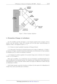 célérité de la lumière dans le vide (: = 3,00 >< 108 m - s--1 constante du gaz parfait RGP = 8, 31 J - K_1 -mol_1 Lumière du Miroir télescope déformable Front d'onde déformé {___ | Lame | Ü séparatrice Système de controle Front d'onde | corrigé + | | , ! | | Image haute |___ résolution Analyseur de surface d'onde Figure ]. Chaîne d'optique adaptative 1. Formation d'image et turbulence 1.1. On considère une fente de largeur a et de longueur grande devant sa largeur; elle est éclairée7 sous une incidence voisine de la normale7 par une onde plane monochromatique de longueur d'onde À. On suppose de plus a >> À.