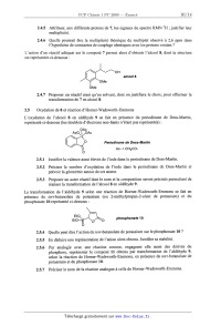 % < . $ :* q ; ' - ; a _ : ; :-- . < ; - ; ': ! _ . '" " " 'n'-- ' 'û " "'n'. ' n\'b \ "\"--S'. ". 'fb'u "' ' "'.'v'o'u' ... -' \"\M'" \ 'n'h '. \'."'u\'ñ"5 \\V." S'. 'n'-\ "\ "' '- '.'.' ". ' 'A"'n'.'o'." ' '- î ; ...""'v. '. wav. av.-ww" ""'"... «nv. vs " "'A ..."- """ ' 'W. ?. ....1vmnç."flv ... lmvvvr' V"- ...--n..." .... umvmfi "un. . f.- Courbes d'analyse thermique de refroidissement isabare 2- Etude d'une sxnthèse de la gseudogte'msine A On étudie dans cette partie une voie de synthèse de la pseudopte'msine A. Il est recommandé d'utiliser, uniquement pour l'écriture des mécanismes, des représentations simplifiées des molécules ne pouvant faire apparaître que la seule fonction organique concernée par la transformation chimique étudiée. 2.1 Le (+)--menthol 2, représenté ci-après, a été utilisé comme produit de départ dans une des synthèses Stéréochimie du (+)--menthol de la (--)--pseudoptémsine A 7/14 T( ° C) temps (+)--menthoI 2 2.1.1 Que signifie le signe (+) ? Représenter le (--)--menthol en adoptant une représentation spatiale similaire à celle utilisée ci-dessus pour le (+)--menthol. 2.1.2 Combien de centres asymétriques possède le (+)--menthol ? En déduire le nombre de stéréoisomères de configuration du menthol. 2.1.3 Déterminer la configuration absolue des centres asymétriques du (+)-menthol en justifiant la réponse. 2.1.4 Quel est l'intérêt de partir du (+)--menthal en vue de la synthèse de la (-)--pseudaptémsine ? Argumenter la réponse. 2.2 Etude de la réactivité du sulfate de diméther La lactone 3 est traitée par de la potasse, KOH, en présence de sulfate de diméthyle, (CH3)ZSO4 dans le DMSO. Le sulfate de diméthyle réagit de manière analogue à l'iodométhane, CH3I. \ lactone 3 O 0 OH 2.2.1 Ecrire le schéma de Lewis de l'ion sulfate, SOÊ'". Prévoir la géométrie autour de l'atome central de soufre. Préciser le nombre d'oxydation du soufre dans l'ion sulfate, SOÎ{' . 2.2.2 En déduire le schéma de Lewis du sulfate de diméthyle, (CH3)ZSO4. 2.2.3 Proposer une réaction illustrant la réactivité de l'iodométhane vis-à--vis d'un nucléophile. 2.2.4 Justifier, à l'aide des questions précédentes, que le sulfate de diméthyle a une réactivité analogue à celle de l'iodométhane vis-à--vis d'un nucléophile. 2.3 Réactivité de la lactone 3 On suppose dans les questions 2.3.1 à 2.3.4 que l'action première de la potasse, KOH, dans le DMSO (ou diméthylsulfoxyde, C2H680) est celle d'une base. 2.3.1 Quel est le rôle du DMSO '? Rappeler ses principales caractéristiques physiques expliquant son intérêt dans la transformation chimique étudiée. Argumenter la réponse en s'aidant du schéma de Lewis du DMSO. 2.3.2 Indiquer le(s) proton(s) acide(s) de la lactone 3 vis-à-vis de la potasse, KOH. Justifier la réponse. 2.3.3 Représenter la lactone 4, intermédiairement formée en présence de sulfate de diméthyle, (CH3)ZSO4, et de potasse, KOH, agissant comme base. 2.3.4 Proposer un mécanisme pour la transformation de 3 en 4. 8/14 On suppose dans la suite des questions que l'action de la potasse, KOH, ne se limite plus à celle d'une base. 2.3.5 Représenter le composé 5, ce dernier pouvant être ionique, résultant de l'action de la potasse, KOH, sur la lactone 4. 2.3.6 Proposer un mécanisme pour la transformation de 4 en 5. Le composé 5 se transforme dans le milieu réactionnel en 6, de formule brute C14H1804. 2.3.7 Quel est le nombre d'insaturations de 6 '? 2.3.8 Représenter le composé 6 finalement formé par action de la potasse, KOH, et du sulfate de diméthyle sur la lactone 3 . Nommer les différentes fonctions organiques du composé 6. 2.3.9 Combien d'équivalents de potasse KOH et de sulfate de diméthyle sont--ils nécessaires pour réagir sur un équivalent de la lactone 3 '? 2.4 Hydro génation de 6 L'étape suivante est une réaction d'hydrogénation chimio-sélective du composé 6 conduisant à l'obtention de 7, de formule brute C14HZOO4. Le spectre infrarouge (IR) du composé 7 présente, entre autre, les bandes caractéristiques suivantes : - bande large vers 2960 cm"1 ;1 - bande intense vers 1750 cm' ; - bande fine vers 1600 cm'l. Le spectre RMN 1H du composé 7 présente les signaux suivants : Déplacement chimique Intensité relative en nm du si, al . du si, al ' : ' ' : ' 2.4.1 Rappeler les conditions opératoires requises pour effectuer une réaction d'hydrogénation. 2.4.2 Ecrire une représentation schématique simplifiée du mécanisme de la réaction d'hydrogénation. 2.4.3 Pourquoi la réaction d'hydrogénation de 6 peut-elle être chimio-sélective ? Représenter le composé 7 alors obtenu. 2.4.4 Attribuer les bandes de vibration du spectre IR de 7 correspondantes aux trois valeurs indiquées. 9/14 2.4.5 Attribuer, aux différents protons de 7, les signaux du spectre RMN 1H ; justifier leur multiplicité. 2.4.6 Quelle pourrait être la multiplicité théorique du multiplet observé à 2,6 ppm dans l'hypothèse de constantes de couplage identiques avec les protons voisins ? L'action d'un réactif adéquat sur le composé 7 permet alors d'obtenir l'alcool 8, dont la structure est représentée ci--dessous : OH alcool 8 OMe OMe 2.4.7 Proposer un réactif ainsi qu'un solvant, dont on justifiera le choix, pour effectuer la transformation de 7 en alcool 8. 2.5 Oxydation de 8 et réaction d'Homer--Wadsworth--Emmons L'oxydation de l'alcool 8 en aldéhyde 9 se fait en présence du periodinane de Dess-Martin, représenté ci-dessous (les doublets d'électrons non-liants n'étant pas représentés) : OAc ACO\\ /OAc |\ 0 @ Periodinane de Dess-Marfin Ac-- : CHgCO- 0 2.5.1 Justifier la valence aussi élevée de l'iode dans le periodinane de Dess-Martin. 2.5.2 Préciser le nombre d'oxydation de l'iode dans le periodinane de Dess-Martin et prévoir la géométrie autour de cet atome. 2.5.3 Proposer un autre réactif dont le nom et la composition seront précisés permettant de réaliser la tr