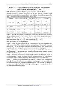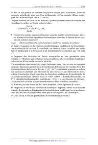 différentes frontières à considérer pour pH < 5 , et placer les différentes espèces de manière similaire à la question I.B.2-a. c) Stabilité dans l'eau i)Placer sur le diagramme le tracé relatif à l'un des couples de l'eau compatible avec l'échelle proposée. Écrire l'équation de la réaction thermodynamiquement prévue (selon le diagramme) pour une solution aqueuse d'acide oxalique dont le pH vaut 3. ii)Proposer une explication pour justifier stabilité des solutions aqueuses d'acide oxalique et méthanoïque à 25 °C . I.B.3) Titrage d'une solution aqueuse d'acide oxalique par une solution aqueuse de permanganate de potassium On titre V A = 10, 0 mL de la solution aqueuse ( A ) d'acide oxalique (de concentration C A trouvée en I.B.1-b) par une solution aqueuse acidifiée de permanga3 1 nate de potassium à 2, 50 × 10 mol L . a) Écrire l'équation de la réaction support du titrage avec les plus petits nombres stoechiométriques entiers, et donner la valeur de la constante de réaction associée à 25° C . Comment l'expérimentateur peut-il repérer l'équivalence lors de ce titrage ? b) Donner la valeur du volume attendu à l'équivalence lors du titrage des 10, 0 mL de la solution ( A ) . c) Quelles électrodes proposeriez-vous pour suivre ce titrage ? d) Pour les premiers millilitres versés, le milieu réactionnel garde une coloration violette, qui disparaît après quelques instants. Quel argument, issu de la partie I.B.2, est en accord avec ces observations ? Concours Centrale-Supélec 2010 5/12 CHIMIE Filière PC Partie II - Thermodynamique de quelques réactions de dissociation d'acides dans l'eau II.A - Grandeurs thermodynamiques associées aux réactions Dans le Journal of Chemical Education (vol. 48, mai 1971), G.V. Calder et T.J. Barton ont rassemblé quelques valeurs de grandeurs thermodynamiques relatives à la dissociation de certains acides dans l'eau. Tableau 1 : valeurs relatives à AH ( aq ) + H 2 O = H 3 O r G° acide AH pK a r H° 1 + ( aq ) +A T r S° 1 1 ( kJ mol ) ( kJ mol ) ( kJ mol ) ( aq ) (à 25 °C) r S° ( J mol 1 1 K ) CH 3 COOH 4, 76 27 0, 4 28 94 Cl CH 2 COOH 2, 86 16 4, 6 21 70 Cl 3 CCOOH 0, 65 à calculer 6, 3 à calculer à calculer II.A.1) À l'aide des valeurs du tableau 1, donner avec deux chiffres significatifs les valeurs de r G° , T r S° et r S° à 25 °C pour l'acide trichloroacétique. II.A.2) Pour les acides acétique et 2 -chloroacétique, comparer les contributions relatives de r H° et T r S° dans le calcul du pK a à 25 °C . II.B - Influence de la température II.B.1) Parmi les trois valeurs de pK a du tableau 1, laquelle dépend le plus de la température ? Calculer sa variation pK a pour une élévation de température de 1, 0° C , et en déduire le nombre de décimales que l'on peut afficher pour une valeur de pK a lorsque la température est donnée au degré près. La figure 4 (sur l'annexe à rendre avec la copie), présente l'évolution de la constante d'acidité K a en fonction de la température pour l'acide acétique et pour l'acide 2-éthylbutanoïque. II.B.2) Proposer une séquence réactionnelle permettant d'obtenir l'acide 2éthylbutanoïque à partir d'éthanol, d'acide propanedioïque, de toute espèce minérale et de tout solvant nécessaire. Aucun mécanisme n'est demandé. II.B.3) Chacune des courbes tracées sur la figure 4 délimite deux domaines du plan. Quelle nouvelle ordonnée peut-on placer sur le graphe pour que ces domaines correspondent à des domaines de prédominance ? En utilisant un raisonnement mettant en jeu l'affinité chimique, placer les espèces correspondantes dans les différents domaines du plan. Concours Centrale-Supélec 2010 6/12 CHIMIE Filière PC II.B.4) Montrer que les deux propositions « r C p° est nulle » et « r G° est une fonction affine de la température » sont équivalentes. II.B.5) Montrer que l'étude en température, illustrée à la figure 4, ne suit pas en toute rigueur, l'approximation d'Ellingham. Partie III - Quelques aspects de la chimie des composés du furane Les différentes sous-parties de ce problème sont largement indépendantes. O Le furane présente la formule topologique suivante : Le furane est un composé aromatique très volatil. Sa température d'ébullition vaut 32° C sous pression atmosphérique. Quelques paramètres de Hückel : Atomes Intégrale coulombienne Intégrale de résonance Carbone C = CC = Oxygène à 1 électron O = + CO = Oxygène à 2 électrons O = + 2 CO = 0, 8 Énergies des OM du système du furane : + 2, 63 ; + 1, 31 ; + 0, 62 ; 0, 95 ; 1, 62 . Énergies des OM du système du buta 1, 3 dién 1 ol ( A ) : + 2, 35 ; + 1, 52 ; + 0, 48 ; 0, 71 ; 1, 64 . OH Expression de la HO et de la BV du furane : HO = 0 ( 2 p ZO ) + 0, 60 ( 2 p ZC2 ) + 0, 37 ( 2 p ZC3 ) 0, 37 ( 2 p ZC4 ) 0, 60 ( 2 p ZC5 ) BV = 0, 32 ( 2 p ZO ) + 0, 60 ( 2 p ZC2 ) 0, 31 ( 2 p ZC3 ) 0, 31 ( 2 p ZC4 ) + 0, 60 ( 2 p ZC5 ) Avec O qui désigne l'oxygène et C2 et C5 qui désignent les atomes de carbone voisins de O . Concours Centrale-Supélec 2010 7/12 CHIMIE Filière PC III.A - Aromaticité du furane III.A.1) Justifier que, selon le critère de Hückel, le furane est une molécule aromatique. III.A.2) Confirmation via la théorie de Hückel a) Que représente, en première approximation, l'intégrale coulombienne notée ? Commenter la valeur prise pour cette intégrale coulombienne dans le cas de l'oxygène à un électron par rapport au cas du carbone. b) En théorie de Hückel, suivant qu'un hétéroatome (comme N ou O ) intervient par un ou deux électrons dans le système d'une molécule, les paramétrages diffèrent. Quel type d'hétéroatome faut-il choisir pour le furane ? c) En utilisant les données, calculer en unité l'énergie de délocalisation (ou de conjugaison) du furane notée E del et définie comme la différence entre l'énergie des électrons du furane et celle d'une molécule de furane hypothétique correspondant à un ensemble