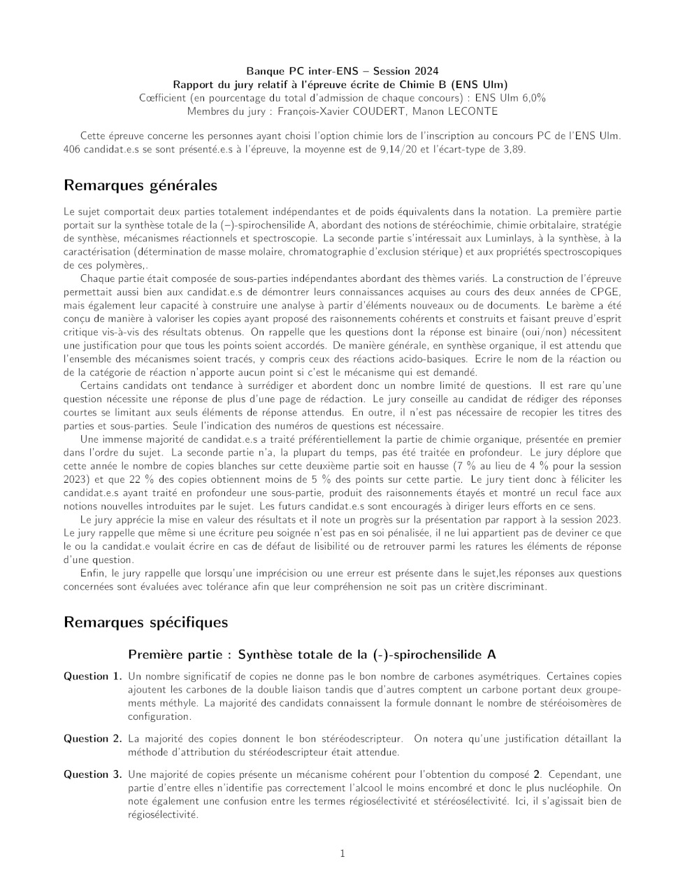 | Thème de l'épreuve | Synthèse totale asymétrique de la (-)-spirochensilide A. Les Luminlays. |