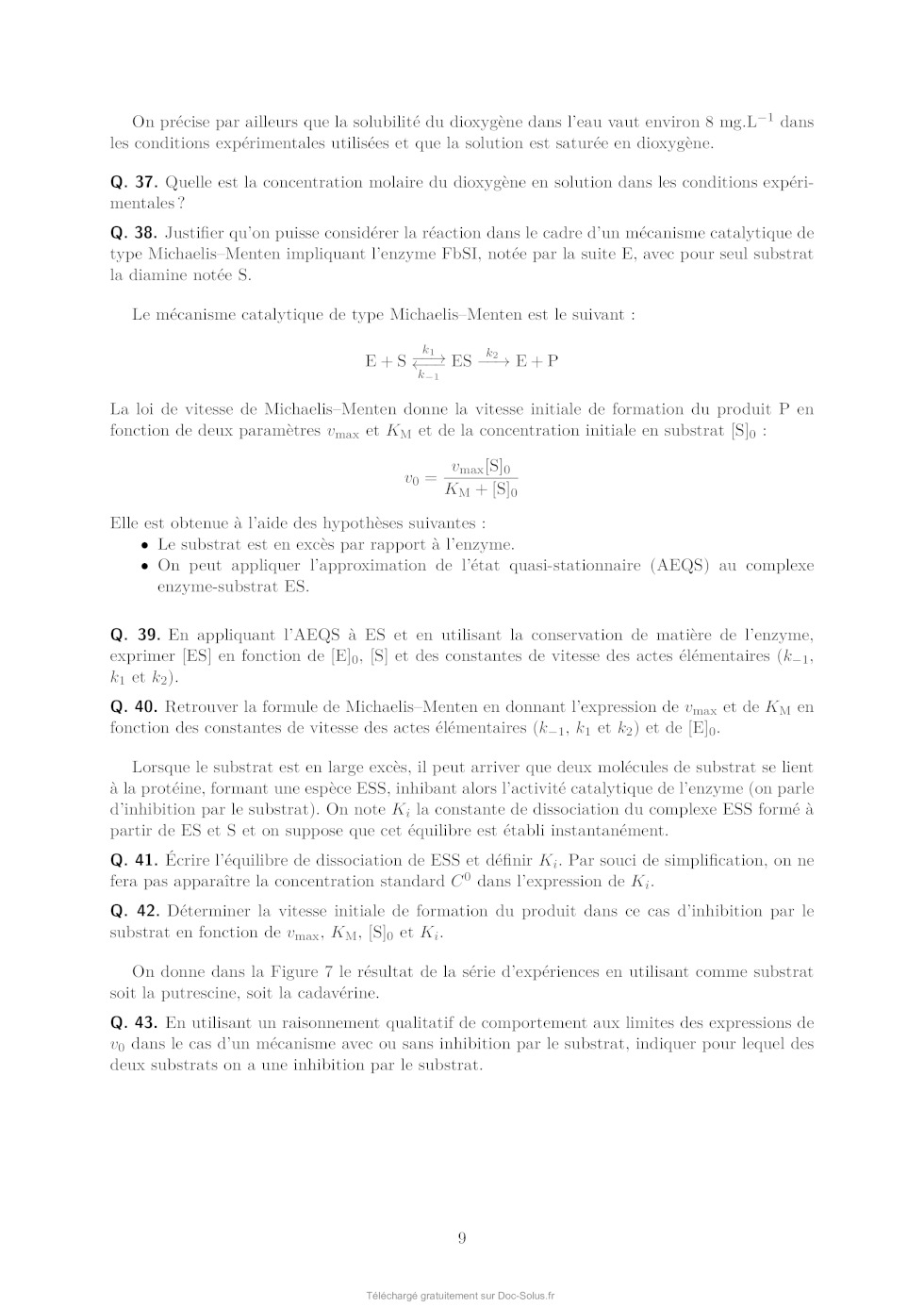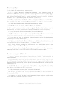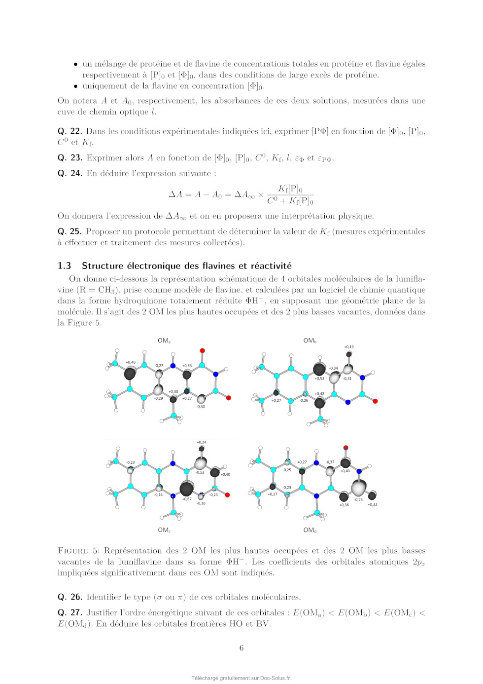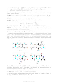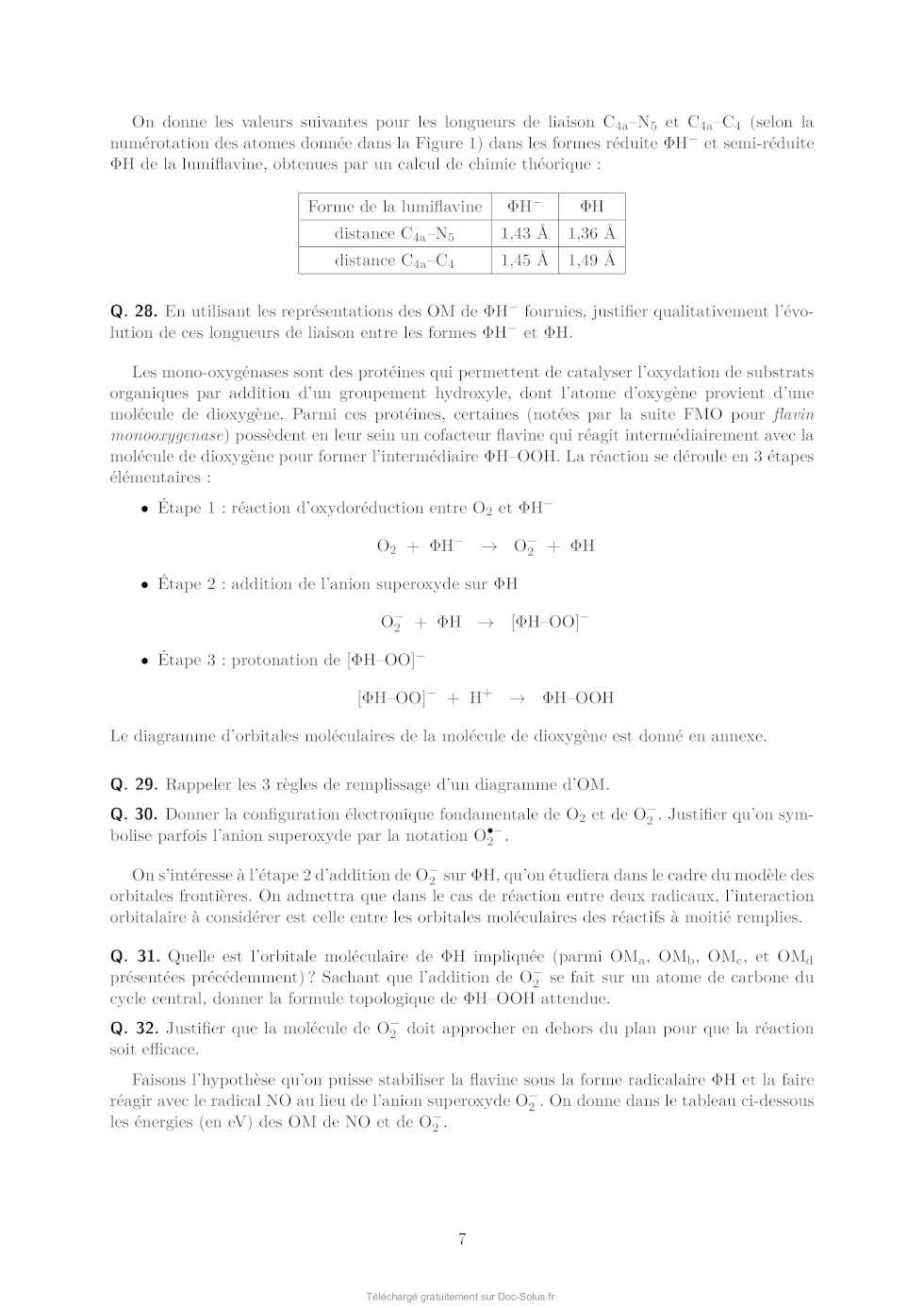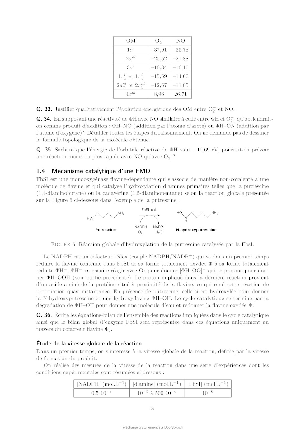 Q. 27. Justifier l'ordre énergétique suivant de ces orbitales : E(OMa ) < E(OMb ) < E(OMc ) < E(OMd ). En déduire les orbitales frontières HO et BV. 6 On donne les valeurs suivantes pour les longueurs de liaison C4a N5 et C4a C4 (selon la numérotation des atomes donnée dans la Figure 1) dans les formes réduite H- et semi-réduite H de la lumiflavine, obtenues par un calcul de chimie théorique : Forme de la lumiflavine H- H distance C4a N5 1,43 Å 1,36 Å distance C4a C4 1,45 Å 1,49 Å Q. 28. En utilisant les représentations des OM de H- fournies, justifier qualitativement l'évolution de ces longueurs de liaison entre les formes H- et H. Les mono-oxygénases sont des protéines qui permettent de catalyser l'oxydation de substrats organiques par addition d'un groupement hydroxyle, dont l'atome d'oxygène provient d'une molécule de dioxygène. Parmi ces protéines, certaines (notées par la suite FMO pour flavin monooxygenase) possèdent en leur sein un cofacteur flavine qui réagit intermédiairement avec la molécule de dioxygène pour former l'intermédiaire HOOH. La réaction se déroule en 3 étapes élémentaires : · Étape 1 : réaction d'oxydoréduction entre O2 et H- O2 + H- O- 2 + H · Étape 2 : addition de l'anion superoxyde sur H - O- 2 + H [HOO] · Étape 3 : protonation de [HOO]- [HOO]- + H+ HOOH Le diagramme d'orbitales moléculaires de la molécule de dioxygène est donné en annexe. Q. 29. Rappeler les 3 règles de remplissage d'un diagramme d'OM. Q. 30. Donner la configuration électronique fondamentale de O2 et de O- 2 . Justifier qu'on sym·- bolise parfois l'anion superoxyde par la notation O2 . On s'intéresse à l'étape 2 d'addition de O- 2 sur H, qu'on étudiera dans le cadre du modèle des orbitales frontières. On admettra que dans le cas de réaction entre deux radicaux, l'interaction orbitalaire à considérer est celle entre les orbitales moléculaires des réactifs à moitié remplies. Q. 31. Quelle est l'orbitale moléculaire de H impliquée (parmi OMa , OMb , OMc , et OMd présentées précédemment) ? Sachant que l'addition de O- 2 se fait sur un atome de carbone du cycle central, donner la formule topologique de HOOH attendue. Q. 32. Justifier que la molécule de O- 2 doit approcher en dehors du plan pour que la réaction soit efficace. Faisons l'hypothèse qu'on puisse stabiliser la flavine sous la forme radicalaire H et la faire réagir avec le radical NO au lieu de l'anion superoxyde O- 2 . On donne dans le tableau ci-dessous - les énergies (en eV) des OM de NO et de O2 . 7 OM O- 2 NO 1 l 37,91 35,78 2 al 25,52 21,88 3 l 16,34 16,10 1xl et 1yl 15,59 14,60 2xal et 2yal 4 al 12,67 11,05 8,96 26,71 Q. 33. Justifier qualitativement l'évolution énergétique des OM entre O- 2 et NO. Q. 34. En supposant une réactivité de H avec NO similaire à celle entre H et O- 2 , qu'obtiendraiton comme produit d'addition : HNO (addition par l'atome d'azote) ou HON (addition par l'atome d'oxygène) ? Détailler toutes les étapes du raisonnement. On ne demande pas de dessiner la formule topologique de la molécule obtenue. Q. 35. Sachant que l'énergie de l'orbitale réactive de H vaut -10,69 eV, pourrait-on prévoir une réaction moins ou plus rapide avec NO qu'avec O- 2 ? 1.4 Mécanisme catalytique d'une FMO FbSI est une monooxygénase flavine-dépendante qui s'associe de manière non-covalente à une molécule de flavine et qui catalyse l'hydroxylation d'amines primaires telles que la putrescine (1,4-diaminobutane) ou la cadavérine (1,5-diaminopentane) selon la réaction globale présentée sur la Figure 6 ci-dessous dans l'exemple de la putrescine : Figure 6: Réaction globale d'hydroxylation de la putrescine catalysée par la FbsI. Le NADPH est un cofacteur rédox (couple NADPH/NADP+ ) qui va dans un premier temps réduire la flavine contenue dans FbSI de sa forme totalement oxydée à sa forme totalement réduite H- . H- va ensuite réagir avec O2 pour donner [HOO]- qui se protone pour donner HOOH (voir partie précédente). Le proton impliqué dans la dernière réaction provient d'un acide aminé de la protéine situé à proximité de la flavine, ce qui rend cette réaction de protonation quasi-instantanée. En présence de putrescine, celle-ci est hydroxylée pour donner la N-hydroxyputrescine et une hydroxyflavine HOH. Le cycle catalytique se termine par la dégradation de HOH pour donner une molécule d'eau et redonner la flavine oxydée . Q. 36. Écrire les équations-bilan de l'ensemble des réactions impliquées dans le cycle catalytique ainsi que le bilan global (l'enzyme FbSI sera représentée dans ces équations uniquement au travers du cofacteur flavine ). Étude de la vitesse globale de la réaction Dans un premier temps, on s'intéresse à la vitesse globale de la réaction, définie par la vitesse de formation du produit. On réalise des mesures de la vitesse de la réaction dans une série d'expériences dont les conditions expérimentales sont résumées ci-dessous : [NADPH] (mol.L-1 ) [diamine] (mol.L-1 ) [FbSI] (mol.L-1 ) 0,5 10-3 10-5 à 500 10-6 10-6 8 On précise par ailleurs que la solubilité du dioxygène dans l'eau vaut environ 8 mg.L-1 dans les conditions expérimentales utilisées et que la solution est saturée en dioxygène. Q. 37. Quelle est la concentration molaire du dioxygène en solution dans les conditions expérimentales ? Q. 38. Justifier qu'on puisse considérer la réaction dans le cadre d'un mécanisme catalytique de type MichaelisMenten impliquant l'enzyme FbSI, notée par la suite E, avec pour seul substrat la diamine notée S. Le mécanisme catalytique de type MichaelisMenten est le suivant : k1 k 2 E+S- - - - ES -- E + P k-1 La loi de vitesse de MichaelisMenten donne la vitesse initiale de formation du produit P en fonction de deux paramètres vmax et KM et de la concentration initiale en substrat [S]0 : v0 = vmax [S]0 KM + [S]0 Elle est obtenue à l'aide des hypothèses suivantes : · Le substrat est 