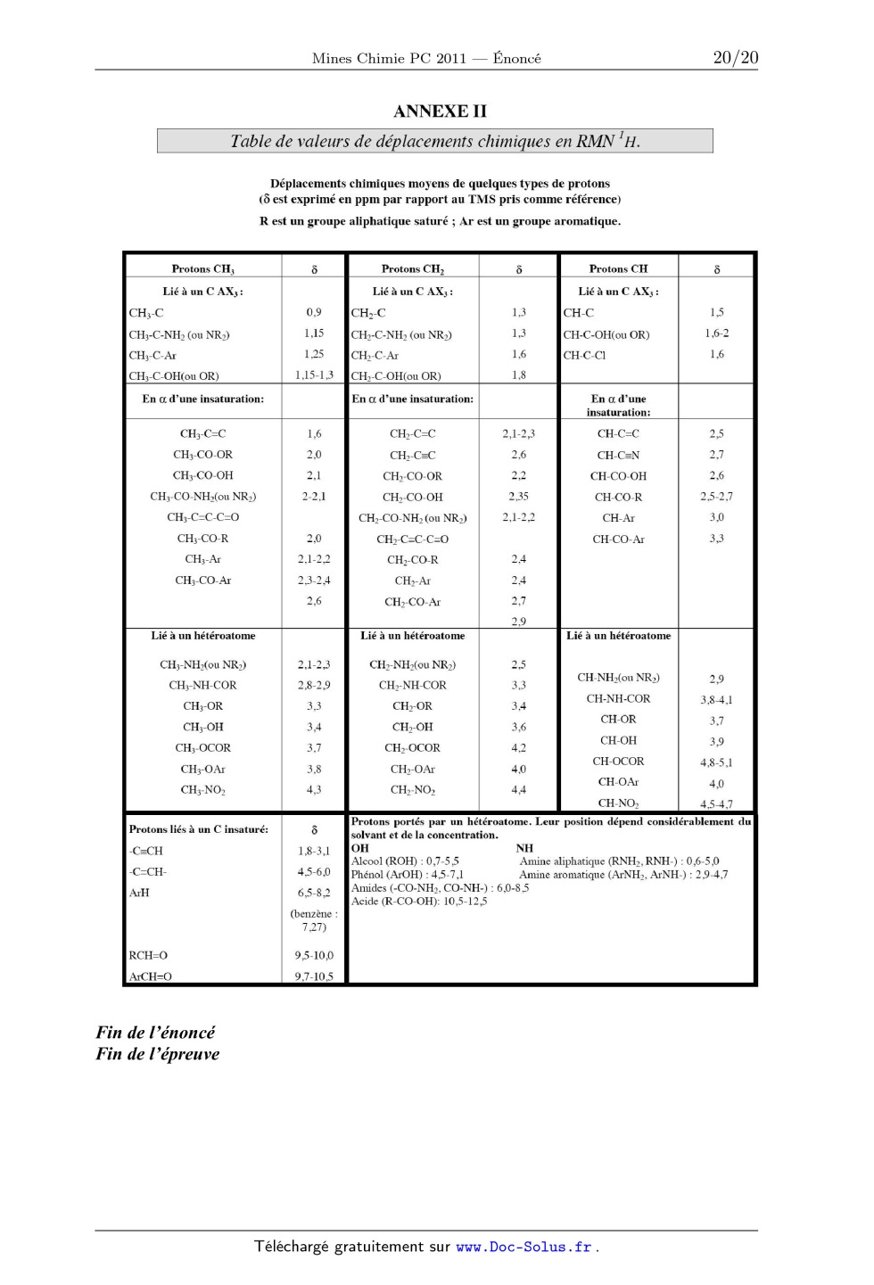 Table de valeurs de déplacements chimiques en RMN IH.