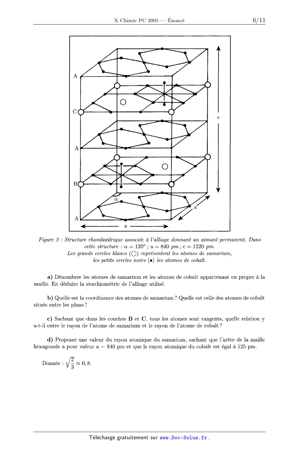 3HR(0rg) + M(aq) <---- MR3(0rg) + 3H(aq) de constante d'équilibre Keoe (dite biphasique) a) Justifier le terme de système par échange d'ions donné a ce système d'extraction de cations métalliques. b) Donner l'expression du coefficient de distribution DM de M entre les deux phases organique et aqueuse, qui lie les concentrations totales de l'élément M dans chacune des deux phases : iM(org)]tot DM = lM< 10_3 mol-L'"1 en ions Sm3+ et Eu3+ à pH=0. Cette solution est mise en contact avec 10,0 mL d'une solution a 1,0 mol-L--1 en HDEHP dans le kérosène. Le mélange est agité puis laissé décanter. On prélève la phase organique en vue d'un traitement ultérieur. &) Quelles sont les quantités respectives en ions Sm3+ et Eu3+ dans la phase aqueuse? b) Quelles sont les quantités respectives en Sm(DEHP)3 et Eu(DEHP)3 dans la phase organique? 2.4. On ajoute aux 10,0 mL de la phase organique précédente 10,0 mL d'une solution aqueuse d'acide chlorhydrique a pH= 0. Après agitation et décantation, on analyse les deux phases. &) Quelles sont les quantités respectives en ions Sm3+ et Eu3+ dans la phase aqueuse ? b) Quelles sont les quantités respectives en Sm(DEHP)3 et Eu(DEHP)3 dans la phase organique? (:) Ce procédé vous semble--t--il envisageable pour la séparation des deux ions envisagés? En déduire une technique susceptible d'être utilisée pour séparer les ions des lanthanides. Aucun détail technologique n'est demandé. 10 29. D ' :----oe0083° xD 45. onnees 112 , ,212 ,0 II. Propriétés structurales du samarium En dessous de 924°C, le samarium cristallise dans le système cubique centré. &) Représenter une maille du système cubique centré. b) Quelle est la relation entre le rayon de l'atome de samarium et l'arête de la maille ? Il existe dans cette structure deux types de sites interstitiels octaédriques : aux centres des octaédres définis par les centres de deux cubes voisins et les quatre sommets d'une face, et aux centres des octaédres définis par les deux extrémités d'une arête et les centres des quatre cubes ayant cette arête en commun. c) Représenter les deux types de sites octaédriques. d) Quel est le nombre de sites octaédriques appartenant en propre a une maille cubique centrée? Les sites tétraédriques sont aux centres des tétraèdres déformés définis par une arête et le segment joignant les centres des deux cubes ayant cette arête en commun. e) Représenter un site tétraédrique. f) Quel est le nombre de sites tétraédriques appartenant en propre a une maille cubique centrée? III. Les aimants samarium-cobalt 1. Étude du diagramme binaire samarium-cobalt (figure 2) 0 0,105 ' 0,750 1 Fraction molaire en samarium Figure 2 : Diagramme binaire isobare samarium--cobalt a) Déduire du diagramme les formules des composés définis samarium--cobalt. b) Préciser les phases en présence dans les domaines (1,2,3,4). 2. Structure de l'alliage Sm-Co utilisé dans les aimants permanents Il s'agit d'une structure dite rhomboédrique dont une maille est décrite sur la figure 3. Figure 3 : Structure rhomboédrtque associée à l'alltage donnant un aimant permanent. Dans cette structure : oz = 1200 ; a = 840 pm ; c = 1220 pm. Les grands cercles blancs (O) représentent les atomes de samarium, les petits cercles noirs (o) les atomes de cobalt. &) Dénombrer les atomes de samarium et les atomes de cobalt appartenant en propre à la maille. En déduire la stoechiométrie de l'alliage utilisé. b) Quelle est la coordinence des atomes de samarium ? Quelle est celle des atomes de cobalt situés entre les plans ? c) Sachant que dans les couches B et C, tous les atomes sont tangents, quelle relation y a--t-il entre le rayon de l'atome de samarium et le rayon de l'atome de cobalt ? d) Proposer une valeur du rayon atomique du samarium, sachant que l'arête de la maille hexagonale a pour valeur a = 840 pm et que le rayon atomique du cobalt est égal à 125 pm. D ' : \/_g % 0,8. onnee 3 Deuxième problème Synthèse stéréocontrôlée du (:1:) O--méthylpodocarpate de méthyle L'acide podocarpique est un terpènoïde naturel possédant un squelette octahydrophénantrène. La jonction de cycle entre les cycles A et B peut être cis ou trans suivant que les substituants en C(5) et C(10) sont au--dessus (stéréoisomère cis) ou de part et d'autre (stéréoisomère trans) du plan moyen du cycle A. 2 3 4 H | ' H | H Structure stériun du cis-octahydrOphéuanthrène Structure stériun du trans--octahydrophénamthrène Les propriétés hormonales, anti--inflammatoires ou antileucémiques présentées par certains dérivés de l'acide podocarpique ont suscité de nombreuses synthèses totales dans cette série, notamment celle de l'O-méthylpodocarpate de méthyle (qui a pu être transformé en quinones à activité antitumorale) décrit ci--après. Données de spectroscopie infrarouge : nombres d'onde des bandes d'absorption en cm--1 (R : groupe aliphatique saturé, Ar : groupe aromatique). R--COOH< R--COOR' R--CO-- R' VOH libre: 14... lié: Vco . 1720- 1710 I/c_ C: 3650--3590 3200--2500 2250--2240 abaissé a 1690 si R=Ar 1665--1645 1/0H lié : uco(monomère) : abaissé a à 1685-1675 si R insaturé abaissé à 3550--3450 1760--1750 2230--22 10 conjugué 1640--1600 uco(dimère) si conjugaison et a 1665 si R=Ar et si 1720--1710 R' insaturé conjugué : conjugaison relevé de 15 cm--1 par Br en oz Remarque : tous les composés décrits possédant un cycle benzénique, les bandes d'absorp-- tion correspondant aux vibrations de valence du cycle (vers 1600 et 1500 cm--1) ne sont pas mentionnées. Données en RMN du proton : Déplacements chimiques 5 en ppm CHg--C--Ar CH3----O--Ar CH3--O--CO-- 1,2_ 1,3 3,3- 3,9 3,65- 3,3 --CH2----c0-Ar 2,6 _ 2,3 L'introduction d'un atome de brome entraîne un déblindage d'environ 2 ppm sur l'hydrogène lié au même carbone. En série cyclohexanique un groupe donné est plus déblindé en position équatoriale qu'en position axiale.