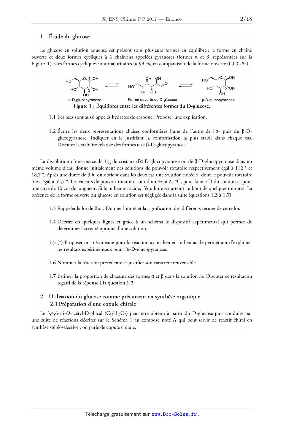 . . : Ho&/H/l\ÿo <----' HO" 2"OH ôH OH HO 2 OH OH OH a-D-glucopyranose Forme ouverte du D-glucose B-D-glucopyranose Figure 1 : Équilibres entre les différentes formes du D-glucose. 1.1 Les oses sont aussi appelés hydrates de carbone. Proposer une explication. 1.2 Écrire les deux représentations chaises conformères l'une de l'autre de l'OL-- puis du B-D- glucopyranose. Indiquer en le justifiant la conformation la plus stable dans chaque cas. Discuter la stabilité relative des formes et et B--D-glucopyranose. La dissolution d'une masse de 1 g de cristaux d'a--D--glucopyranose ou de B--D-glucopyranose dans un même volume d'eau donne initialement des solutions de pouvoir rotatoire respectivement égal à 112 ° et 18,7 °. Après une durée de 3 h, on obtient dans les deux cas une solution notée 81 dont le pouvoir rotatoire et est égal à 52,7 °. Les valeurs de pouvoir rotatoire sont données à 25 °C, pour la raie D du sodium et pour une cuve de 10 cm de longueur. Si le milieu est acide, l'équilibre est atteint au bout de quelques minutes. La présence de la forme ouverte du glucose en solution est négligée dans la suite (questions 1.3 à 1.7). 1.3 Rappeler la loi de Biot. Donner l'unité et la signification des différents termes de cette loi. 1.4 Décrire en quelques lignes et grâce à un schéma le dispositif expérimental qui permet de déterminer l'activité optique d'une solution. 1.5 (*) Proposer un mécanisme pour la réaction ayant lieu en milieu acide permettant d'expliquer les résultats expérimentaux pour l'OL-D-glucopyranose. 1.6 Nommer la réaction précédente et justifier son caractère renversable. 1.7 Estimer la proportion de chacune des formes et et B dans la solution S]. Discuter ce résultat au regard de la réponse à la question 1.2. 2. Utilisation du glucose comme précurseur en synthèse organique 2.1 Préparation d'une copule chimie Le 3,4,6-tri-O--acétyl--D-glucal (Cul--11607) peut être obtenu à partir du D--glucose puis conduire par une suite de réactions décrites sur le Schéma 1 au composé noté A qui peut servir de réactif chiral en synthèse stéréosélective : on parle de copule chirale. _» ACO 7 O D-glucose --> &» 1 "_, K