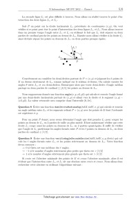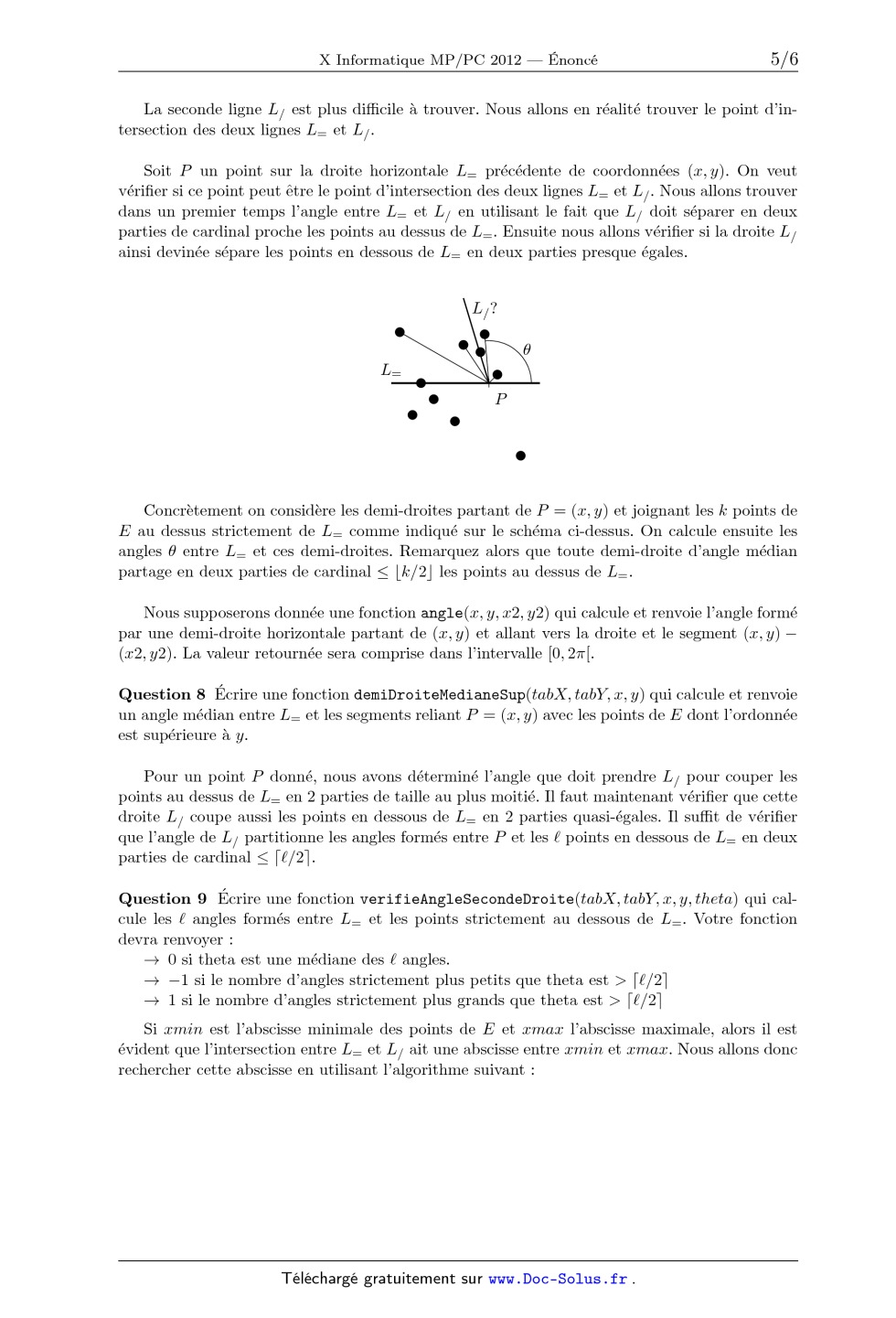 ECOLE POLYTECHNIQUE ECOLE NORMALE SUPERIEURE DE CACHAN ECOLE SUPERIEURE DE PHYSIQUE ET DE CHIMIE INDUSTRIELLES CONCOURS D'ADMISSION 2012 FILIERE MP HORS SPECIALITE INFO FILIERE PC COMPOSITION D'INFORMATIQUE B (XEC) (Duree : 2 heures) L'utilisation des calculatrices n'est pas autorisee pour cette epreuve. Le langage de programmation choisi par le candidat doit etre specifie en tete de la copie. Sandwich au jambon Le probleme dit du sandwich au jambon ou bien encore appele theoreme de Stone-Tukey s'enonce de la maniere suivante : un ensemble de n points en dimension d peut toujours etre separe en deux parties de cardinal au plus n/2 par un hyperplan de dimension d - 1 (certains points peuvent etre dans l'hyperplan), ou n/2 designe la partie entiere de n/2. De maniere concrete, un ensemble de points dans l'espace peut etre separe en deux parties quasi-egales par un plan. De meme un ensemble de points dans le plan peut etre separe en deux par une droite et meme en 4 a l'aide de deux droites. Ce sujet porte sur la resolution algorithmique de ce probleme et de problemes connexes selon differentes methodes. Dans tout le probleme, les tableaux sont indices a partir de 1. L'acces a la i-eme case d'un tableau tab est note tab[i]. Quel que soit le langage utilise, on suppose que les tableaux peuvent etre passes comme arguments des fonctions. En outre, il existe une primitive allouer(m, c) pour creer un tableau de taille m dont chaque case contient c a l'origine, ainsi qu'une primitive taille(t) qui renvoie la taille d'un tableau t. Enfin, on disposera d'une fonction floor(x) qui renvoie la partie entiere x pour tout reel x 0. La complexite, ou le temps d'execution, d'un programme P (fonction ou procedure) est le nombre d'operations elementaires (addition, soustraction, multiplication, division, affectation, etc...) necessaires a l'execution de P . Lorsque cette complexite depend d'un parametre n, on dira que P a une complexite en O(f (n)), s'il existe K > 0 tel que la complexite de P est au plus Kf (n), pour tout n. Lorsqu'il est demande de garantir une certaine complexite, le candidat devra justifier cette derniere si elle ne se deduit pas directement de la lecture du code. 1 Partie I. Grand, petit et median Dans cette partie, nous supposerons donne un tableau tab contenant n nombres reels. Les indices du tableau vont de 1 a n. Nous denoterons par tab[a..b] le tableau pris entre les indices a et b c'est-a-dire les cellules tab[a], tab[a + 1], . . . , tab[b - 1], tab[b]. Nous supposerons dans l'enonce que a b. Nous utiliserons le tableau de taille 11 suivant pour nos exemples : 3 2 5 8 1 34 21 6 9 14 8 Question 1 Ecrire une fonction calculeIndiceMaximum(tab, a, b) qui renvoie l'indice d'une case ou se trouve le plus grand reel de tab[a..b]. Sur le tableau precedent avec a = 1 et b = 11, la fonction renverra 6 car la case 6 contient la valeur 34. Question 2 Ecrire une fonction nombrePlusPetit(tab, a, b, val) qui renvoie le nombre d'elements dans le tableau tab[a..b] dont la valeur est plus petite ou egale a val. Sur le tableau exemple, pour une valeur de val egale a 5, et a = 1, b = 11, la fonction devra renvoyer la valeur 4 car seuls les nombres 3, 2, 5, 1 sont inferieurs ou egaux a 5. Nous allons maintenant calculer un median d'un tableau. Rappelons qu'une valeur mediane m d'un ensemble E de nombres est un element de E tel que les deux ensembles Em (les nombres de E strictement plus grands que m) verifient |E m | n/2. Notez que le probleme du median est une reformulation de probleme dit du sandwich au jambon pris en dimension 1. Une methode naive consiste donc a parcourir les elements de l'ensemble et a calculer pour chacun d'eux les valeurs de |E m | mais il est possible de faire mieux comme nous allons le voir dans la partie suivante. Partie II. Un tri pour accelerer Une methode plus efficace serait de trier le tableau par ordre croissant tout en prenant la cellule du milieu dans le tableau trie. Cette methode certes rapide requiert O(n ln n) operations. Il existe une methode optimale en temps lineaire O(n) pour trouver le median d'un ensemble de n elements. Cette partie a pour but d'en proposer une implementation. Une fonction annexe necessaire pour cet algorithme consiste a savoir separer en deux un ensemble de valeurs. Soit un tableau tab et un reel appele pivot p = tab[i], il s'agit de reordonner les elements du tableau en mettant en premier les elements strictement plus petits que le pivot tab p . Sur le tableau exemple, en prenant comme valeur de pivot 8 on obtiendra le tableau resultat suivant : 3, 2, 5, 1, 6 8, 8 21, 34, 9, 14 Notez que dans le resultat les nombres plus petits que le pivot 3, 2, 5, 1, 6 peuvent etre dans n'importe quel ordre les uns par rapport aux autres. 2 Question 3 Ecrire une fonction partition(tab, a, b, indiceP ivot) qui prend en parametre un tableau d'entiers tab[a..b] ainsi qu'un entier a indiceP ivot b. Soit p = tab[indiceP ivot]. La fonction devra reordonner les elements de tab[a..b] comme explique precedemment en prenant comme pivot le nombre p. La fonction retournera le nouvel indice de la case ou se trouve la valeur p. Dans cette question, on suppose que les modifications effectuees par la fonction sur le tableau tab sont persistantes, meme apres l'appel de la fonction. Remarquons que le n/2-eme element dans l'ordre croissant d'un tableau de taille n est un element median du tableau considere. Nous allons donc non pas programmer une methode pour trouver le median mais plus generalement pour trouver le k-eme element d'un ensemble. Nous allons utiliser l'algorithme suivant : On cherche le k-eme element du tableau tab[a..b]. Si k = 1 et a = b alors renvoyer tab[a] Sinon, soit p = tab[a]. Partitionner le tableau tab[a..b] en utilisant le pivot p en mettant en premier les elements plus petits que p. Soit i l'indice de p dans le tableau resultant. Si i - a + 1 > k chercher le k-eme element dans tab[a..i - 1] et renvoyer cet element. Si i - a + 1 = k renvoyer le pi