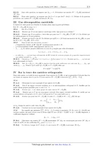 II.E.4) Dans cette question, on suppose que detA = 0 et que detP ' detQ < 0. Déduire de la question précédente une matrice W E C:," (R) maximisant (W, A) F. III Une décomposition matricielle Lbbjectif de cette partie est d7établir le résultat admis dans la partie précédente. Soit M EUR Mn,p(R) de rang ?" 2 l. III.A * Soit B = (ÊM)M. III.A.I) Montrer que B est une matrice symétrique réelle. Que peut--on en déduire? III.A.2) Montrer que B est positive, c7est--a--dire que pour tout V E Mp,1(R), (tl/)BV } 0. En déduire que les valeurs propres de B sont positives. III.A.3) Montrer que ker B = ker M. En déduire que rg(B) = 7". (M étant une matrice de MMO (R), on pose kerM = {x EUR M,...(R), MX = 0}.) III.B * Dans la suite de cette partie, on note : -- f Papplication linéaire de Rp dans R" canoniquement associée à M, -- g Vendomorphisme de Rp canoniquement associé à B, -- À1, . . . , Àp les valeurs propres (distinctes ou non) de g rangées par ordre décroissant : À12À22...2Àr>0=ÀT+1=....=ÀP