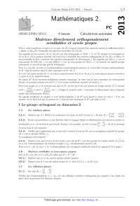 (R, +) sur le groupe (SO(2), ><). Oe morphisme est--il bijectif ? /\ I.A.4) Montrer que, pour tout t de R et tout a non nul de R2, t est une mesure de l'angle orienté (a, pt(u)), où pt est l'endomorphisme (la rotation d'angle t) th canoniquement associé à Rt. Pour tout 16 EUR Rï et tout t E R, l'endomorphisme kpt est appelé similitude directe de rapport k et d'angle t. I.B -- Matrices semblables et sous-espaces propres Soit A, B E MAR) et P E GLAR) telles que B : P_1AP. I.B.1) Montrer que f A et fB ont les mêmes valeurs propres. I.B.2) Montrer que si À est une valeur propre de A, alors EÀ(fA) : fp(EAf3)). I.C -- Les réfleoeions planes I.C.1) On note K2 : (à _3). Vérifier que l'endomorphisme 00 : fK2 est une réflexion (symétrie orthogonale par rapport a une droite du plan) dont on précisera les éléments propres. 2013-04--16 14:30:22 Page 1/4 GC) BY--NC-SA I.C.2) Pour tout réel t, préciser l'endomorphisme at canoniquement associé a Rt_1 K2 Rt et en particulier ses éléments propres. I.C.3) Montrer, que pour toute matrice A de O(2) telle que det(A) : --1, il existe un réel t tel que A : (cos(2 t) sin(2 t)) sin(2 t) -- cos(2 t) II Matrices directement orthogona1ement semblables Pour A, B dans MAR), on dit que A est orthogonalement semblable a B (ce que l'on pourra abréger en: A os B) s'il existe une matrice P de O(n) telle que B : P_1AP et on dit que A est directement orthogonalement semblable a B (en abrégé : A dos B) s'il existe une matrice P de SO(n) telle que B = P _1AP . II.A -- Propriétés fondamentales de la similitude II.A.1) Montrer que pour toute A de MAR) on a A dos A, que pour tout (A, B) de Mn(R)2 si A dos B alors B dos A et que pour tout (A, B, C) de Mn(R)3 si A dos B et B dos C alors A dos C. On dira donc indifféremment que A est directement orthogonalement semblable a B ou que A et B sont directement orthogonalement semblables. On a les mêmes propriétés pour la relation de similitude orthogonale entre deux matrices carrées de même taille et on ne demande pas de refaire ici les vérifications. II.A.2) Quelles sont les matrices directement orthogonalement semblables a ozÏn pour oz réel ? II.A.3) Quelles sont les matrices directement orthogonalement semblables a A si A appartient a SO(2) ? II.A.4) Quelles sont les matrices directement orthogonalement semblables a K 2 ? II.B -- Comparaison des relations de similitude. Avec SO(n) C O(n) C GLMR), si deux matrices sont directement orthogonalement semblables alors elles sont orthogonalement semblables et si deux matrices sont orthogonalement semblables alors elles sont semblables. II.B.1) Montrer que (0 0 0 2) et (î î) sont directement orthogonalement semblables. II.B.2) Montrer que (à g) et (_Î â) sont semblables mais ne sont pas orthogonalement semblables. 3 --1 0 orthogonalement semblables. II.B.3) Montrer que et sa transposée sont orthogonalement semblables mais ne sont pas directement III Cercle propre d'une matrice carrée réelle d'ordre 2 III.A -- Cercle propre 19 a Pour A _ (e d ) de M2(R) et (oe,y) de R2, on note pA(oe,y) le déterminant de la matrice A(oe,y) : a -- :D b -- y . . 2 , . ,, . e + y al _ gr et on cons1dere CPA la courbe de R définie par l equation : gpA(oe, y) = O. III.A.1) Vérifier que CPA est un cercle (on convient qu'un cercle peut être réduit a un point) ; on appellera CPA cercle propre de A. Préciser son centre CA et son rayon r A. III.A.2) Préciser, en fonction de A, le cardinal de l'intersection de CPA avec l'axe des abscisses R >< {O}. III.A.3) Que représentent les solutions de l'équation g0A(oe, O) = 0 pour A ? Préciser le nombre de valeurs propres réelles de A selon la valeur de AA : (a -- d)2 + 4 bc. III.B -- Deus: cas particuliers Soit A E M2(R). III.B.1) Comparer le cercle propre de A et celui de sa transposée. III.B.2) Déterminer une condition nécessaire et suffisante portant sur CPA pour que A soit symétrique. III.B.3) a ) Déterminer les matrices dont le cercle propre est de rayon nul et caractériser géométriquement leur endomor-- phisme canoniquement associé. b) Lorsque le cercle propre est réduit a son centre, préciser l'endomorphisme canoniquement associé, d'une part quand ce centre appartient au cercle trigonométrique (de centre l'origine O = (O, O) et de rayon 1) et d'autre part quand ce centre appartient a l'axe des abscisses. 2013-04--16 143022 Page 2/4 @°) BY--NC-SA c) Que peut--on dire de la matrice A et de fA quand le cercle propre CPA est de rayon nul et de centre appartenant a l'axe des ordonnées {O} >< R ? III.C -- Cercle propre et matrices directement orthogonalement semblables Montrer que deux matrices A et B de M2(R) sont directement orthogonalement semblables si et seulement si elles ont le même cercle propre. III.D -- Rectangle propre Pour A : (î 19) dans M2(R) on considère les quatre points (éventuellement confondus) E = (d, --c), F = d (a,b), C : (d,b) et H = (a, --c). III.D.1) Dans le cas où A = ( 7), représenter le cercle et le quadrilatère EH F C . --13 III.D.2) Lorsque les quatre points E, F , C et H sont distincts montrer qu'ils sont les sommets d'un rectangle, que l'on appellera rectangle propre de A. III.D.3) Préciser les matrices pour lesquelles certains de ces points sont confondus, c'est--à--dire lorsque le rectangle est aplati. III.E -- Décomposition orthogonale d'un endomorphisme Soit A : (î 19) de M2(R). d III.E.1) Montrer qu'il existe un unique triplet (oz, @ , y) de R2 >< R+ que l'on précisera, tel que A soit directement orthogonalement semblable a (a + W _5 ). 5 a -- v III.E.2) Suivant les valeurs de (oz, @ , y) préciser le nombre de valeurs propres réelles de A. III.E.3) Montrer que pour tout endomorphisme f de R2, il existe des réels positifs ou nuls 16 et EUR, une rotation plane pt et une réflexion 0t/ tels que f : kpt + lat/. III.E.4) Écrire une procédure ou une fonction dans le langage Maple ou Mathematica qui prend en entrée un quadruplet (a, b, c, d) de réels et qui ren