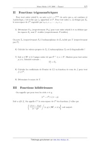 de ces espaces la propriété de « trou spectral » : il existe 0 < r < 1 tel que les valeurs propres autres que 1 sont de module inférieur ou égal à r. I Préliminaires 1) Montrer que si f appartient à C 0 alors T f aussi. 2) Montrer que pour tout élément f de C 0 on a l'inégalité kT f k 6 kf k puis que sup kT f k = 1. kf k =1 On appelle H 0 l'hyperplan de C 0 des fonctions f telles que Z 1 f (t) dt = 0. 0 3) Montrer que H 0 est stable par T . 4) Expliciter la projection P sur D parallèlement à H 0 . 2 II Fonctions trigonométriques Pour tout entier relatif k, on note ek (x) = e2ikx de sorte que ek est continue et 1-périodique, c'est-à-dire que ek appartient à C 0 . Pour tout entier n, on désigne par En le sous-espace de C 0 engendré par e0 , e1 , e-1 , · · · , en , e-n . 5) Déterminer T ek (respectivement P ek ) pour tout entier relatif k et en déduire que les espaces En sont T -stables (respectivement P -stables). On note Tn (respectivement Pn ) l'endomorphisme de En induit par T (respectivement par P ). 6) Calculer les valeurs propres de T2 . L'endomorphisme T2 est-il diagonalisable ? 7) Soit n N et k l'unique entier tel que 2k-1 6 n < 2k . Montrer pour tout entier p > k, l'identité suivante :