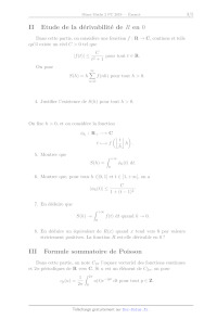 < pour tout te R et f(x pour tout x ER, pri 2 < 7 + 1 où la fonction f a été définie à la question 3. On pose également = ÿ f(x+2n7) et G(x = N° f(n) e"® pour x EUR R. nez nez 9. Montrer que la fonction F' est bien définie, 27-périodique et continue sur R. 10. Montrer que la fonction G est bien définie, 27-périodique et continue sur R. 11. Montrer que G = 27F. En particulier, on a G(0) = 27F(0), soit : YÙ f(n) = 27 Y_ f(2nr), nez nez 12. Montrer que, pour tout réel strictement positif a, on à D na) == D F(T) nez d'hez Cette égalité constitue la formule sommatoire de Poisson. IV Etude de la dérivabilité de RÀ en 7 On considère la fonction f : R -- C définie par -12 et --] 12 sit A0 ft) = à Sit = (0. 13. Montrer que f est de classe C'© sur R. On pourra utiliser un dévelop- pement en série entière. 14. Etablir que f'(t) -- 0 quand t --+ +oo, et que f"(t) = --4eït" + O(t72) quand { -- +oo. +o0 15. Montrer que l'intégrale 1 = | er" dx est convergente. OO 16. Montrer que f(x) = O(x?) quand x --+ +oo. On pose à présent CO in?x EUR F(x) = ÿ 5 pourz ER. n n=1l 17. En utilisant la formule sommatoire de Poisson, montrer qu'il existe des nombres complexes a et b tels que F(x) = F(0)+ayx+bx+0O(x°/2) quand x -- 0 par valeurs strictement positives. Préciser la valeur de b, et exprimer a en fonction de IT (l'intégrale I a été définie à la question 15). 18. Exprimer, pour x ER, F(r +x) en fonction de F(4x) et de F(x). 19. Déduire de ce qui précède que la fonction À est dérivable en 7, et préciser la valeur de R'(r). FIN DU PROBLÈME