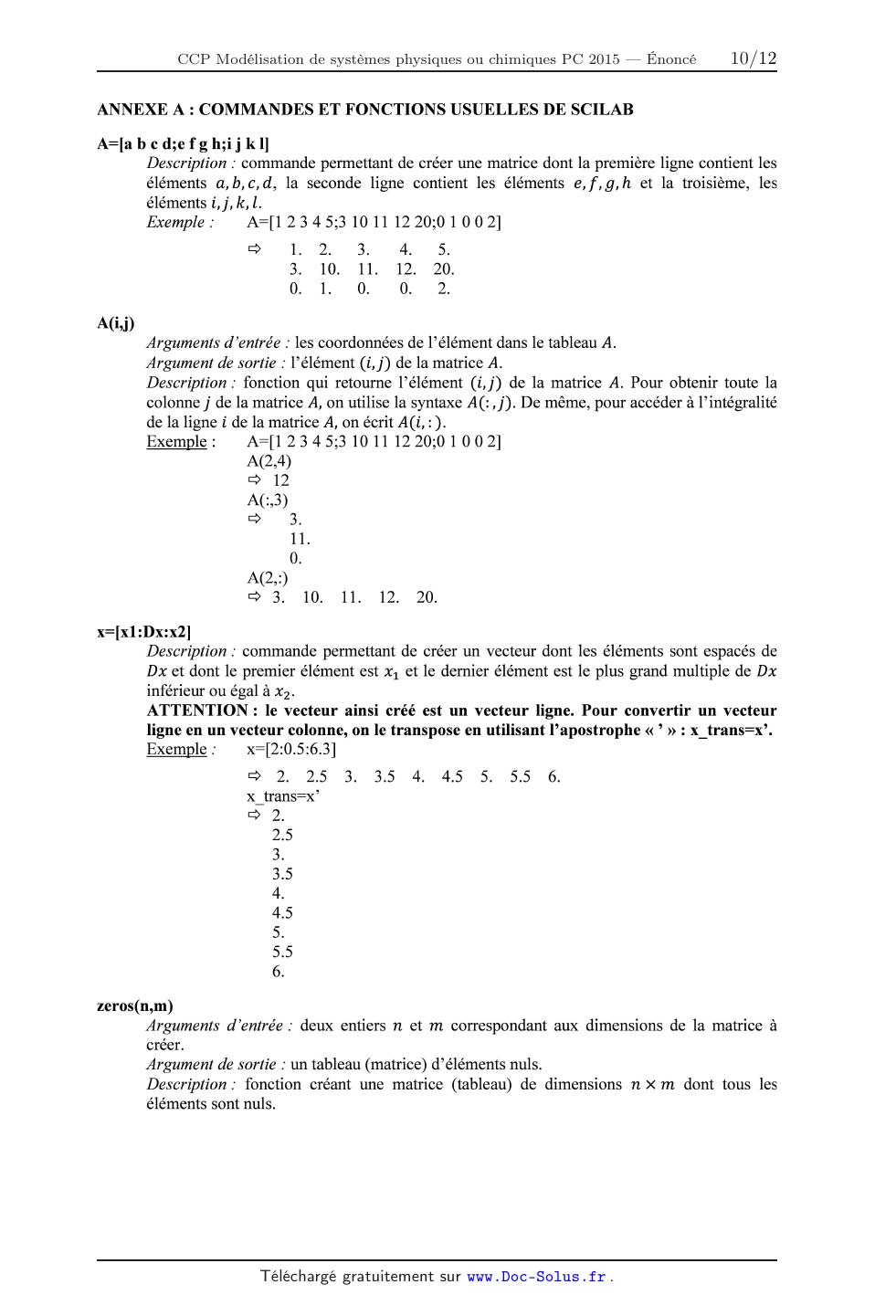 Plusieurs fonctions du langage Scilab sont rappelées en annexe A. Les candidats