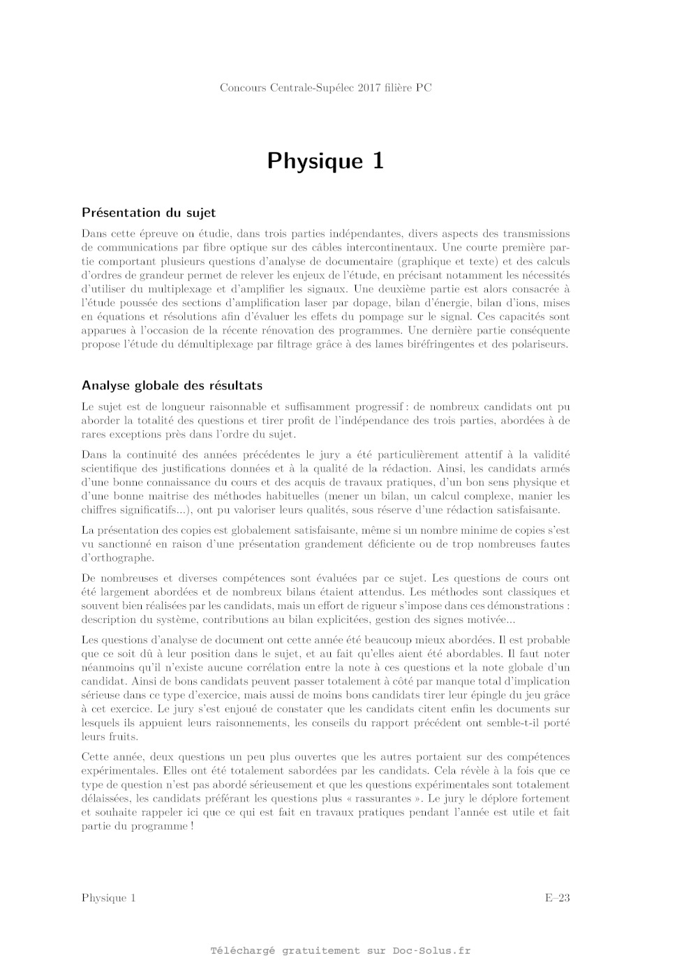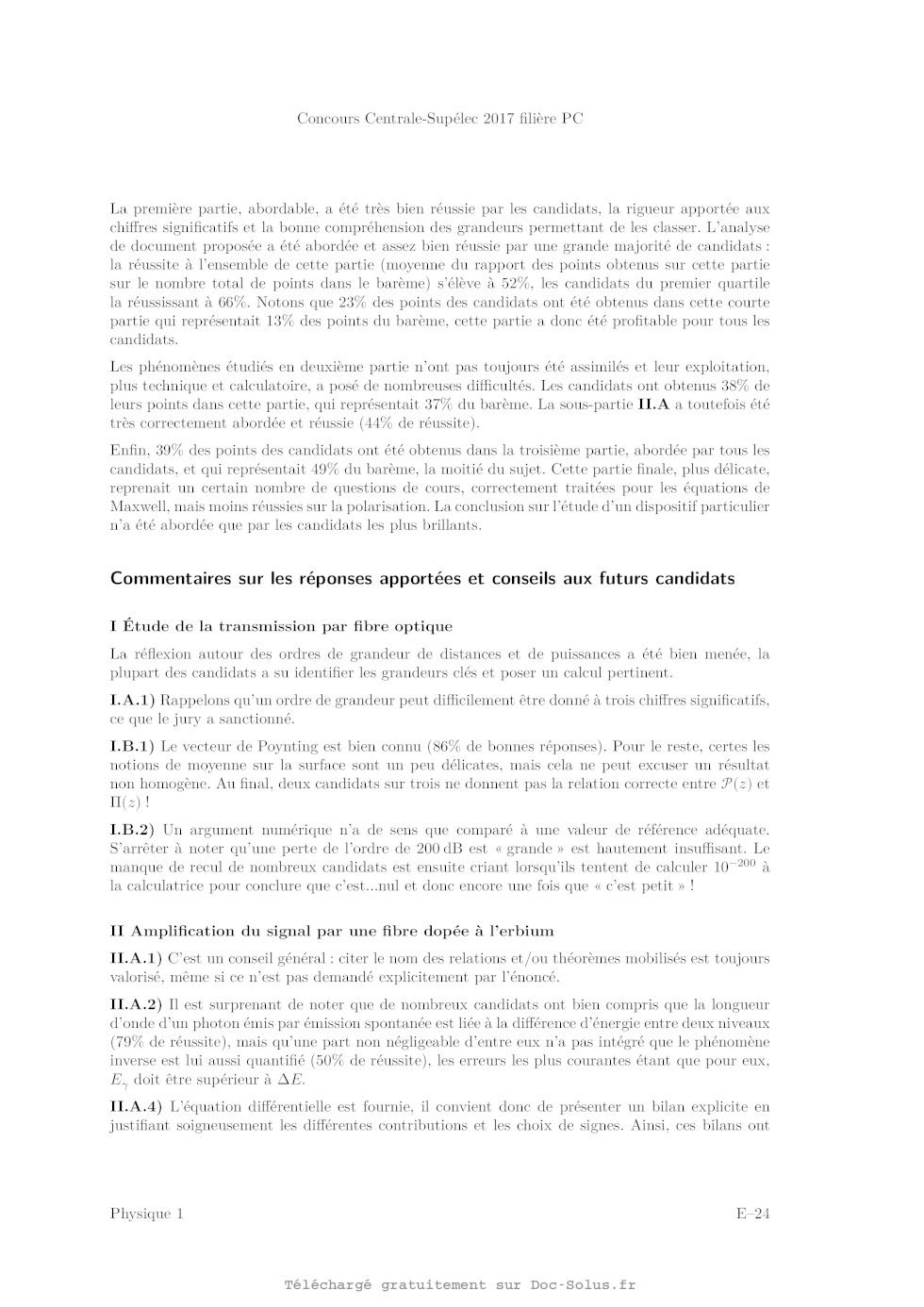 t, '» P hysiq ue 1 N °.) , 1--l _/ PC @ tancnuns EENÏHHLE--SUPËLEE 4 heures Calculatrices autorisées N Éléments de communication par fibre optique La technologie WDM (Wavelength Division Multiplexing) utilise le multiplexage en longueur d'onde, ce qui revient à injecter dans une même fibre optique plusieurs signaux de longueurs d'ondes distinctes, qui constituent autant de canaux de transmission de l'information. Une liaison WDM fonctionne selon le schéma synoptique décrit figure 1. Signal 1 Émetteur 1 ' Signal 2 Emetteur 2 ' g à : --â , l l . @ > Récepteur : 5 ' Fibre ! 'Ë | . : % Amplificateur Opthue Amplificateur Ë> Signal n Émetteur n ' optique optique Figure 1 Schéma synoptique d'une liaison WDM Les conventions internationales fixent la bande WDM aux longueurs d'onde comprises entre 1530 nm et 1565 nm. L'espacement entre deux longueurs d'ondes voisines de ces signaux porteurs est environ égal a 1,6 nm. La technologie WDM est dite dense (DWDM) lorsque l'espacement entre deux longueurs d'onde de la bande de transmission est environ égal a 0,8 nm. Ce problème étudie dans trois parties indépendantes la transmission du signal par la fibre optique, son amplifi-- cation et des éléments de démultiplexage. Lorsqu'une longueur d'onde A est évoquée dans l'énoncé, il s'agit de la longueur d'onde dans le vide associée à la fréquence f de ce signal. On trouvera en fin d'énoncé, les valeurs numériques des constantes physiques utiles, un formulaire et une annexe sur les polarisations circulaires droite et gauche. 100 Mesures _ L ------------ Limites théoriques / absorption OH 10 Y E --"*." CD 3 s: 1 .9 Ë'â 5 q 'B à 0,1 absorption infrarouge -->/ 0,01 / 0,6 0,8 1,0 1,2 14 1,6 1,8 7 Longueur d'onde À (pm) Figure 2 Atténuation dans une fibre de silice en fonction de À 2017--03--1508;47:58 Page 1/8 (CÔ BY--NC-SA I Etude de la transmission par fibre optique L'onde lumineuse se propage dans la fibre optique, considérée comme un guide de section S et d'axe de révolution Oz. On note Ë le vecteur de Poynting de l'onde lumineuse, H(z) la valeur de la composante utile de Ë, moyennée sur le temps et sur la section a l'abscisse z et enfin ?(z) la puissance moyenne véhiculée a travers cette section. La communication par fibre permet des débits très élevés. Simultanément, la propagation sur de longues dis-- tances pose un problème d'atténuation. Cette atténuation, mesurée en décibel par kilomètre, s'écrit, pour une propagation entre les abscisses z = 0 et z : d : f1 _ 10 ?(0) A(dB-km )_d(km) log (Îd)) Elle dépend de la longueur d'onde utilisée, selon le schéma donné figure 2. Pour les applications numériques, on envisagera une fibre à température ordinaire, parcourue par un signal de longueur d'onde À : 1550 nm, pour laquelle A oe 0,2 dB'kmfl. La puissance lumineuse injectée dans la fibre est typiquement ?(0) : 300 11W et la puissance minimale détectée par un récepteur vaut ?min : 10 pW. I.A * Longueurs d'onde et canaum utiles I.A.1) Dans quel domaine optique se situent les ondes propagé--es par la fibre '? Donner l'ordre de grandeur des fréquences associées, exprimées en THZ. I.A.2) Justifier le choix de longueur d'onde effectué pour propager le signal dans la fibre. I.A.3) La technologie WDM permet de véhiculer 16 canaux multiplexés. Rapprocher ce nombre des données associées aux normes techniques définies en introduction. Qu'en est--il de la technologie DWDM '? I.B -- Nécessité d'une amplification I.B.l) Rappeler l'expression du vecteur de Poynting Ë(ï,t), en fonction du champ électromagnétique de l'onde lumineuse. Préciser les relations liant Ë(ï", t), H(z) et ?(z). I.B.2) Justifier par des arguments numériques précis la nécessité d'une amplification du signal, par exemple pour des liaisons entre continents. I.B.3) Quelle distance maximale faut--il envisager entre deux amplificateurs de signal placés sur la fibre '? II Amplification du signal par une fibre dopée à l'erbium II.A * Interaction matière rayonnement L'amplification du signal est réalisée dans une portion, de longueur L, de fibre dopée avec des ions erbium Er3+. Cet ion est modélisé comme un système a deux niveaux, le niveau fondamental 1, d'énergie 51: et un niveau excité 2, d'énergie 52. Il y a n0 ions Er3+ par unité de volume, dont nl dans le niveau 1 et n2 dans le niveau 2. L'interaction entre ces ions Er3+ et le rayonnement se fait suivant les trois processus quantiques illustrés par la figure 3 : -- l'absorption d'un photon du faisceau lumineux incident par un ion Er3+ dans le niveau fondamental 1 qui produit un ion excité dans le niveau 2. La puissance par unité de volume absorbée par les ions au cours de ce processus est a"nl(z)H(z) où a" est une constante caractéristique de l'ion Er3+, appelée section efficace d'absorption ; -- l'émission spontanée d'un photon par les ions dans le niveau excité 2. Si T désigne la durée de vie du niveau dn n2 6 : --. L dt 7' a excité 2, le nombre de photons émis selon ce processus par unité de volume et de temps est direction d'émission des photons ainsi produits est complètement aléatoire ; -- l'émission stimulée d'un photon par interaction résonnante avec le faisceau incident. Ce processus trans-- fère au faisceau incident une puissance par unité de volume égale à oen2(z)H(z), où 06 est une constante caractéristique de l'ion Er3', appelée section efficace d'émission. 52 --O-- 52 photon photo" _.-- 51 _ 51 Absorption Émission spontanée Émission stimulée Figure 3 Interaction matière rayonnement II.A.1) Rappeler la relation entre l'énergie EUR,, du photon, la constante de Planck, la vitesse de la lumière dans le vide et la longueur d'onde du photon. 2017--03--15 08:47:58 Page 2/8 ÎCÔ BY--NC-SA II.A.2) Quelle est la condition sur l'énergie du photon pour qu'il y ait absorption '? II.A.3) Quelle est la longueur d'onde du photon émis par émission spontanée 