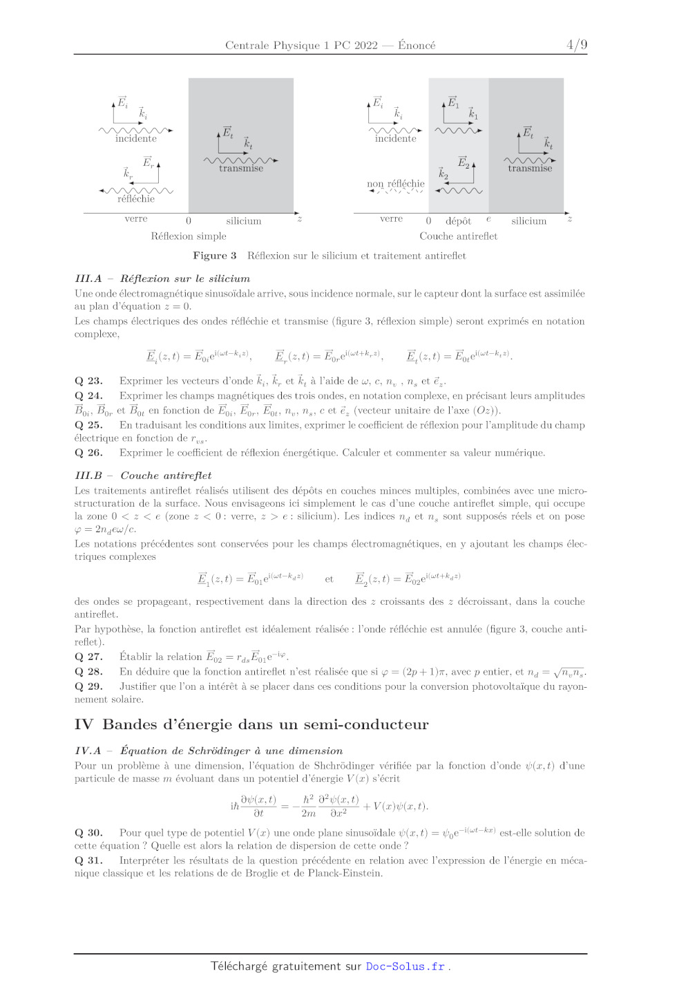 o(x) = A,e Pt + Bei si (2n -- la < x < 2na o(x) = Che it + D eift si 2na < x < (2n + 1j)a Q 40. En rappelant les conditions aux limites vérifiées par la fonction d'onde pour une particule évoluant dans un potentiel fini, justifier le système homogène suivant : À, +B, _C, _D, 0 A, je a + B,,,e"° in Ce i#a _ D, ei -- ( kA,. kB, -- KC, +KD, =0 kA, je 0 kB, et -- KC,e #0 + KD, ea = 0 P004/2022-04-28 08:11:31 Page 5/6 (cc) BY-NC-SA Les solutions obtenues sont physiquement acceptables lorsque l'une des relations suivantes, où à = K/k, est vérifiée : a) --1< F,(ka) = cos(ka) cos(aka) -- : (a + 2) sin(ka) sin(aka) < +1 : a b) --1< F, (ka) = cos(ka) cos(aka) -- : (a + 2) sin(ka) sin(ka) < +1 ; a c) --1< FE, (ka) = cos(ka) cos(aka) -- : (a + 2) sin(ka) sin(aka) < +1. Q 41. En analysant l'effet sur le système d'une translation de a, indiquer, sans calcul, l'expression correcte de F, (ka). Les fonctions F,(ka) et E(ka) (unité arbitraire) ont été tracées sur la figure À du document réponse pour a = 0,2. Q 42. Compléter avec soin la figure À du document réponse et expliquer en quoi ce modèle permet de rendre compte de l'existence de bandes d'énergie, soit permises, soit interdites. Q 43. Que deviennent ces résultats lorsque & = 1 ? Justifier votre réponse. Q 44. En prenant pour valeur le paramètre de maille du silicium 2a = 0,54 nm, calculer dans ce modèle et pour & = 0,2 la largeur en énergie de la première bande d'énergie interdite. Q 45. On sait que pour le silicium, la largeur de bande interdite est de l'ordre de 1 eV. Commenter. ee oerFINeee P004/2022-04-28 08:11:31 Page 6/6 (cc) BY-NC-SA OFAO Numéro de place DE Numéro d'inscription Signature , (, Nom 5 « Prénom CONCOURS CENTRALE-SUPÉLEC Épr euve : Physique | PC Ne rien porter sur cette feuille avant d'avoir complètement rempli l'entête Feuille / Question 42 F, (ka) SU 60 40 20 0 2 À 6 8 10 ka Figure À Fonction F,(ka) et énergie E(ka) (unité arbitraire) tracés pour a = 0,2 Ne rien écrire luametatex 2.0932 20211203 LMTX dans la partie barrée P004-DR/2022-03-14 15:05:12 Extrait du tableau périodique des éléments Hydrogène | -- Nom de l'élément Hélium 1 <-- Numéro atomique 2 H <-- Symbole chimique He 1,0080 |<-- Masse molaire atomique 4,0026 Lithium Béryllium Bore Carbone Azote Oxygène Fluor Néon 3 4 5 6 7 8 9 10 Li Be B C N O F Ne 6,9395 9,0122 10,814 12,011 14,007 15,999 18,998 20,180 Sodium Magnésium Aluminium | Silicium Phosphore Soufre Chlore Argon 11 12 13 14 15 16 17 18 Na Mg Al Si P S CI Ar 22,990 24,306 26,982 28,085 30,974 32,068 39,452 39,948 Potassium Calcium Scandium Titane Vanadium Chrome Manganèse Fer Cobalt Nickel Cuivre Zinc Gallium |Germanium|| Arsenic Sélénium Brome Krypton 19 20 21 22 23 24 25 26 27 28 29 30 31 32 33 34 35 36 K Ca Sc Ti V Cr Mn Fe Co Ni Cu Zn Ga Ge As Se Br Kr 39,098 | 40,078 | 44956 | 47,867 | 50,941 | 51,996 | 54938 | 55,845 | 58933 | 58,693 | 63,546 | 65,38 | 69,723 | 72,630 | 74921 | 78,971 | 79,904 | 83,798 Rubidium || Strontium Yttrium Zirconium Niobium || Molybdène | Technétium || Ruthénium | Rhodium | Palladium Argent Cadmium Indium Étain Antimoine Tellure Iode Xénon 37 38 39 40 A1 42 43 44 45 46 A7 48 49 50 51 52 53 54 Rb Sr Y Zr Nb Mo Tc Ru Rh Pd Ag Cd In Sn Sb Te I Xe 85,467 87,62 88,906 91,224 92,906 95,95 [98] 101,07 102,91 106,42 107,87 112,41 114,82 118,71 121,76 127,60 126,90 131,29 Césium Baryum Hafnium Tantale Tungstène || Rhénium Osmium Iridium Platine Or Mercure Thallium Plomb Bismuth Polonium Astate Radon 55 56 72 73 74 75 76 77 78 79 80 81 82 83 84 85 86 Cs Ba Hf Ta W Re Os Ir Pt Au Hg T1 Pb Bi Po At Rn 132,91 137,33 178,49 | 180,948 | 183,84 186,21 190,23 192,22 195,08 196,97 200,59 204,38 207,2 208,98 [209] [210] [222] Constantes physiques Célérité de la lumière dans le vide Masse de l'électron Charge élémentaire Permittivité diélectrique du vide Constante d'Avogadro Constante de Boltzmann Constante de Planck Données et formulaire c = 3.00 x 10° ms ! m = 9,11 x 10 °1 kg e = 1.62 x 10 1 C En = 8,85 x 10 12 F:m ! N 1 = 6,02 x 10° mol | kh = 1,38 x 10 JK | h = 6,63 x 10 *% J:s Données sur le silicium (à 20 °C) Structure électronique Masse molaire Masse volumique Mobilité des électrons Mobilité des trous Conductivité intrinsèque Formulaire Soient (ü,,ü,, ------ rot(A) = Oy OZ [Ne]3s23p° M = 28,1 gmol | p = 2,33 x 10% kg-m * | = 1,5 x 107! m2.V-ts"l a, = 4,5 X 10 *m°.V ls! 7 = 4,3 x 10 S:m ! ü,) un repère orthonormé direct et A = Al + AU, + A,üù, un champ vectoriel _ DA div(4) = Ar 4 Eu 4 dE Ox y. Oz 04, ÔA4,\. [dA, DA\. 04, OA,)\. (Re (nn) 02 Or Ôx Ôy
