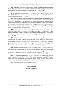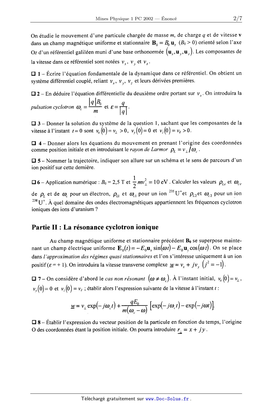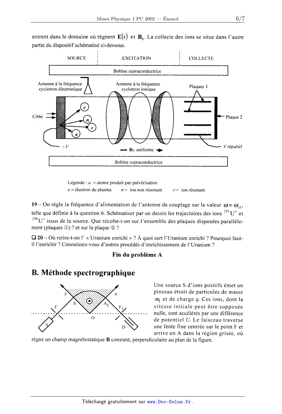 Cl 20 -- Où retire--t--on l' << Uranium enrichi » ? A quoi sert l'Uranium enrichi ? Pourquoi faut-- il l'enrichir '? Connaissez--vous d'autres procédés d'enrichissement de l'Uranium '? Fin du problème A B. Méthode spectrographique Une source S d'ions positifs émet un pinceau étroit de particules de masse m] et de charge q. Ces ions, dont la vitesse initiale peut être supposée nulle, sont accélérés par une différence de potentiel U. Le faisceau traverse une fente fine centrée sur le point P et arrive en A dans la région grisée, où règne un champ magnétostatique B constant, perpendiculaire au plan de la figure. Page 6/7 Physique 1 -- Filière PC -- 2002 Cl 21 ---- La vitesse v des ions à l'entrée dans la zone de champ B est supposée être dans le plan de la figure, et perpendiculaire à Oy. Déterminer la nature de la trajectoire dans cette zone, exprimer son rayon de courbure R en fonction de ml, q, U et B : "B". E] 22 ---- Applications numériques : q =1,60><10--l9 C, m' =3,90><10--25 kg et U = 50 kV. Déterminer la vitesse des ions à l'entrée dans la zone de champ B. Déterminer le champ nécessaire pour que R = 50 cm. Cl 23 -- Les ions ne sont soumis au champ B que dans une région limitée par deux plans perpendiculaires dont les traces sont Ox et Oy et dont la bissectrice extérieure est OF. On centre en F], symétrique de F par rapport à 0, une fente perpendiculaire au faisceau. Montrer que les ions traversant la première fente avec une vitesse v de même module qu'à la question 21 (pinceau homocinétique) et de direction faisant un angle 8 petit avec FA dans le plan de la figure viennent converger, après traversée de la région grisée, en un point (131 que l'on pré-- cisera. Un argument simple de symétrie suffira. Cl 24---- Que se passe-t-il pour un pinceau homocinétique issu de F, dont le vecteur vitesse fait un petit angle 8', cette fois-ci avec le plan de la figure '? Quelle longueur 6, per- pendiculairement au plan de la figure, doit-on donner à la fente centrée en F. pour récolter tous les ions émis de part et d'autre du plan de la figure '? Application numérique: eg... =10" rad. Cl 25 -- Le faisceau émis par la source est maintenant un mélange d'isotopes de masses respectives ml et m2 : m1 + Am, avec 0 < Am << ml. On ne change pas les réglages du spectrographe et les ions de masse mz convergent au point (Dz. Déterminer la distance (p : (I),sz entre les pinceaux d'ions de masses ml et m2 lorsqu'ils traversent le plan de la fente centrée en F1. Le résultat sera finalement exprimé en fonction de R, Am et m]. Cl 26 -- Quelle largeur maximale 3 (3 << R) peut-on donner à la fente centrée en F pour obtenir une séparation effective des deux isotopes au niveau de la fente, de largeur (p, . . . Am 3 centrée en F1 ? Appl1catron numérique : calculer s pour R = 50 cm et -- = ---- ml 235. CI 27 -- L'intensité du faisceau est [ = 5 mA. La source est alimentée en Uranium 235 238 . , ,. naturel contenant 0,7 % de U+et 99,3 % U'. Quelle quantite de l isotope 235 U+ pour- rait-on isoler ici en une année de fonctionnement continu '? Quels avantages et quels incon-- vénients voyez-vous à ce dispositif de séparation des isotopes de l'uranium ? El28 -- Dans la question 25. de quels réglages s'agit-il '? Fin de la partie B FIN DE L'ÉPREUVE Page 7/7