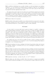 mesurée à 1,12 >< 10_3 N. La force exercée sur la sonde spatiale, d'une masse totale de 315 kg, a permis d'augmenter la vitesse d'une dizaine de mètres par seconde au bout d'un mois (source : Wikipedia). Montrer que ces résultats expérimentaux sont compatibles entre eux d'une part, et avec les résultats théoriques obtenus plus haut, d'autre part. II. Satellite en orbite héliocentrique II.1 Soit un satellite en orbite circulaire autour du Soleil, à une distance 7" de celui--ci. Exprimer sa vitesse en fonction de r, de la masse du Soleil M@ et de la constante gravitationnelle G. Dans la suite de cette partie, on étudie l'effet de la pression de rayonnement sur un satellite de masse m possédant une voile solaire de surface S , éclairée tout d'abord sous incidence normale. On supposera que les résultats de la partie I restent valables si la voile est en mouvement. II.2 On note D la distance Terre--Soleil et P0 la pression de rayonnement au niveau de l'orbite de la Terre, déterminée à la question 1.11. Exprimer la force exercée sur cette voile par la pression de rayonnement en fonction de S , Pg, D et 7". 11.3 Déterminer pour quelle valeur oc de la masse surfacique o = m / S l'attraction solaire com-- pense exactement la pression de rayonnement sous incidence normale. Exprimer oc en fonction de P0, D et de la vitesse @@ de la Terre autour du Soleil. II.4 Application numérique : on donne @@ = 30 km/ s. Calculer numériquement oc. Pour quelle épaisseur d'une voile faite dans un matériau ordinaire cette valeur est--elle atteinte ? II.5 Montrer que la résultante de la force gravitationnelle et de la force de rayonnement dérive d'une énergie potentielle dont on donnera l'expression en fonction de G, m, M@, o, Je et 7". Quelles sont les trajectoires possibles dans les cas 0 > ac, 0 = Je et 0 < oc ? 11.6 Le satellite est initialement sous l'effet de l'attraction gravitationnelle seule et en orbite circulaire de rayon 7" autour du Soleil. Il déploie sa voile de surface S a un instant %. Déterminer son énergie mécanique pour t > 150 en fonction de G, m, M@, o, Je et 7". En