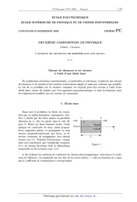 donne oz... : 2 >< 103 m_1, _ 1+I/IO Ï0= 10 mW. Calculer [ en régime permanent et la puissance de sortie 18 du faisceau laser par l'une des faces. II - Principe des mesures de position et de vitesse d'un obstacle Dans cette partie, on étudie qualitativement l'effet sur le fonctionnement d'une diode laser de l'onde émise puis réfléchie (ou rétrodiffusée) par un obstacle extérieur et revenant dans la cavité, puis le principe de son utilisation aux mesures de position et de vitesse d'un obstacle. Le dispositif est modélisé selon le schéma de la figure 2; soit ,a réel positif le coefficient de réflexion en amplitude sur l'obstacle, qui avec la face 2 forme une cavité de longueur D. On supposera p << 1. On désigne par 1/p la fréquence d'oscillation de la diode laser en l'absence d'obstacle. F igure 2 1. Justifier sans calcul que, lorsque l'onde, sortant de la face 2, y revient en phase après un aller et retour, le coefficient d'amplification du milieu est diminué, et que la puissance du faisceau laser est alors maximale. Justifier de même que la puissance du faisceau est minimale si l'onde revient en opposition de phase. L'indice n du milieu dépend du courant d'alimentation de la diode; en faisant varier ce courant, on modifie la fréquence de fonctionnement up; on supposera dans toute cette partie II. que cette fréquence est imposée par le contrôle du courant d'alimentation. 2. Par une rampe de courant, on réalise une croissance monotone de V,, a yp + AV,, ; l'obstacle est fixe. On observe que la puissance émise passe par une succession de maximums. a) Quelle est la différence de fréquence 5V entre deux maximums consécutifs ? b) Déterminer la relation entre le nombre N D de maximums détectés, Ayp,c et la distance D. c) Pour Ayp = 50 GHz, exprimer D en fonction de N D; quelle incertitude sur la mesure de D a--t--on par ce comptage ? 3. On suppose maintenant la fréquence yp fixe et l'obstacle mobile avec la vitesse @ telle que D(t) : D0 + vt. Durant l'intervalle de temps At, on détecte NU maximums de puissance laser. En utilisant les résultats précédents (2.a)), déterminer la relation entre @, At, Up, (: et N,, en supposant la vitesse constante durant At. Pour At = 20 ms, quelle est la résolution de la détermination de la vitesse à partir de N,, ? 4. L'obstacle étant animé de la vitesse @, on impose au courant de commande de la diode une loi de variation << triangulaire >> de durée totale T; la variation de la