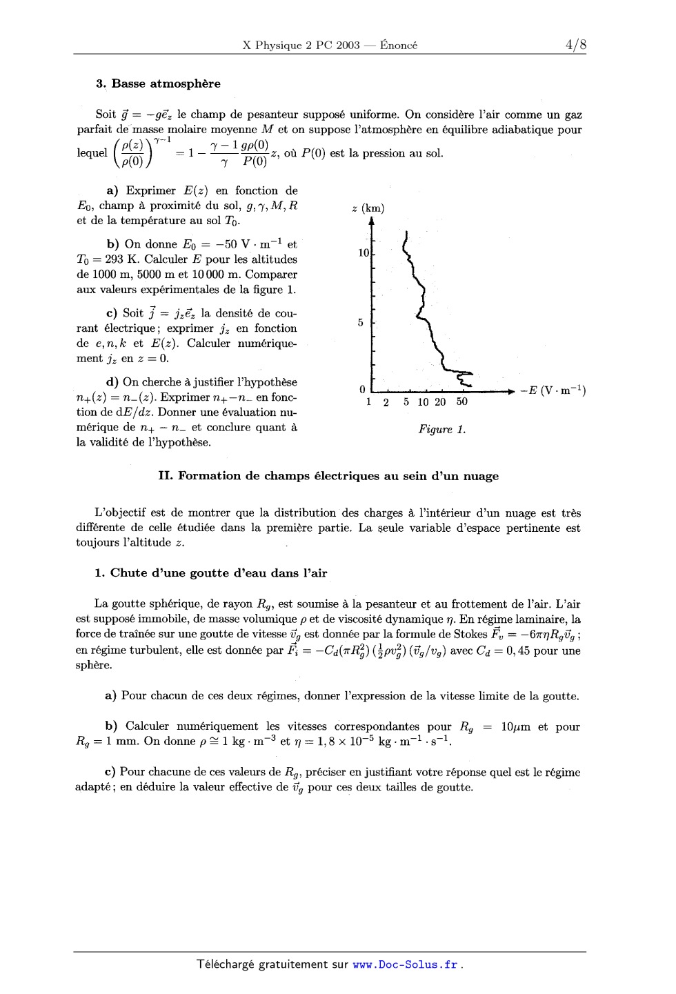 ÉCOLE POLYTECHNIQUE * ÉCOLE SUPÉRIEURE DE PHYSIQUE ET DE CHIMIE INDUSTRIELLES CONCOURS D'ADMISSION 2003 * ' FILIÈRE PC DEUXIÈME COMPOSITION DE PHYSIQUE (Durée : 4 heures) L'utilisation des calculatrices est autorisée pour cette épreuve. *** Charges atmosphériques et orages Les rayons cosmiques ionisent une partie de l'atmosphère. Les ions ainsi produits sont, avec les charges à la surface de la Terre, à l'origine du champ électrique terrestre. Ces ions ne restent pas immobiles et l'objet du problème est d'analyser quelques aspects de leur circulation. Dans tout le problème, on supposera pour simplifier qu'il s'agit d'ions monovalents. Dans la première partie, on aborde le problème de la distribution des ions et de leur mouve- ment par beau temps. Dans la deuæième partie, on effectue l'analyse de quelques processus qui contribuent à créer un champ électrique important dans les cumulo-nimbus. La troisième partie montre que les éclairs jouent un rôle essentiel dans la redistribution des charges atmosphériques. Les réponses auæ questions qualitatives doivent être formulées en deux phrases au mamimum faisant ressortir'clairement les arguments développés. L'étude est locale, sur une zone de faible eoetension (quelques dizaines de kilomètres} ; le seul paramètre pertinent est l'altitude z par rapport à la surface de la Terre. Données numériques Rayon de la Terre RT = 6,4 >< 103 km Champ de pesanteur terrestre g = 9, 8 m - s"2 Masse volumique de l'eau Peau = 1,00 >< 103 kg -- m"3 Mobilité des ions au niveau du sol kg = 1, 5 >< 10'"4= m2 - V"1 --s'1 Champ magnétique terrestre HËTH = 1 >< 10"5 T Masse molaire de l'air M = 29 >< 10"3 kg -- mol"1 _ Constante d'Avogadro -- N A = 6,02 >< 1023 mol"1 Constante des gaz parfaits R = 8, 31 J- K_1 -mol"1 Rapport Cp/CV pour l'air \ 7 = 1,40 Constante de Boltzmann kB = 1, 38 >< 10--23J - K"1 Charge élémentaire e = 1, 60 >< 10--1,9 C Permittivité du vide 50 = 8, 854 >< 10-12 F . m--1 Formulaire En côordonnées sphériques : 13 1 3) m: <Ôr rô9 rsin9ô< 10"16 kg - s"'. Est-il légitime dans ces conditions de négliger l'influence du champ magnétique terrestre ? même question pour la force de pesanteur ? Calculer la distance caractéristique |fü}|T ; justifier le caractère local de la relation entre Ë et 17}. f) La mobilité le des cations est définie par 171-- -- kÊ et celle des anions par 171 : --kË. Déterminer k en f0nction de A et @. L'évaluer numériquement. 2. Densité des ions Soient n+(z) et n_(z) les densités (nombre par unité de volume) respectivement des cations et des anions. Ces ions sont créés dans l'atmosphère par les rayons cosmiques avec un taux d'ionisation (nombre de paires d'ions créés par unité de volume et de temps) q uniforme. On suppose qu'ils se recombinent par paires avec un taux donné par --om+n_, oz constante. On suppose aussi qu'ils sont animés de leur vitesse limite Ü}. Ôn (? n [CE &) Montrer que la densité de cations obéit à l'équation : + + ---(--L----)--- -- q -- om+n_. Ôt Ôz À uelle é uation obéit la densité d'anions ? q q . b) Cations et anions étant formés et se recombinant par paires, on suppose que n+ (z) = n_ (2) : n(z). Quelle est avec cette hypothèse l'équation d'évolution temporelle de n(z) ? Mon-- trer que nkE ne dépend pas de 2. c) On suppose le régime stationnaire atteint avec pour n la valeur no. Donner alors l'ex-- pression de no en fonction de a: et q.V/Les mesures montrent que no ne dépend pratiquement pas de l'altitude; est-ce cohérent avec le résultat obtenu ? Montrer alors que E (z) est proportionnel à. p(z). (1) Donner une évaluation de la durée de vie moyenne 7" d'un ion à l'aide de a et q. e) Application numérique. On donne q = 107 m"3 - s_1, 04 = 1, 4 >< 10_12 m3 --s". Calculer no; calculer T' et comparer sa valeur avec celle de T obtenue en Le). f) En prenant E = --15 V- m'"1 et pour ordre de grandeur de ldE/dzl : 3 >< 10_3 V- m"2, montrer qu'un ion est pratiquement soumis à un champ constant lors de sa durée de vie. 3, Basse atmosphère Soit ÿ' = --gê'z le champ de pesanteur supposé uniforme. On considère l'air comme un gaz parfait de"masse molaire moyenne M et on suppose l'atmosphère en équilibre adiabatique pour 7--1 , -- 1 lequel (ÎËâl)_ -- ---- 7--fy--ïêä; 2, où P(0) est la pression au sol. _ a) Exprimer E(z) en fonction de E0, champ à proximité du sol, 9,7, M, R z (km) et de la température au sol TO. ' b) On donne EO = --50 V- m"1 et T0 = 293 K. Calculer E pour les altitudes de 1000 m, 5000 m et 10 000 m. Comparer aux valeurs expérimentales de la figure 1. c) Soit ; = jzë'Z la densité de cou- rant électrique; exprimer j'z en fonction de e, n, 1»: et E(z). Calculer numérique-- ment jz en z = 0. (1) On cherche à justifier l'hypothèse , _ - ' ' '- ' __ E . --1 ' n+(z) = n__ (z). Exprimer n+----n_ en fonc-- 1' 2 5 10 20 50 (V m tion de dE / dz. Donner une évaluation nu-- mérique de ..., -- n_ et conclure quant a Figure 1_ la validité de l'hypothèse. II. Formation de champs électriques au sein d'un nuage L'objectif estde montrer que la distribution "des charges à l'intérieur d'un nuage est très différente de celle étudiée dans la première partie. La seule variable d'espace pertinente est toujours l'altitude z. 1. Chute d'une goutte d'eau dans l'air La goutte sphérique, de rayon R... est soumise à la pesanteur et au frottement de l'air. L'air est supposé immobile, de masse volumique p et de viscosité dynamique 7]. En régime laminaire, la force de traînée sur une goutte de vitesse ?:}:9 est donnée par la formule de Stokes Ê,= --67T77R9179 , en régime turbulent, elle est donnée par F-- -- --C d(7TR2) (2pvâ ) (fig/vg) avec Cd-- -- 0,45 pour une sphère. a) Pour chacun de ces deux régimes, donner l'exmession de la vitesse limite de la goutte. b) Calculer numériquement les vitesses correspondantes pour R9 = 10um et pour R9 = 1 mm. On donne pë 1 kg-m_3 et 77 = 1,8 >< 1