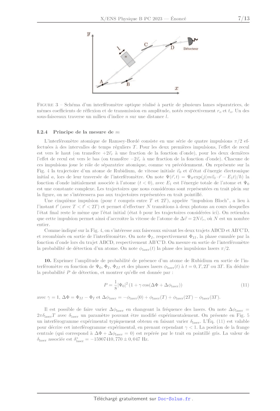 avec n1 et n2 deux entiers (n1 < nm), et R& une constante alors appelée constante de Rydberg. Cette observation marque les débuts de l'avènement de la physique quantique. Niels Bohr propose en 1913 un modèle "semi-classique" permettant d'expliquer ces observations. Il développe un "modèle planétaire" de l'atome d'hydrogène, alors modélisé par un proton de charge +e supposé fixe, et un électron de charge --e et de masse m., non relativiste, soumis à la force électrostatique du proton et en orbite circulaire autour de lui. Niels Bohr fait également l'hypothèse de la quantification du moment cinétique orbital L de l'électron en écrivant L = nh où n est un entier naturel non nul. À chaque valeur de n correspond une orbite différente. 2.a Pourquoi un tel modèle est-il qualifié de semi-classique ? 2.b Exprimer les vitesses v, associées à chaque orbite. Sur quelle orbite la vitesse maximale est- elle atteinte ? Exprimer sa valeur en fonction de c et de à. Est-il alors légitime de considérer que l'électron est non relativiste dans le modèle de Bohr de l'atome d'hydrogène ? 2.c Calculer l'énergie mécanique Æ, de l'électron en fonction de n. Retrouver la formule de Rydberg (Eq. (4)) et en déduire l'expression de R+ en fonction de me, e, h, c et EURo. Si un tel modèle a ses limites, la constante de Rydberg continue d'intervenir dans les modèles théoriques les plus perfectionnés pour décrire les raies d'émission de l'atome d'hydrogène. La mesure précise de ces raies a permis de déterminer Ry avec une précision relative de 2 x 10712. 2R5 a = mo h (5) TTL C Me 3.a Montrer avec m la masse d'un atome de Rubidium. On fait ici intervenir le rapport m./m car il est expérimentalement plus aisé de mesurer indépendamment la masse m de l'atome de Rubidium 87 (beaucoup plus grande que celle d'un électron) et la masse relative de l'électron par rapport à cet atome. Le rapport m/me a pu être mesuré avec une précision relative de 7 x 10711. 3.b On note u(a) l'incertitude-type sur &. Donner la formule reliant l'incertitude relative u(a)/a sur la mesure de « à celle des autres grandeurs Rx, m/m. et m qui interviennent dans son expression d'après l'Eq. (5). Pourquoi aucune incertitude ne doit être associée à la valeur de cet de h? Vérifier que l'on a : u(m) _ = 1,5 x 10710 (6) m Mesurer précisément a revient donc à mesurer précisément m. Dans la suite, nous nous intéressons à la mesure de m par interférométrie atomique. 1.2 Mesure de la masse de l'atome de Rubidium 87 En mécanique quantique, un atome peut être décrit par une fonction d'onde dont l'évolution est donnée par l'équation de Schrôdinger. De même qu'en interférométrie optique un faisceau lumineux est séparé en plusieurs sous-faisceaux, qui sont ensuite recombinés en sortie de l'interféromètre, l'in- terférométrie atomique consiste à "séparer spatialement" et à recombiner la fonction d'onde associée à un atome. Cette séparation de la fonction d'onde peut être effectuée à l'aide de séparatrices atomiques. qui sont des impulsions laser qui tirent profit de l'effet de recul associé à l'absorption ou l'émission d'un photon. 1.2.1 Transitions à un ou à deux photons et effet de recul On considère un atome de Rubidium 87, de masse m. L'énergie mécanique totale de l'atome, notée FE, peut être décomposée en trois parties : l'énergie cinétique et l'énergie potentielle de l'atome, et l'énergie mécanique des électrons (ou énergie électronique). L'énergie mécanique des électrons peut valoir £,, E4 ou E, : on représente les états électroniques de l'atome sur la Fig. 1a. On prendra l'énergie potentielle Æ£,, constante dans ce qui suit, excepté dans la partie 1.2.5. L'état a est l'état fondamental, de durée de vie infinie. La durée de vie de l'état b étant très grande devant celle de l'état c, on la considère également comme infinie. 2 eV E --6 E} [2 x 10% eV E, ; E. (a) (b) FIGURE 1 -- (a) : Niveaux d'énergie de l'atome de Rubidium 87; (b) : Principe de la transition à deux photons Un atome, initialement au repos dans le référentiel d'étude et dans l'état a, absorbe un photon de quantité de mouvement hAk et d'énergie Aw (avec w = kc où k = [[k||), et effectue une transition vers l'état d'énergie E; (à = b ou à = c). 4.a Usuellement, on néglige la variation de quantité de mouvement et la variation d'énergie cinétique lors de la transition (aussi appelée "énergie de recul"). Quelle est alors l'énergie du photon nécessaire pour effectuer la transition ? 4.b On prend en compte l'"effet de recul". Donner les relations de conservation de l'énergie et de la quantité de mouvement lors du processus d'absorption du photon, en notant v, la variation de vitesse de l'atome (appelée "vitesse de recul"). 4.c À l'aide des deux relations précédentes, se ramener à une équation sur k = LE et montrer que k © (FE; --E,)/(hc). En déduire la variation de vitesse v, -- |v,| subie par l'atome lors de la transition. Effectuer l'application numérique pour v,. pour chacune des transitions a -- b et a --c. 4.4 Comme nous le verrons plus loin, on tire profit de l'effet de recul en interférométrie atomique pour séparer la fonction d'onde : plus cet effet est important, mieux on sépare la fonction d'onde et meilleure est la sensibilité sur la mesure. Quels sont l'avantage et l'inconvénient associés à chaque transition (a -- b ou a -- c) pour transférer de la quantité de mouvement à un atome ? Le 'meilleur des deux mondes" peut être obtenu en effectuant des transitions à deux photons (ou transitions "Raman"). Le principe de telles transitions est présenté sur la Figure 1b : l'atome, initialement dans l'état a, est plongé deux faisceaux lasers se propageant en sens opposés. L'atome absorbe un photon du premier laser, et émet un photon par émission stimulée par le deuxième laser. On note k et ko les vecteurs d'ondes 